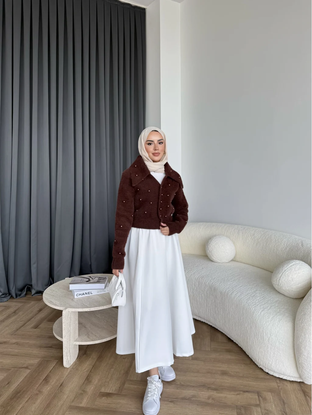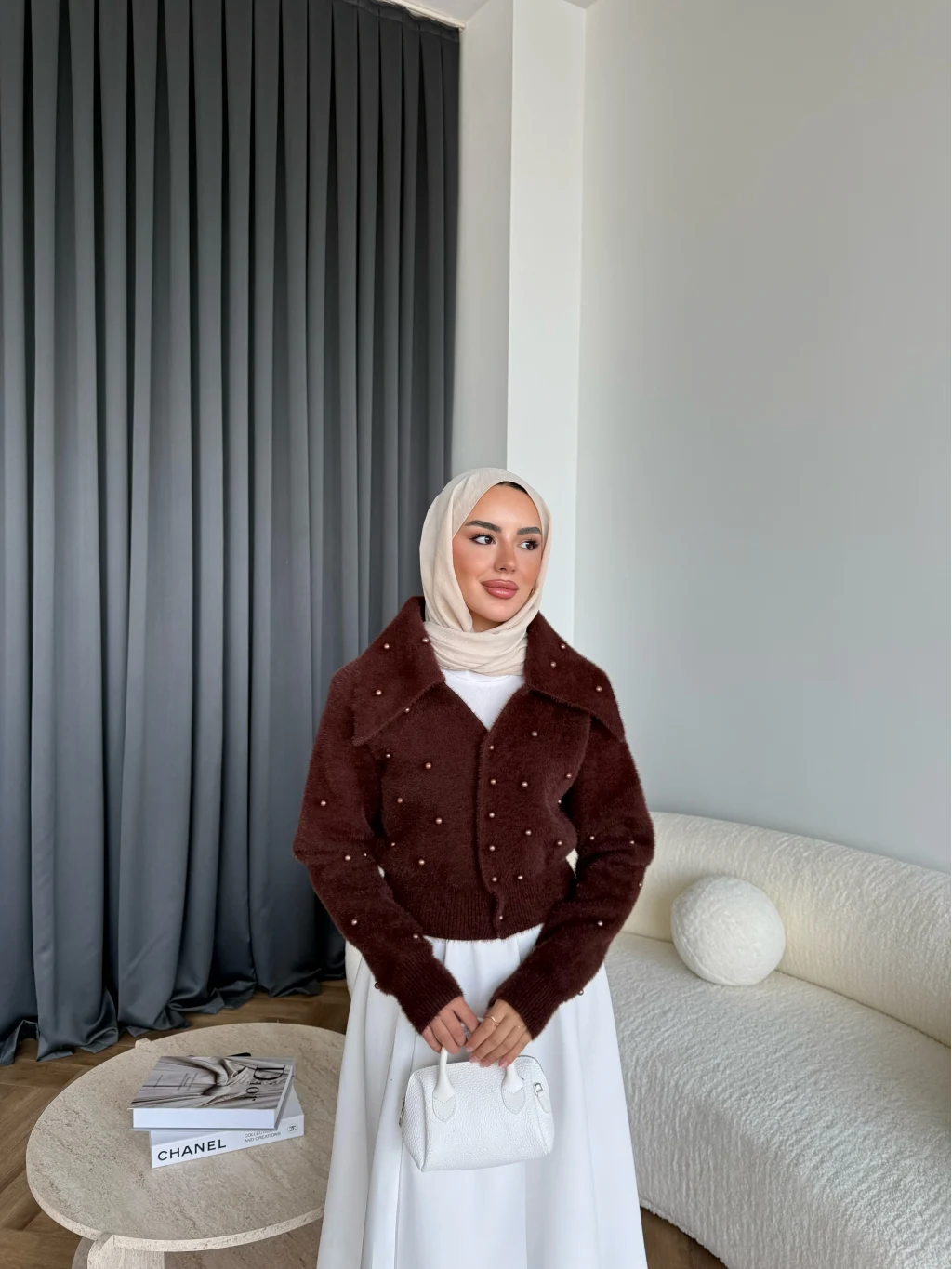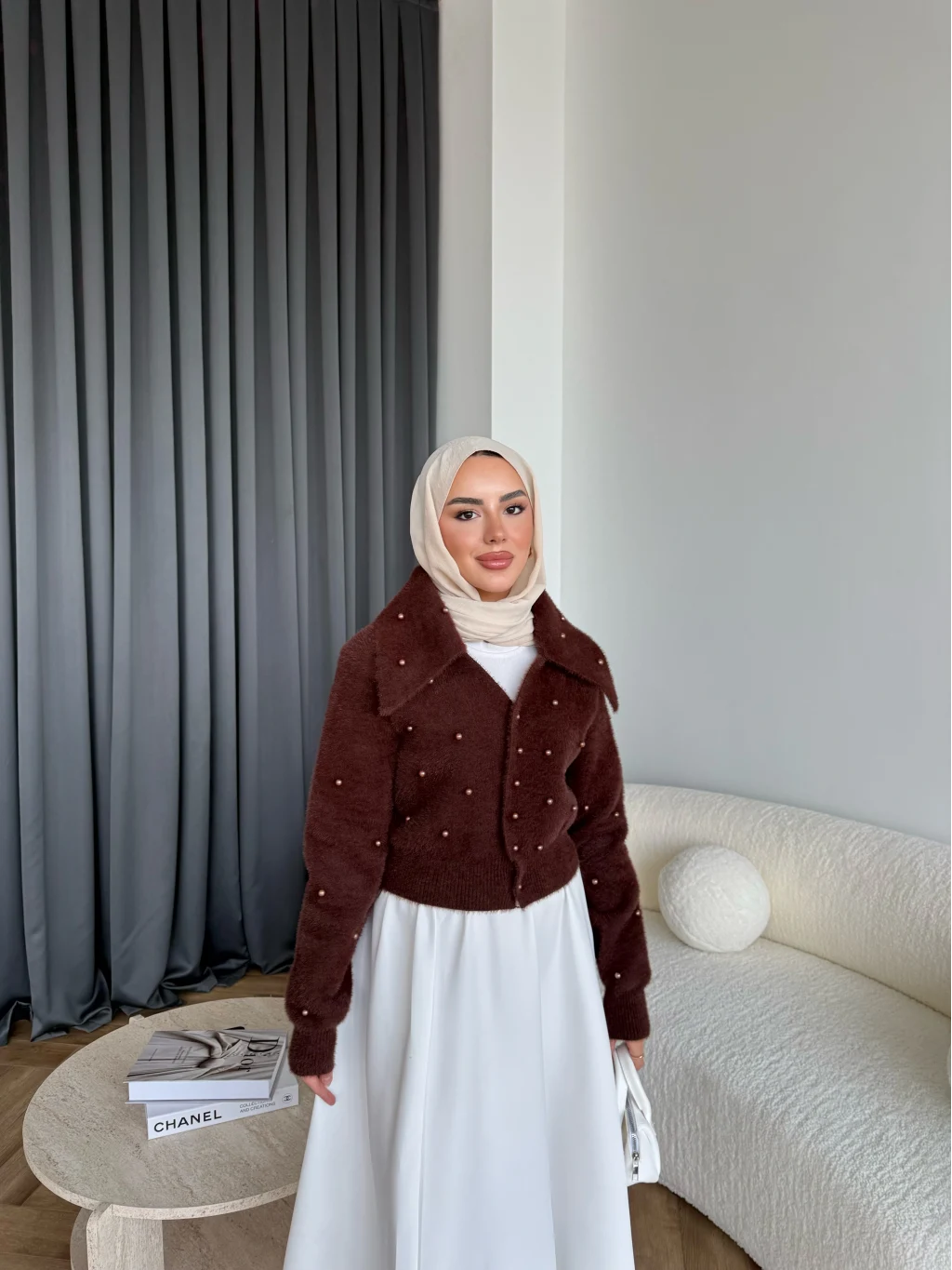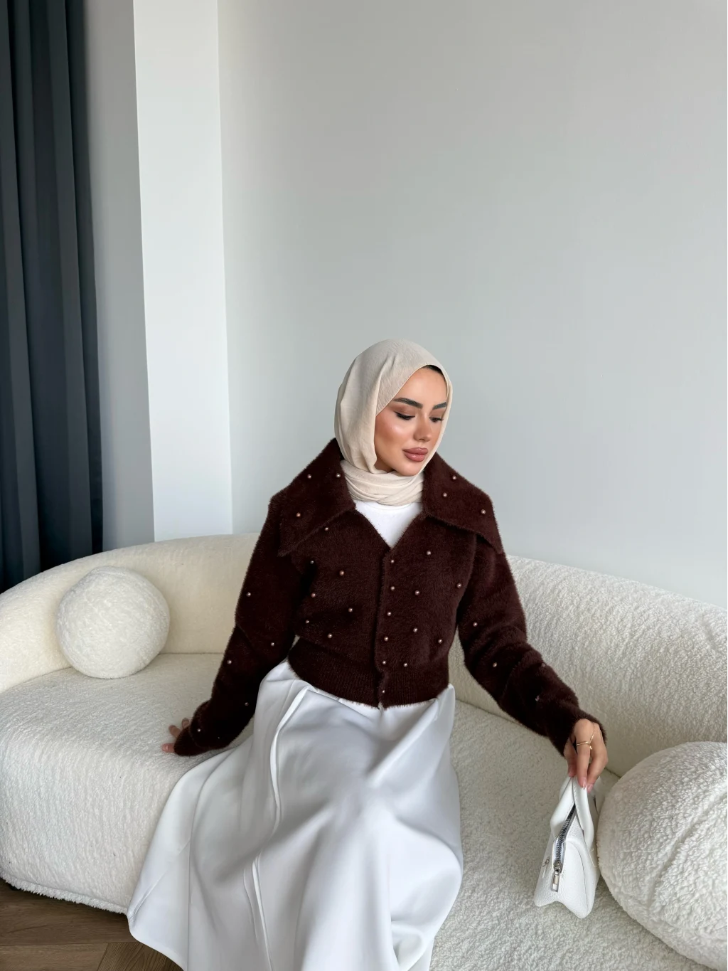 Boncuk Detaylı Mini Hırka - Acı Kahve
