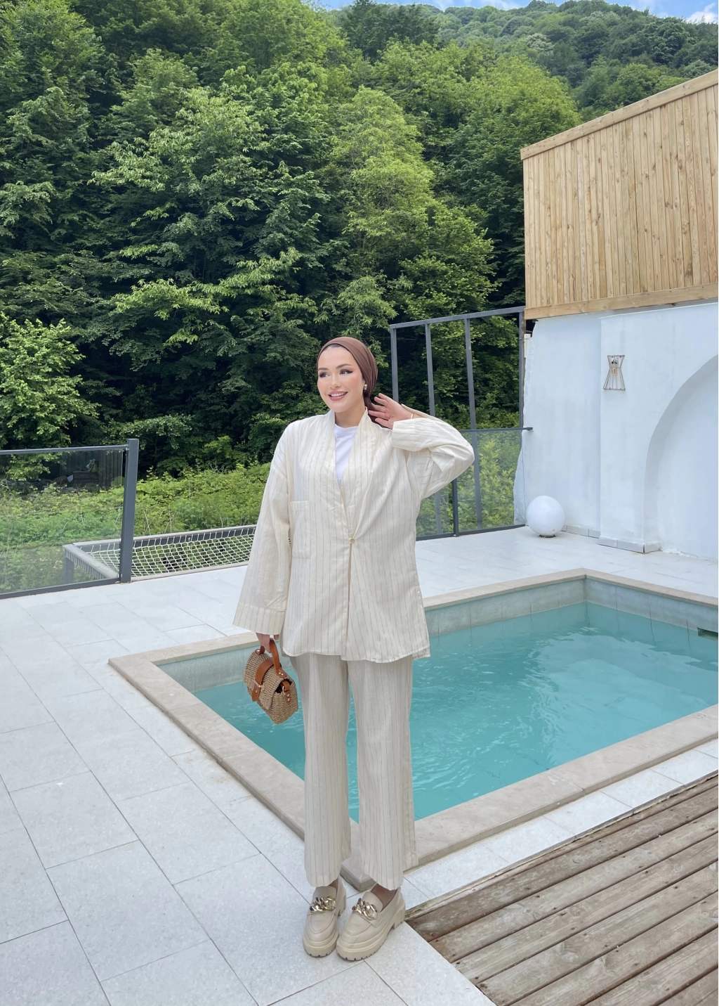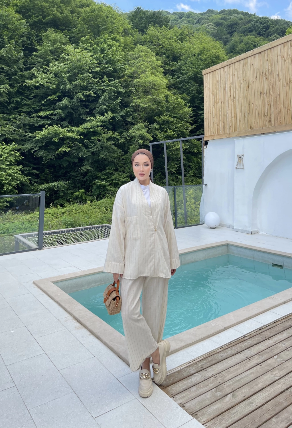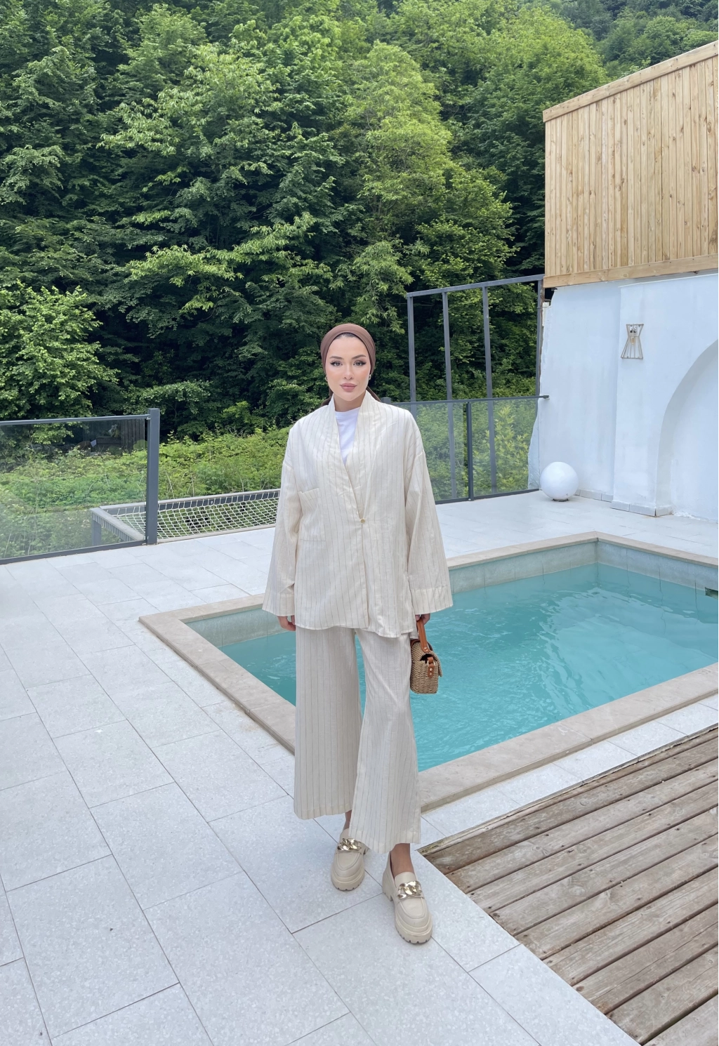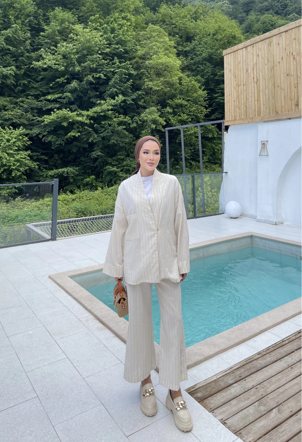 Çizgili Keten Takım - Bej