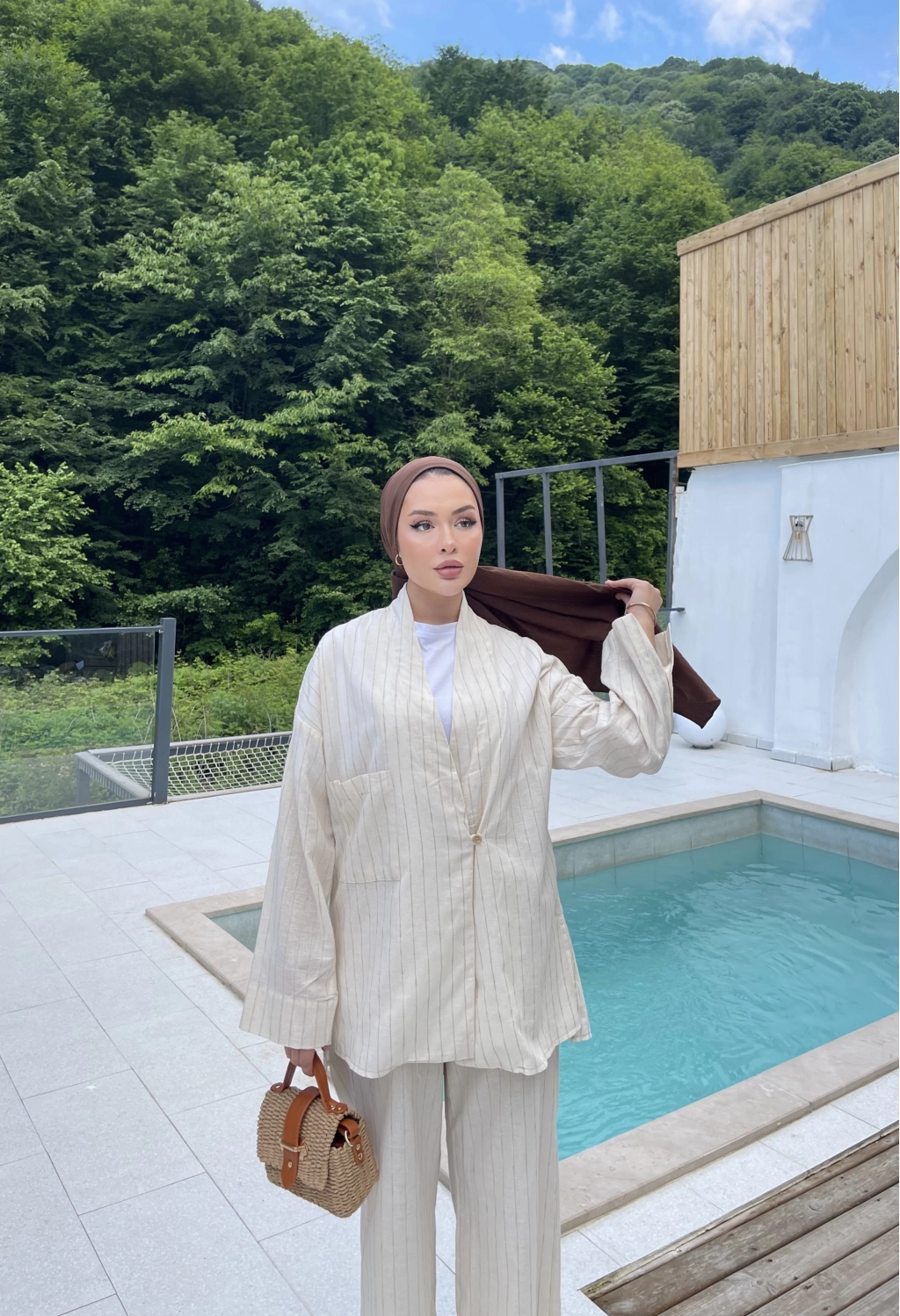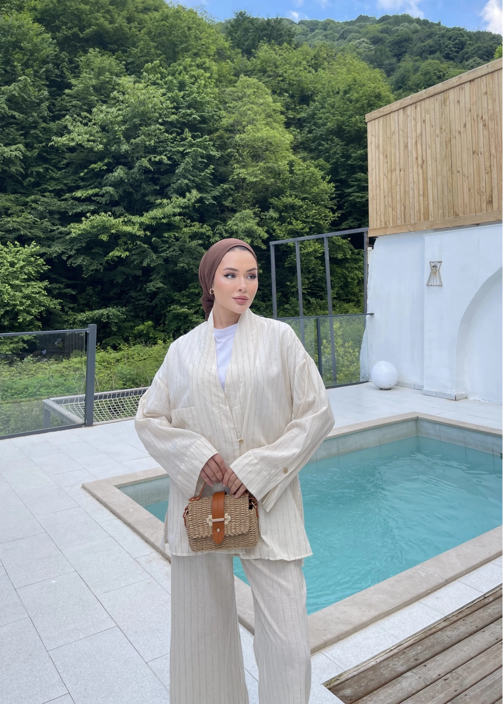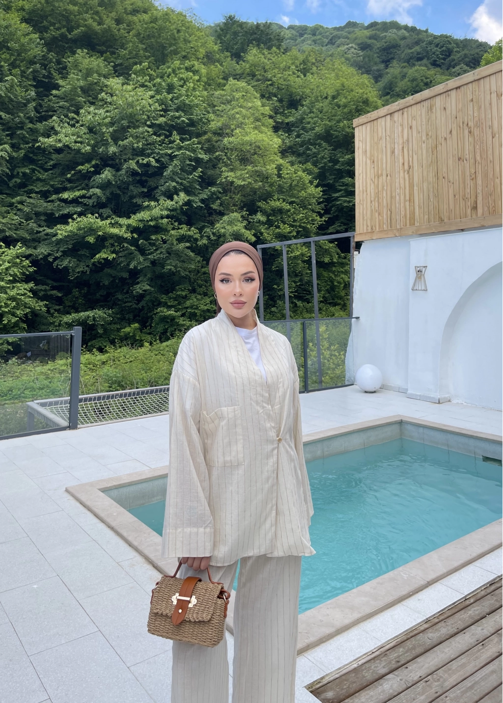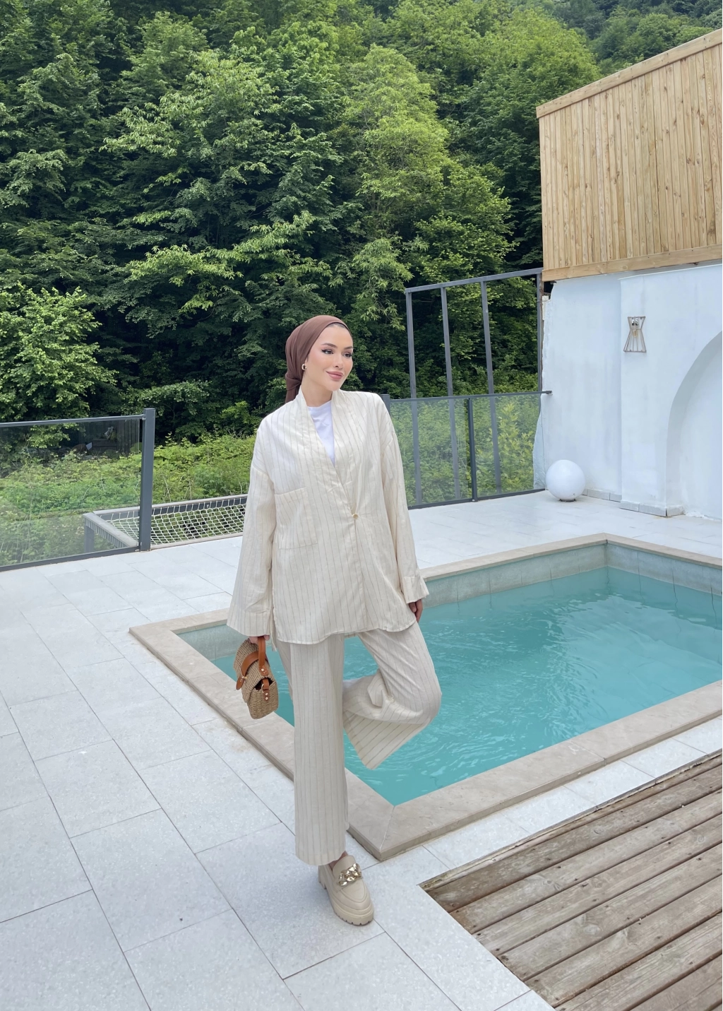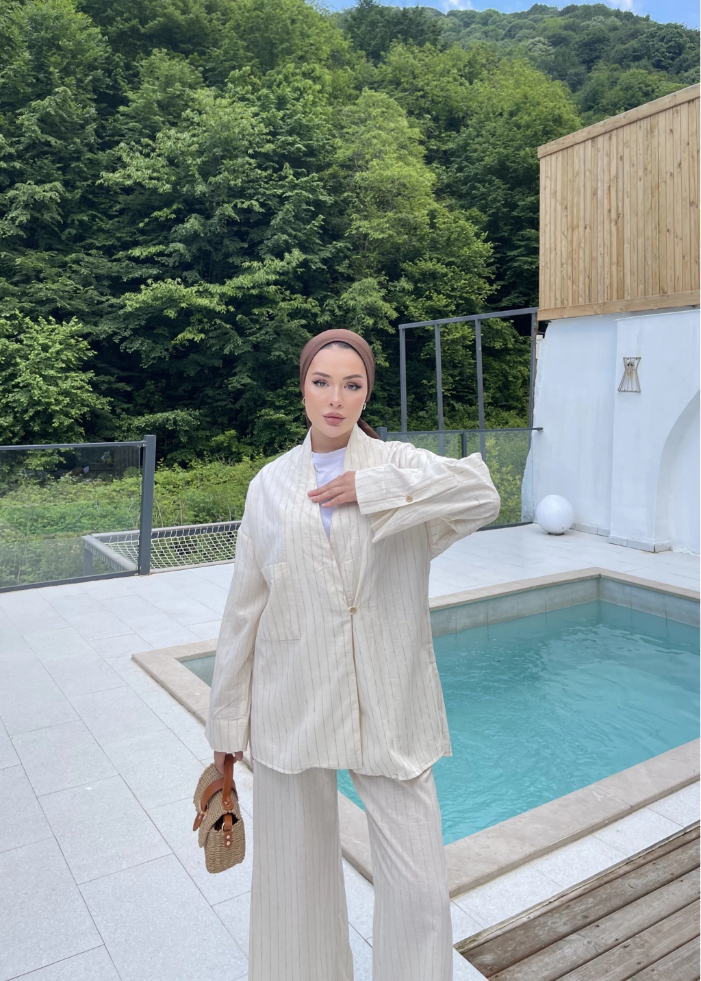 Çizgili Keten Takım - Bej