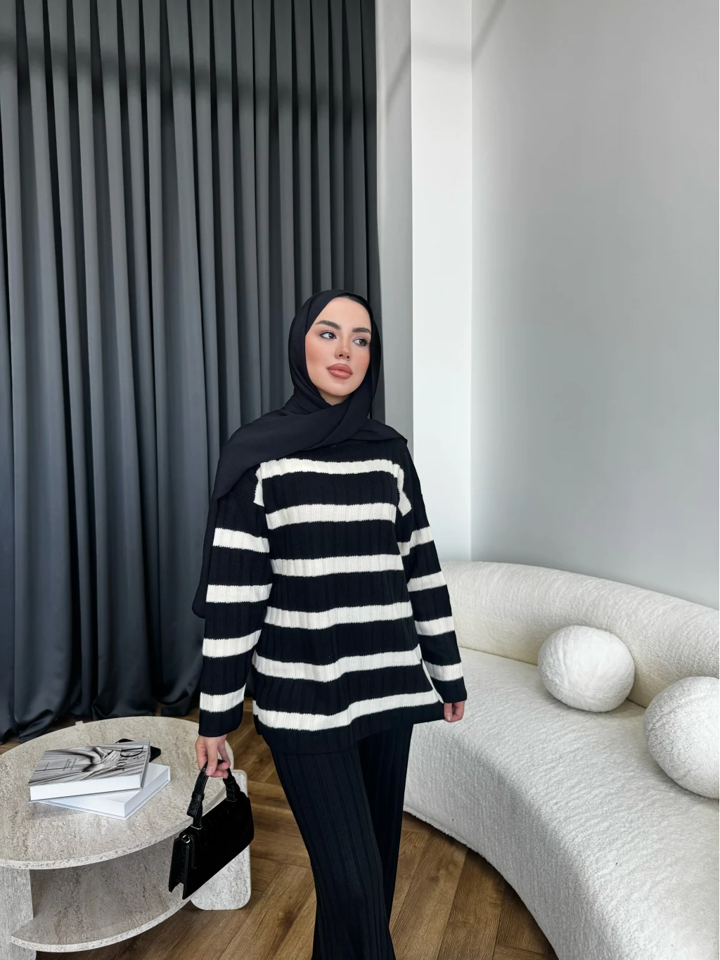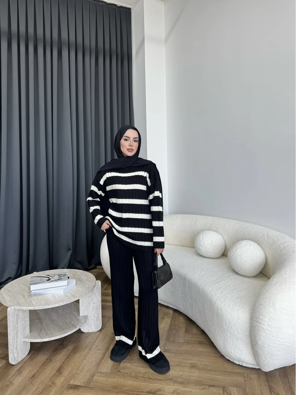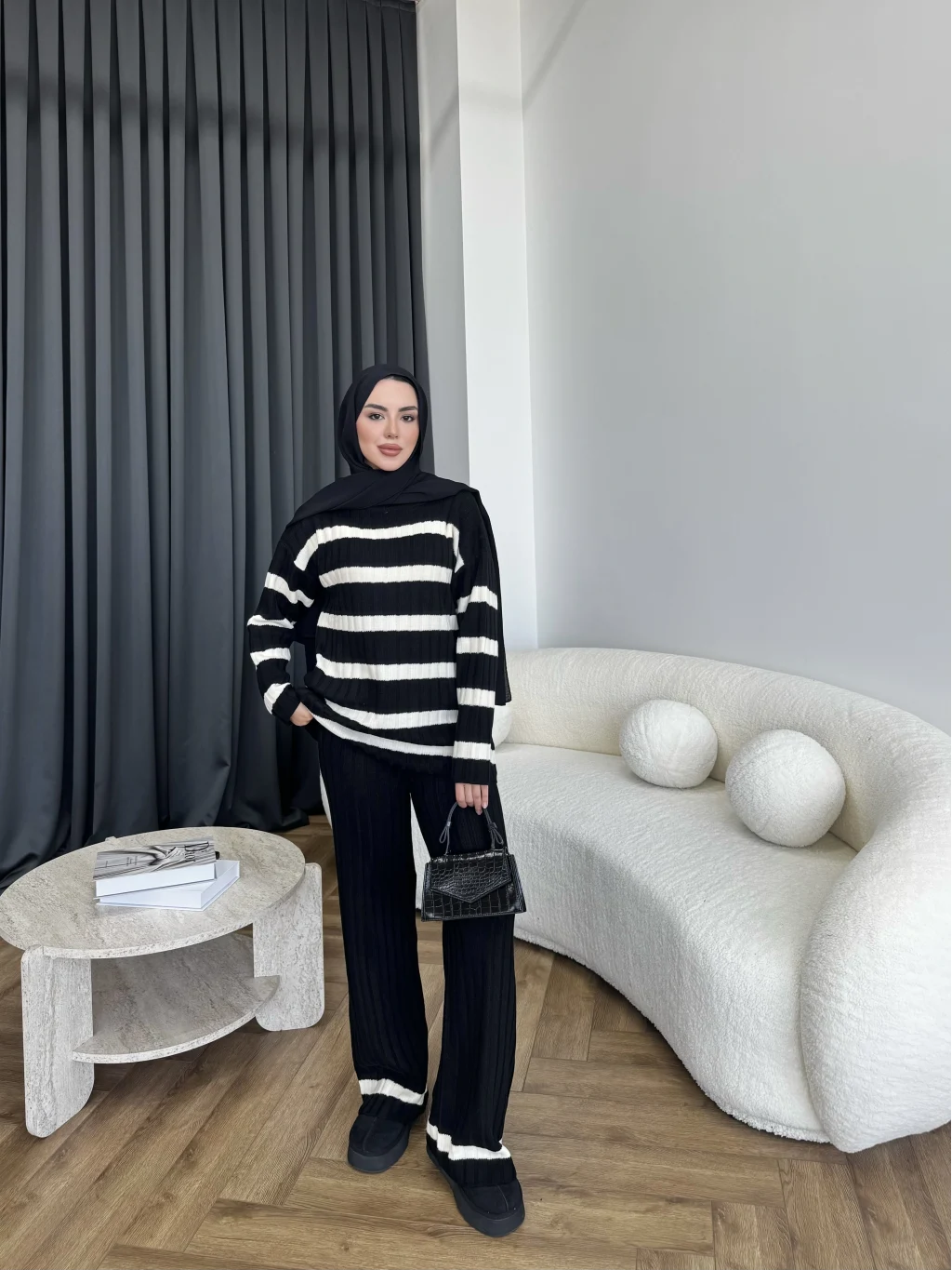 Çizgili Triko Takım - Siyah