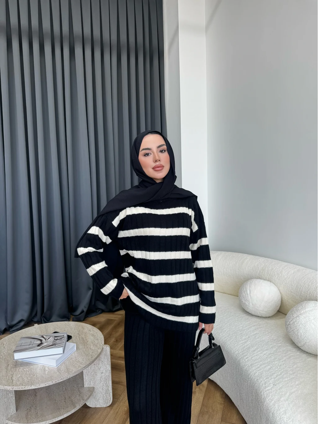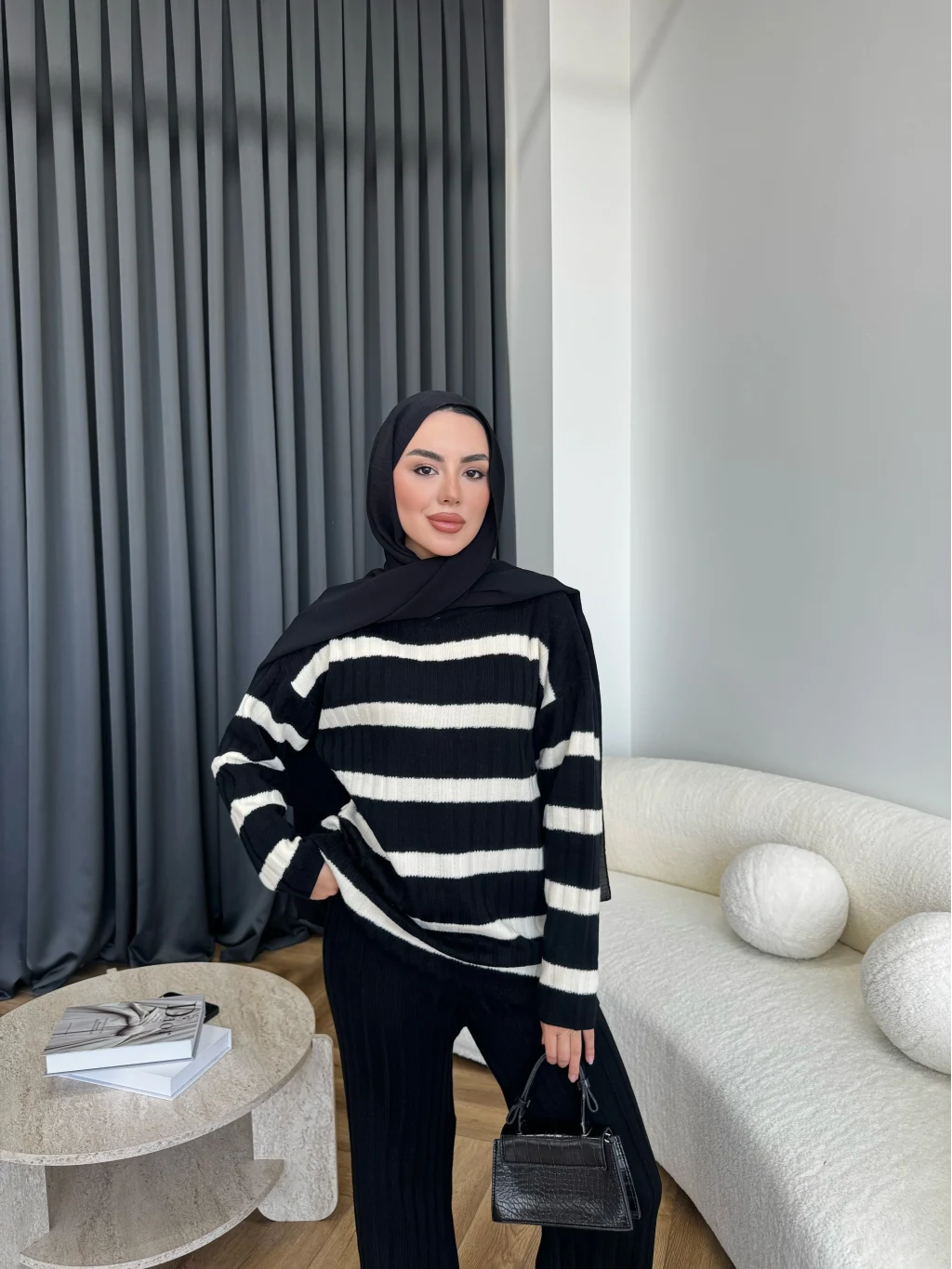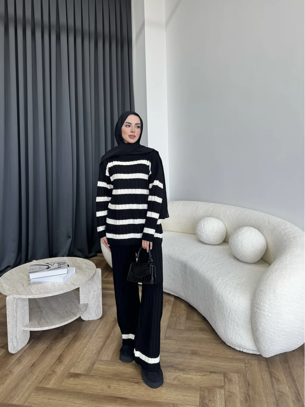 Çizgili Triko Takım - Siyah