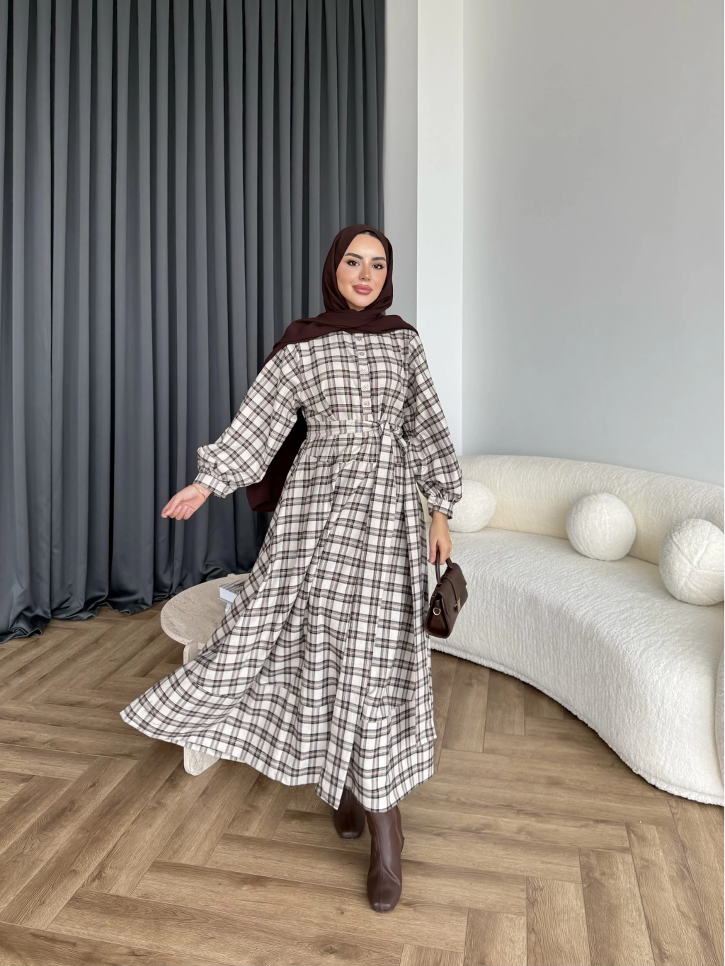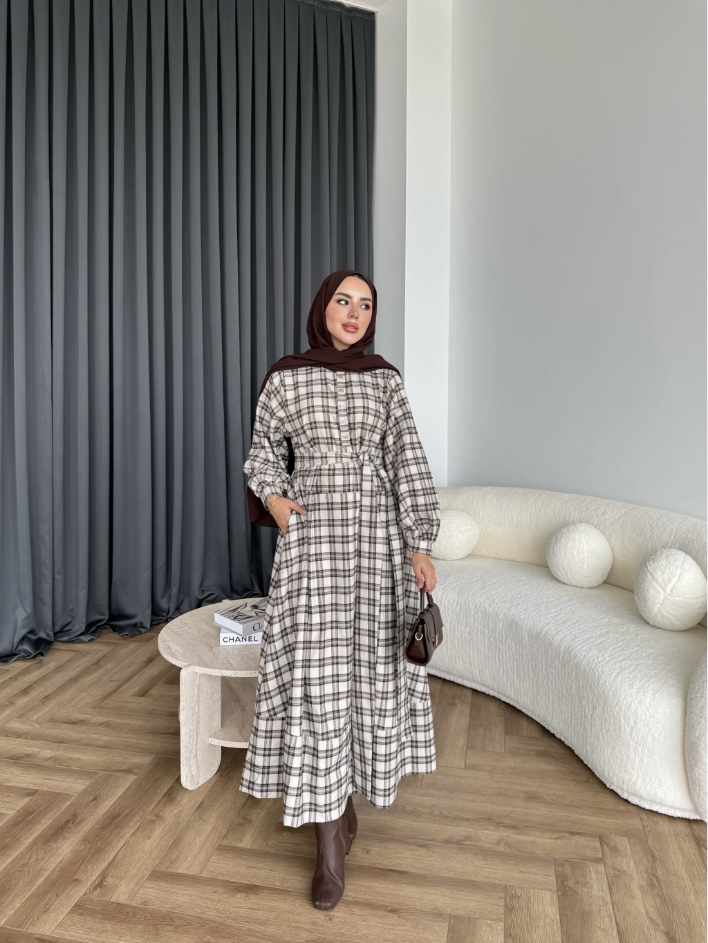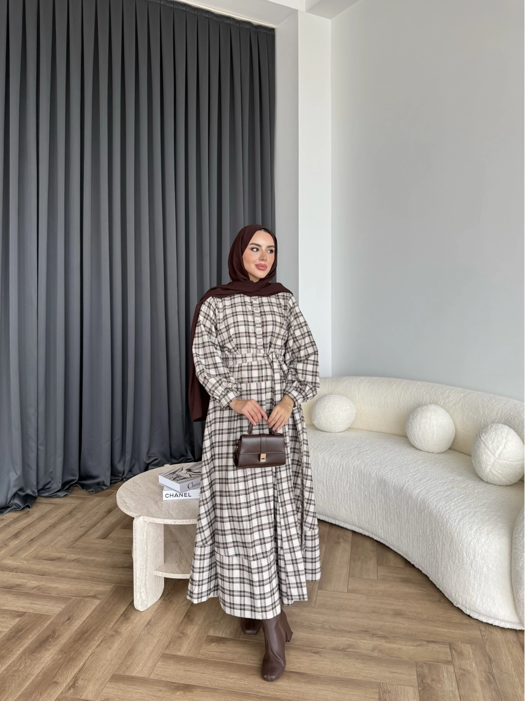 Doria Kareli Elbise - Bej