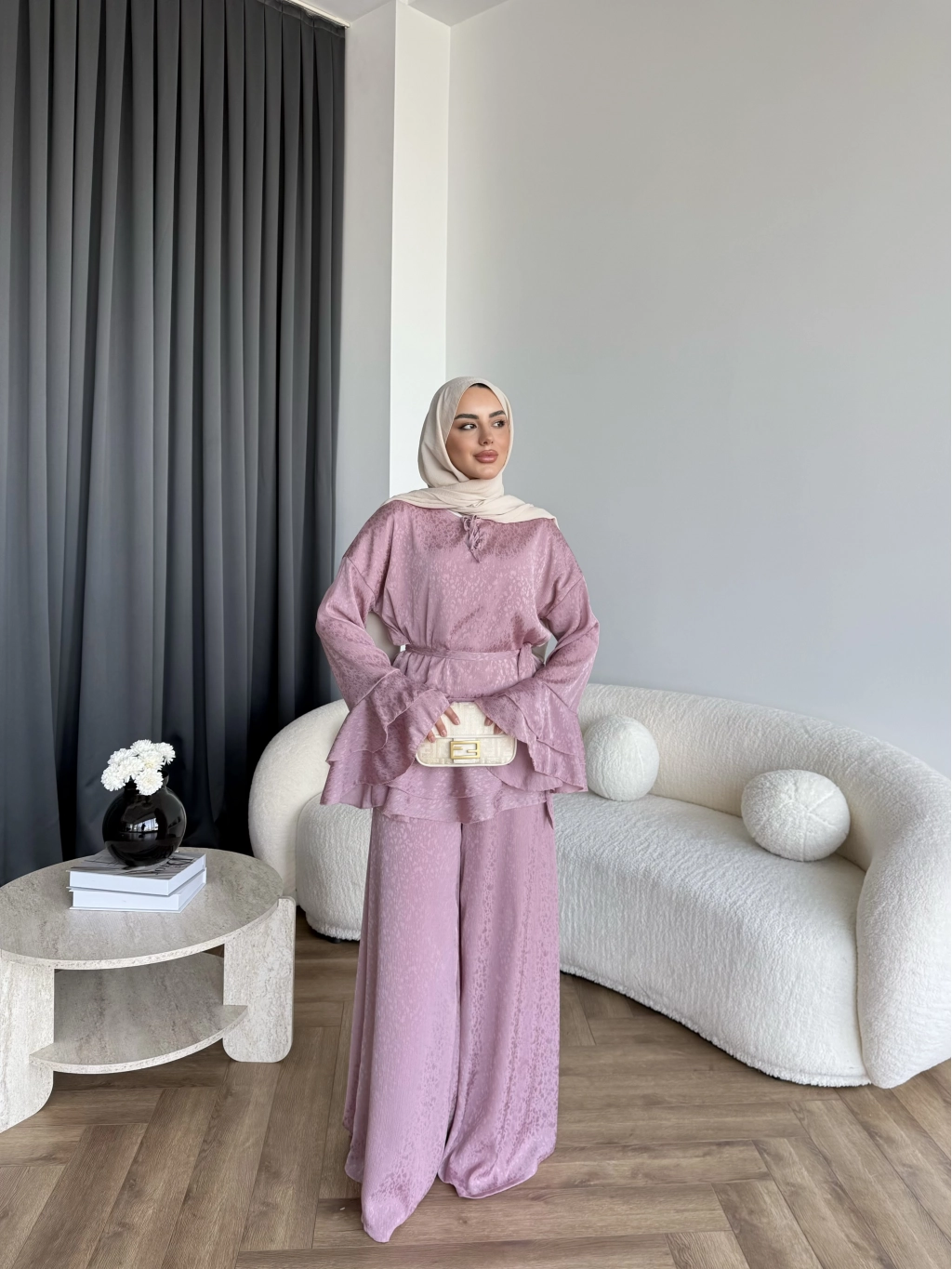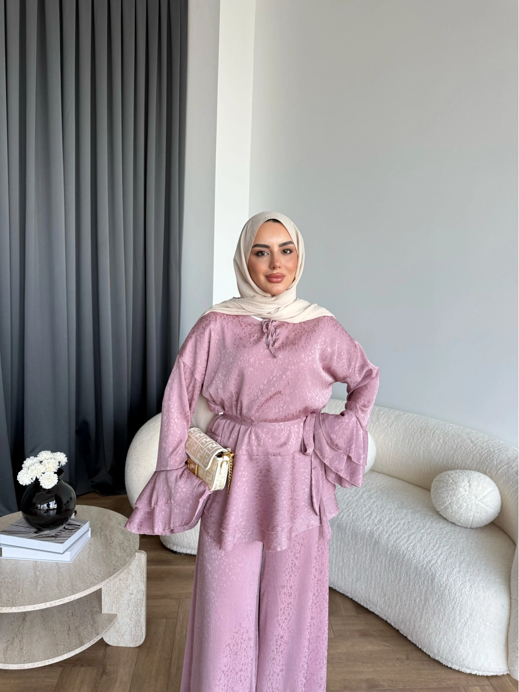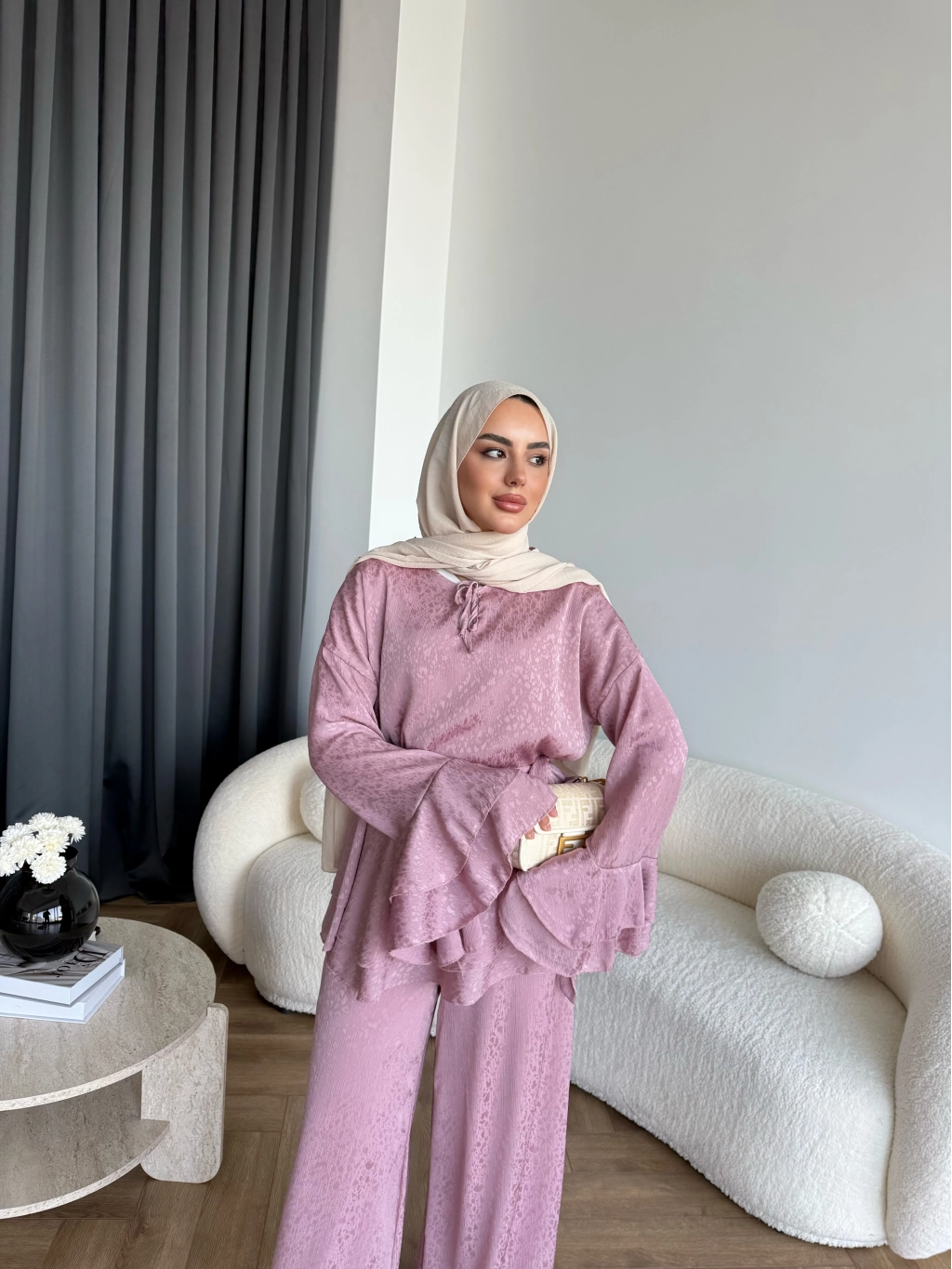 Es - Danlara Saten Kol Fırfırlı Takım - Gül Kurusu