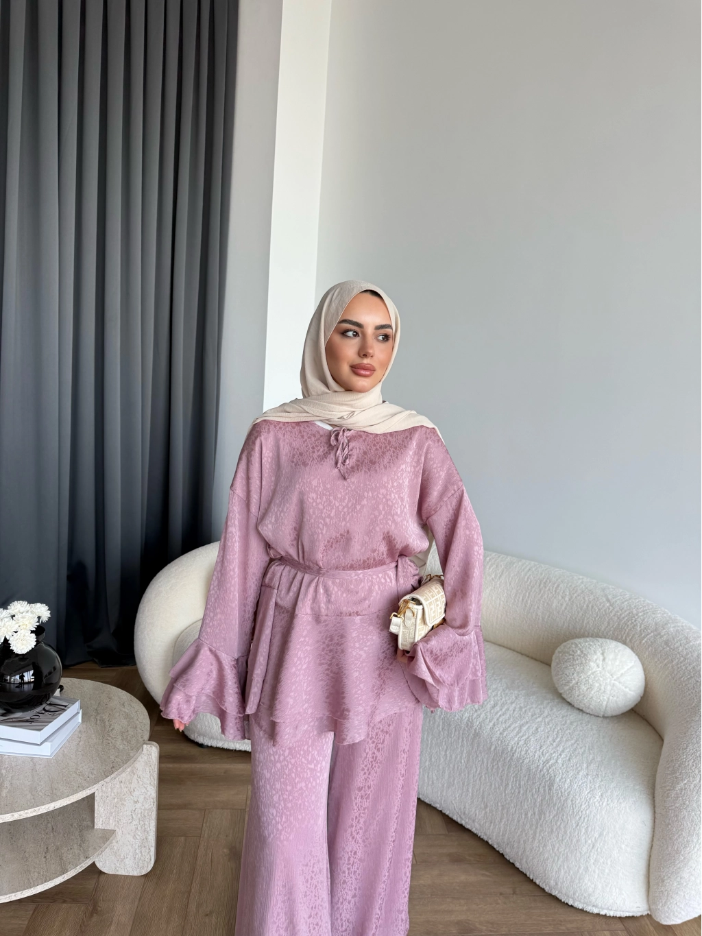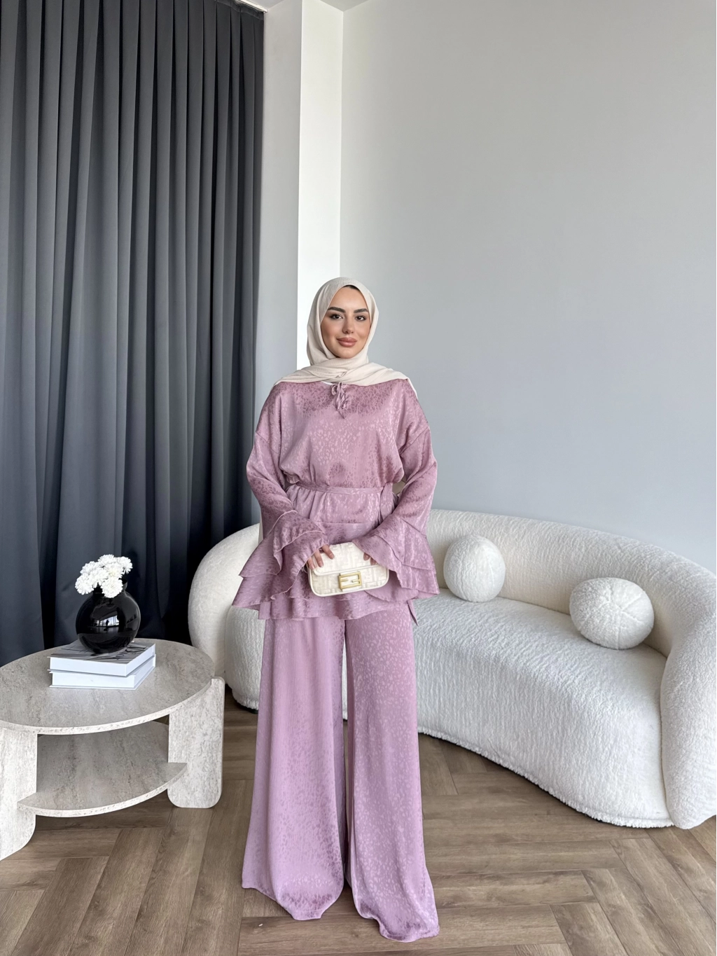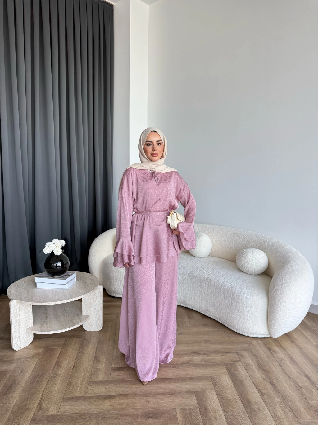 Es - Danlara Saten Kol Fırfırlı Takım - Gül Kurusu