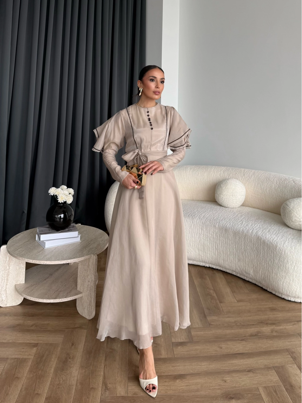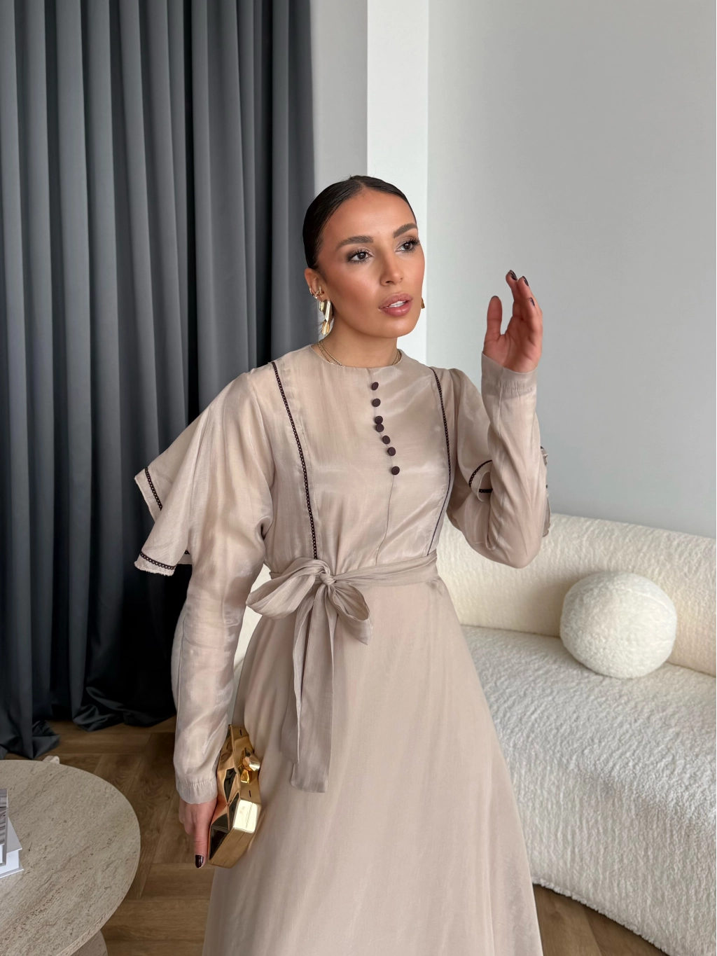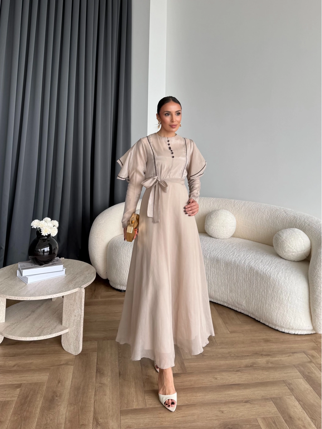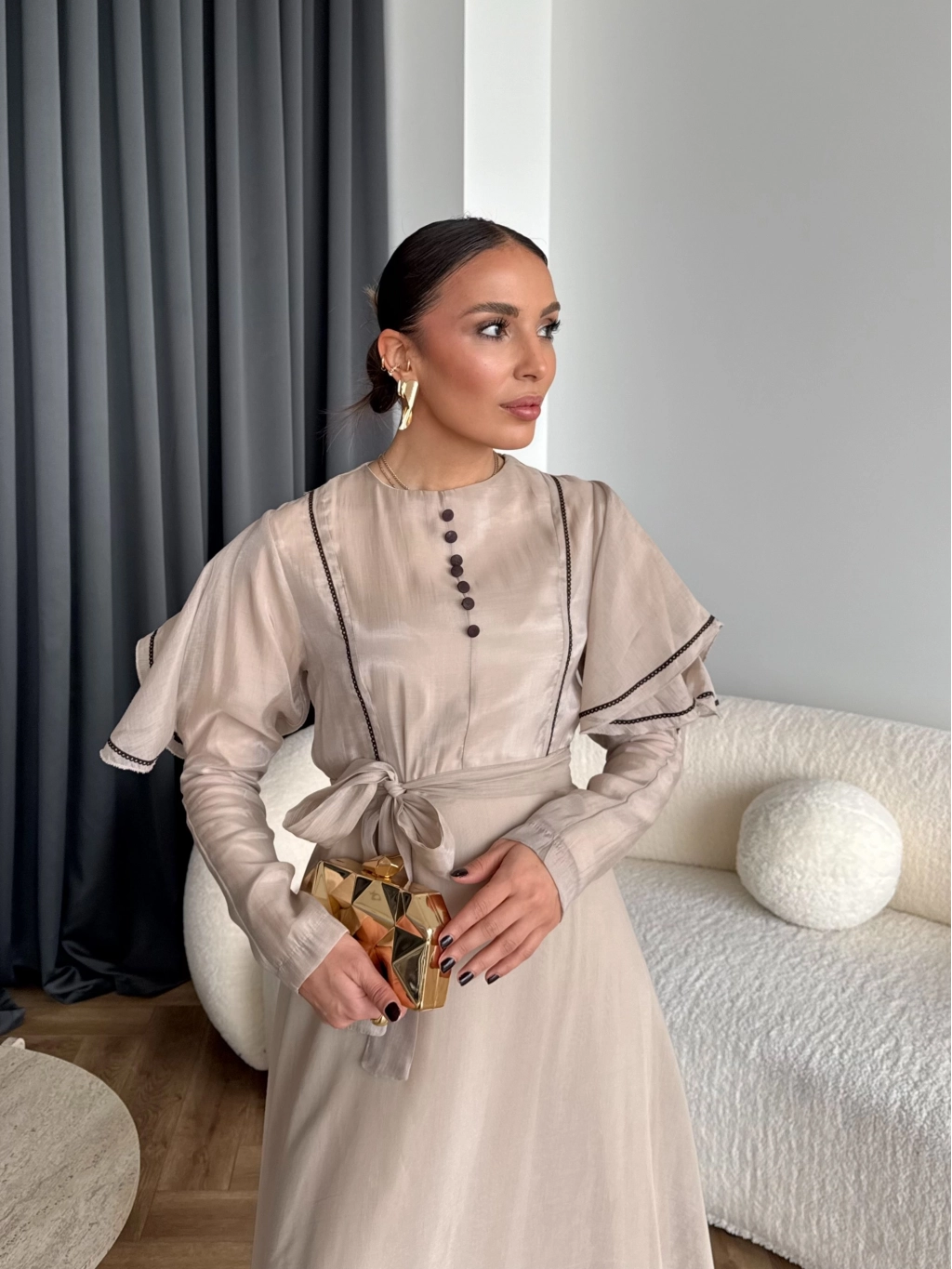 Fuş - Chic Nakış Detay Parlak Tensel Elbise - Bej