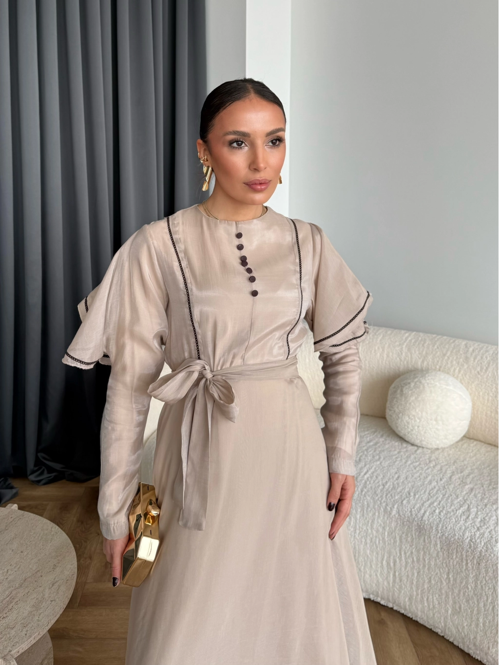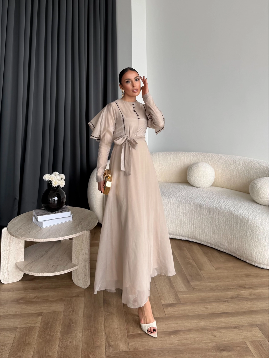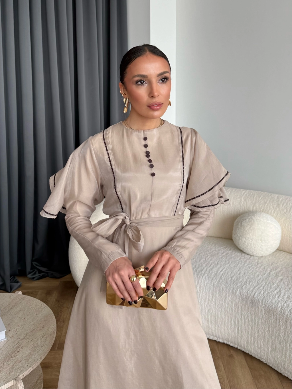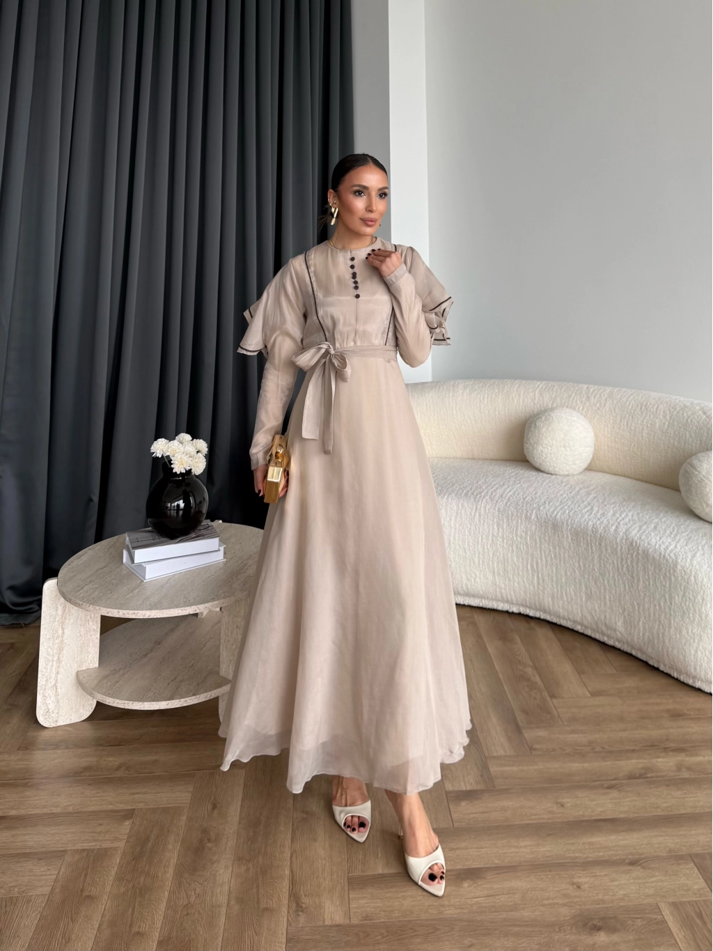 Fuş - Chic Nakış Detay Parlak Tensel Elbise - Bej