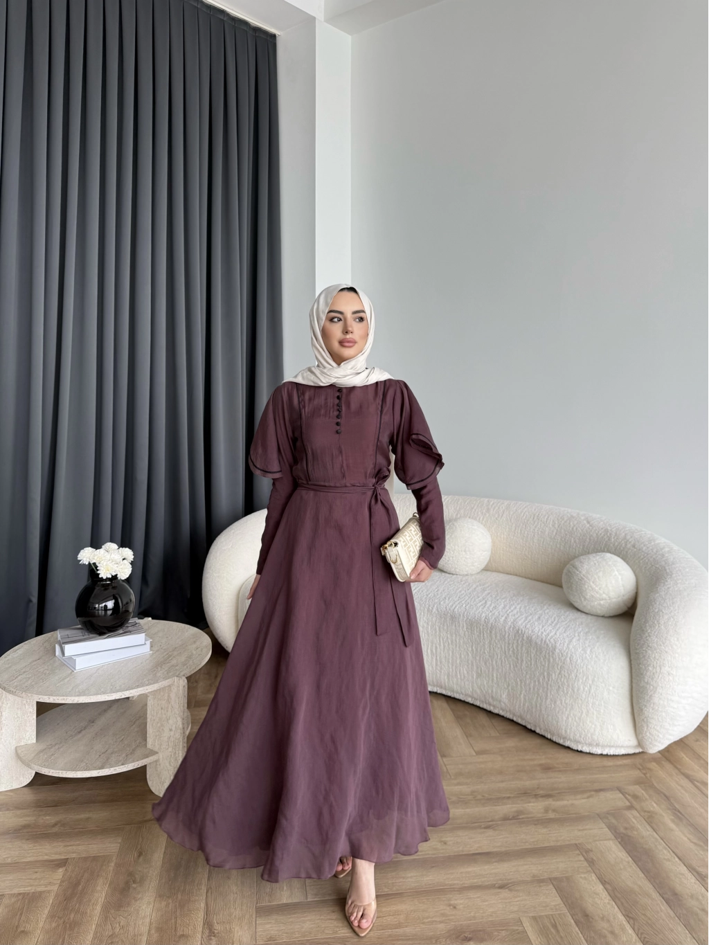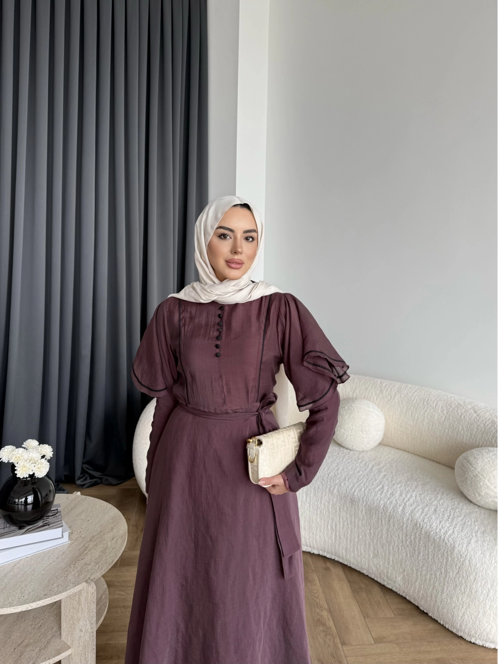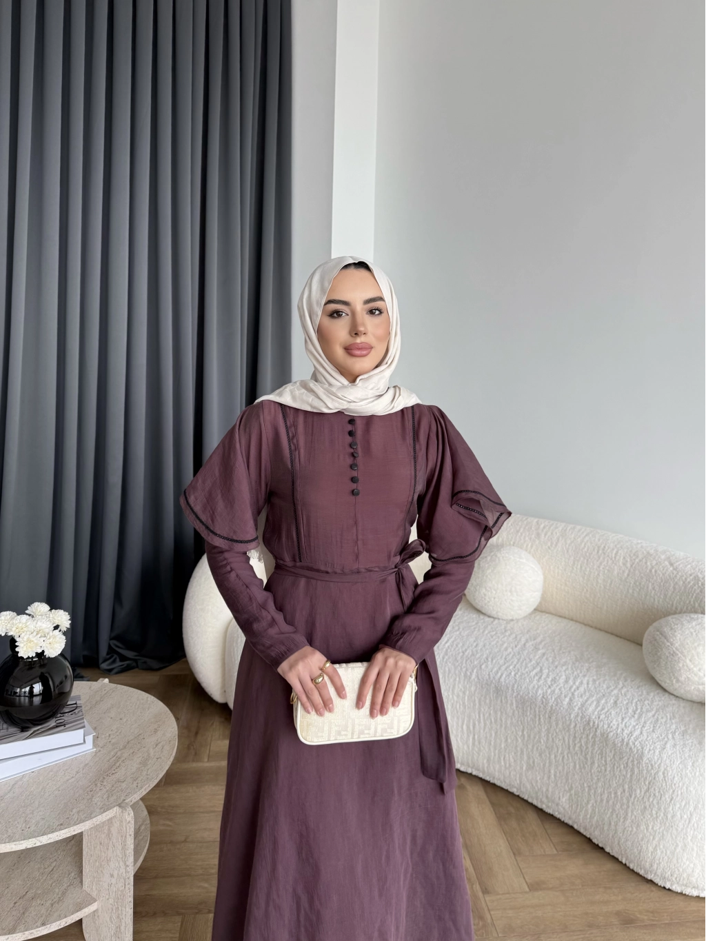 Fuş - Chic Nakış Detay Parlak Tensel Elbise - Mürdüm