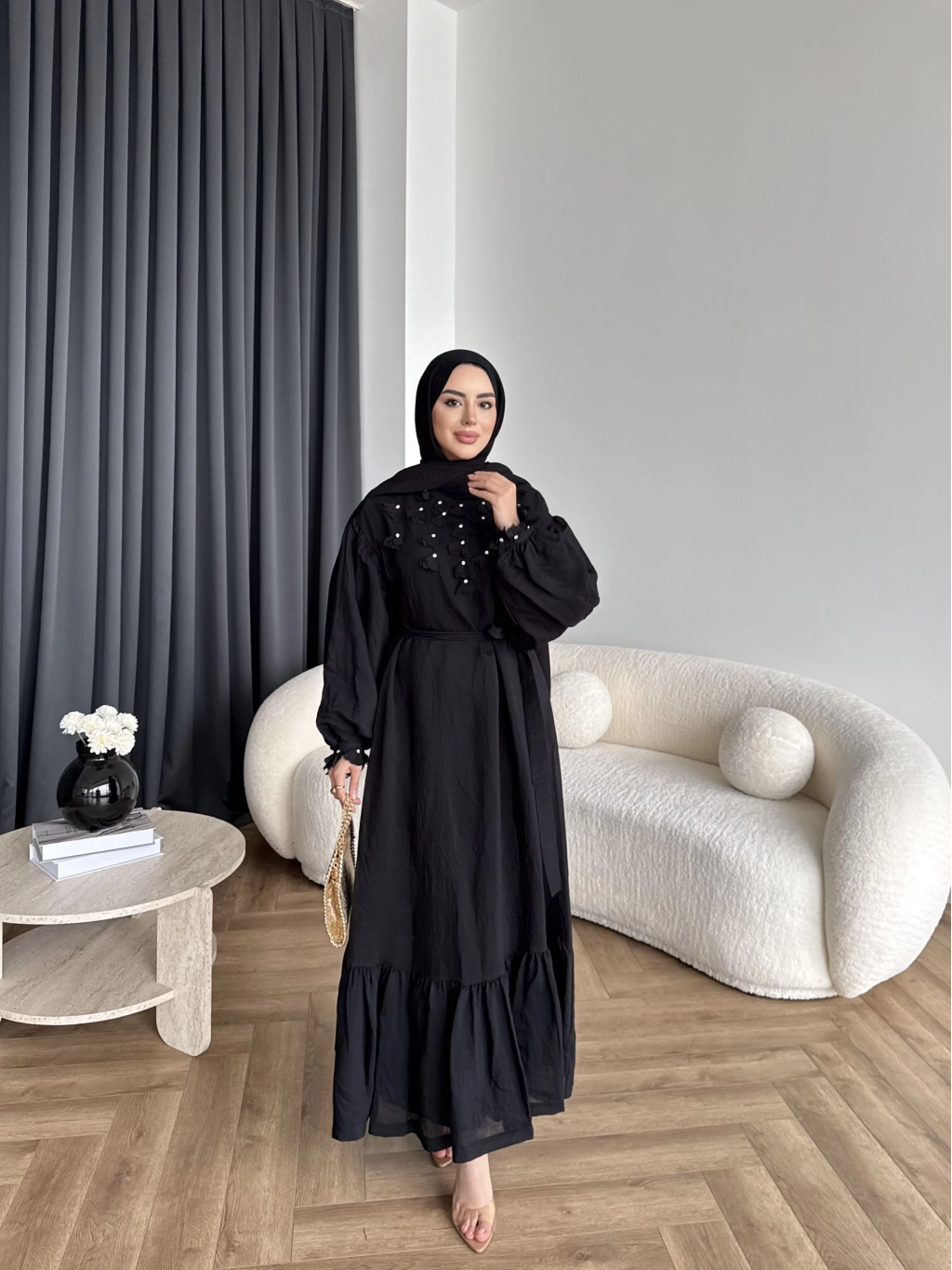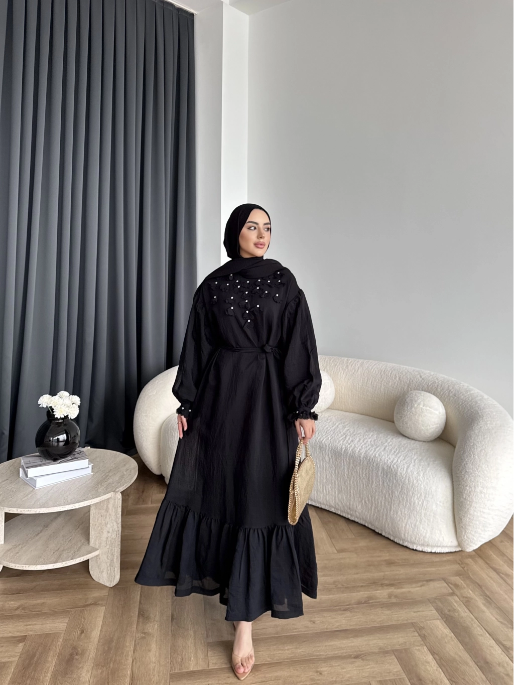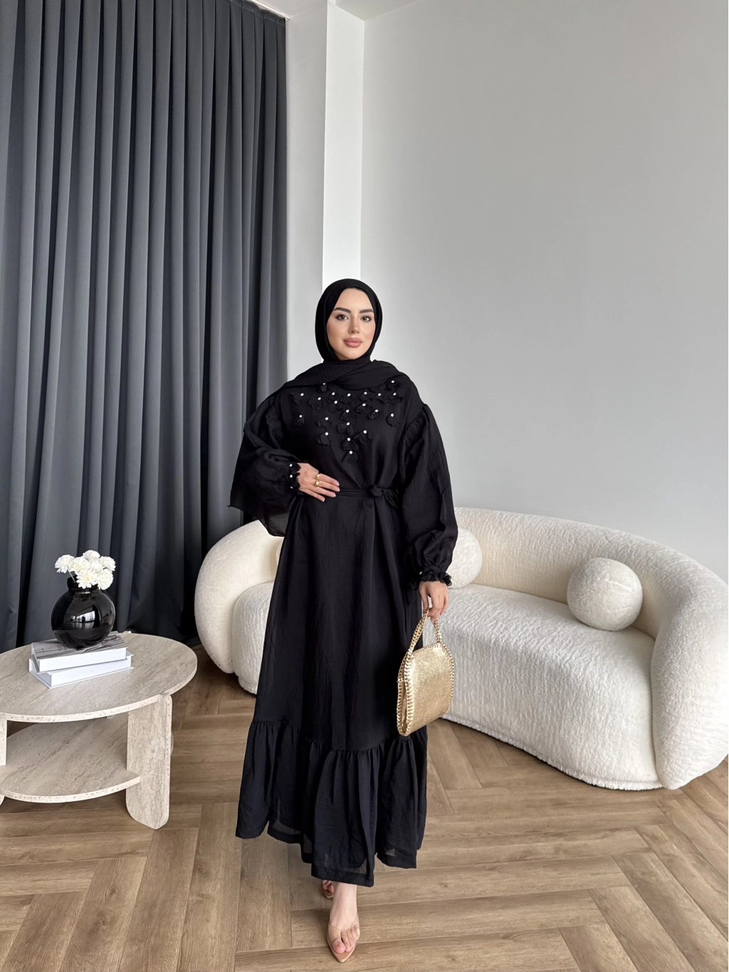 Fuş - Evelia Çiçekli Taşlı Elbise - Siyah