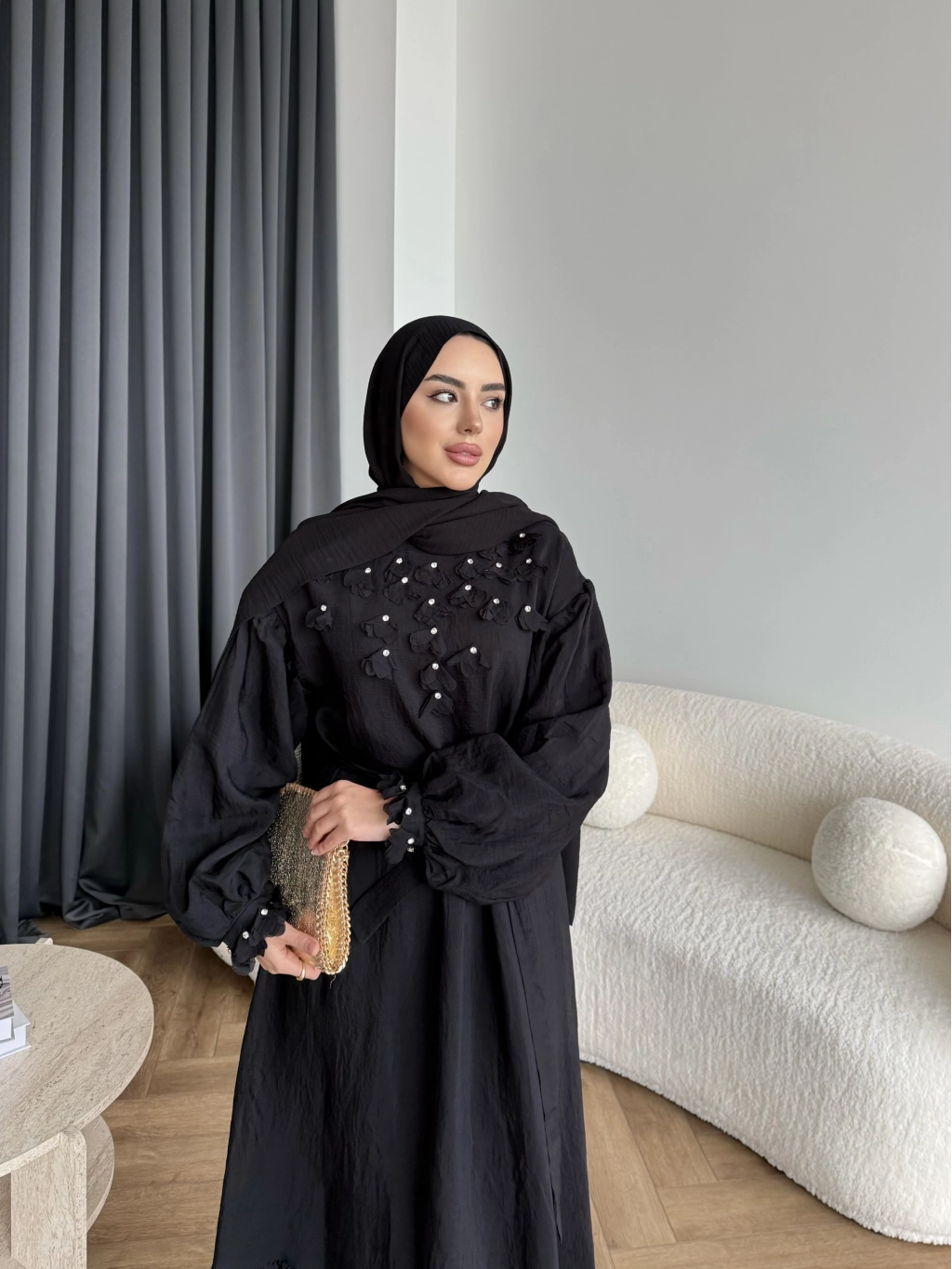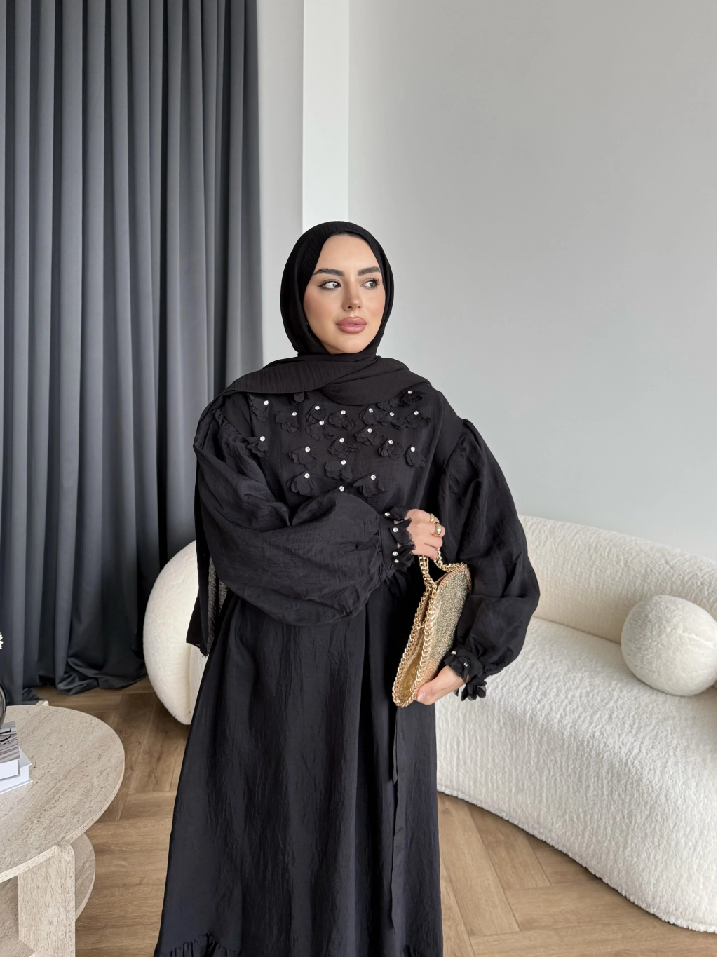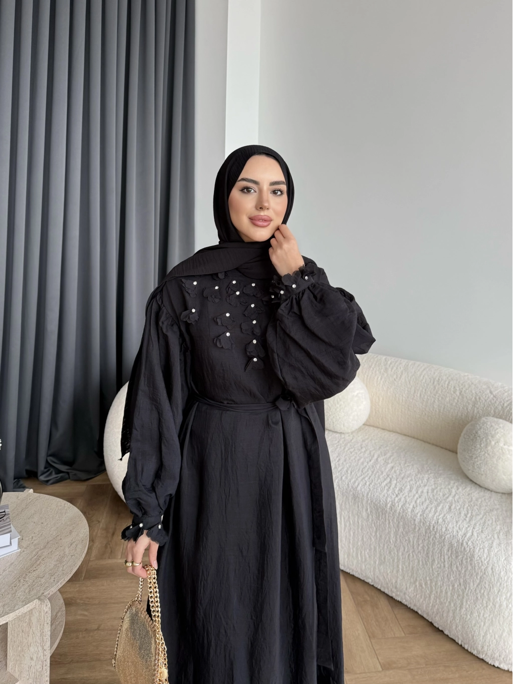 Fuş - Evelia Çiçekli Taşlı Elbise - Siyah