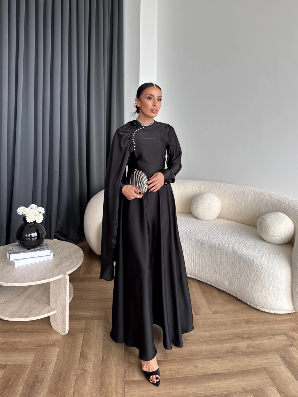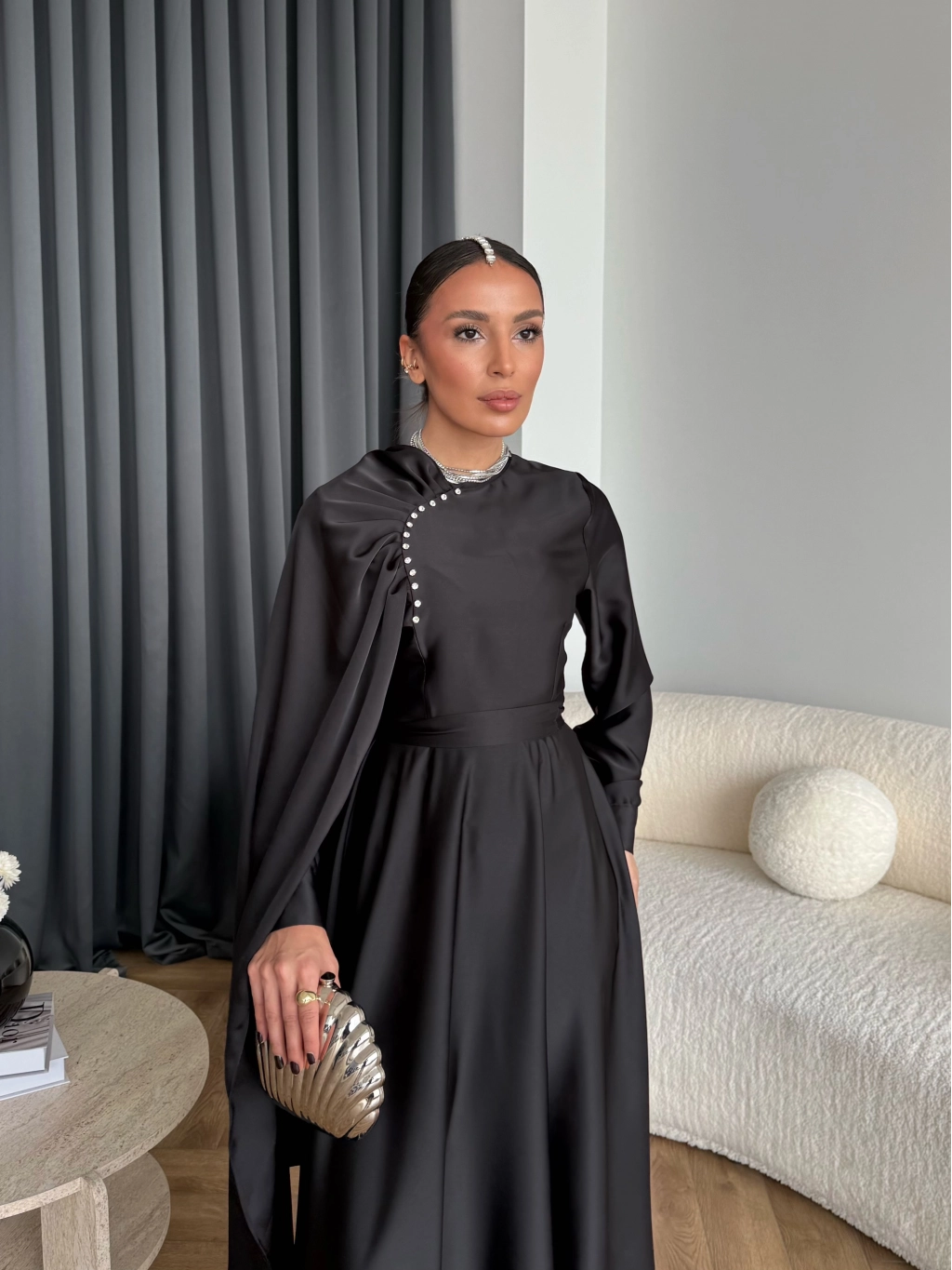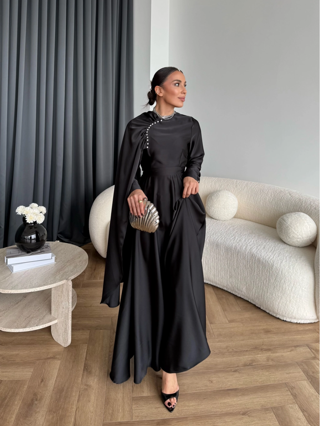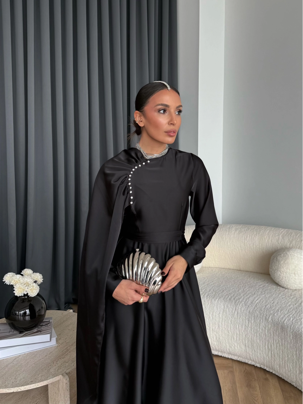 Fuş - Honey Şal Detaylı Saten Elbise - Siyah