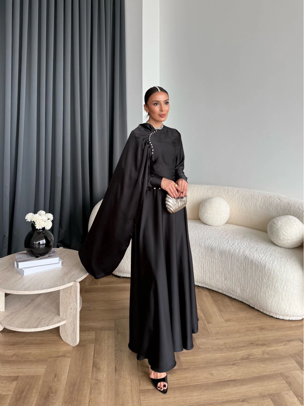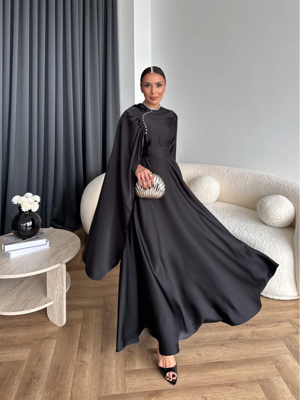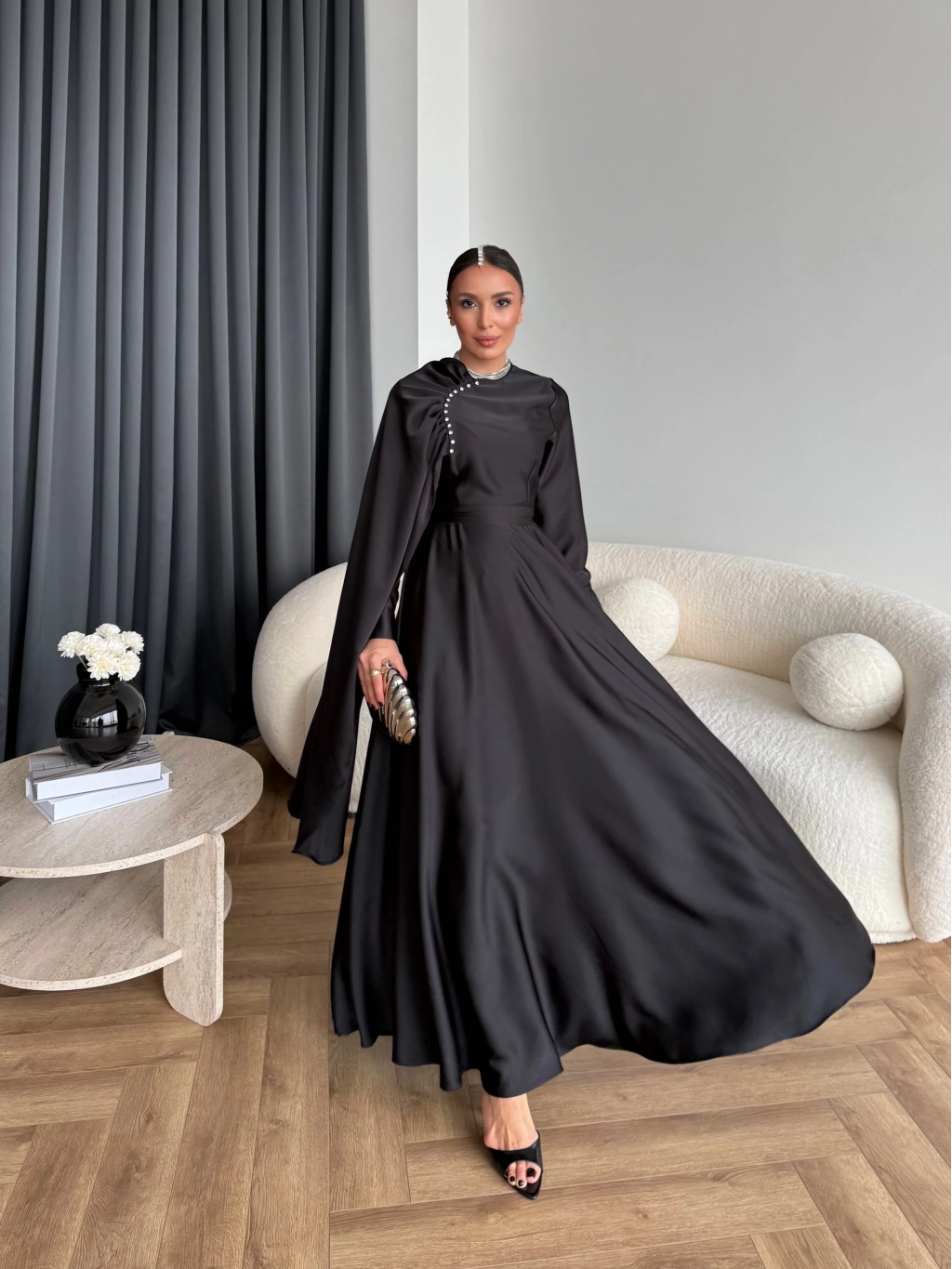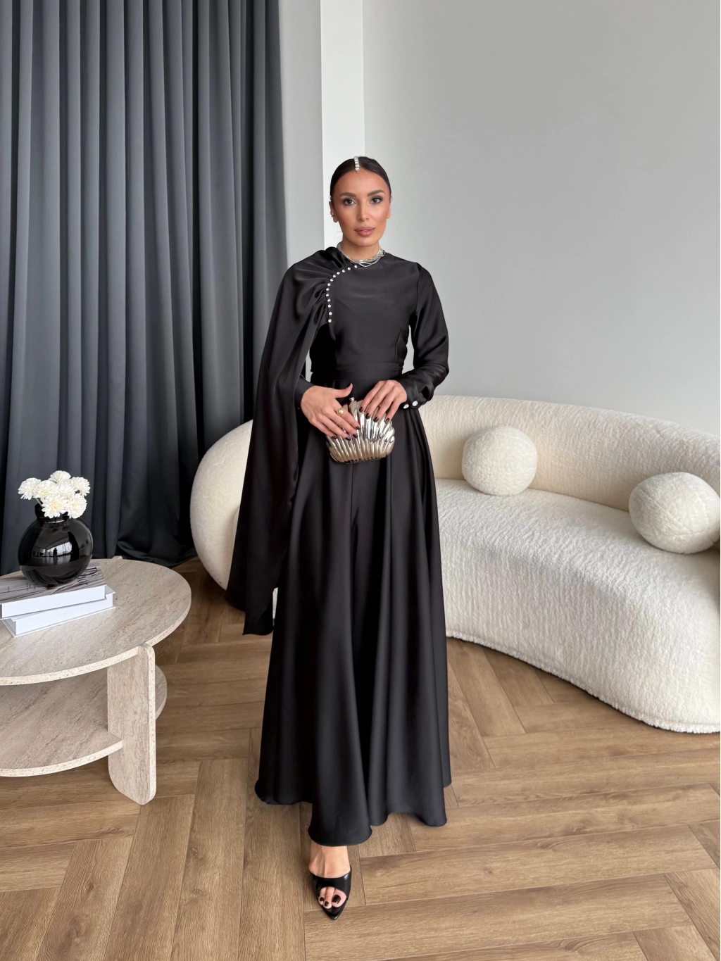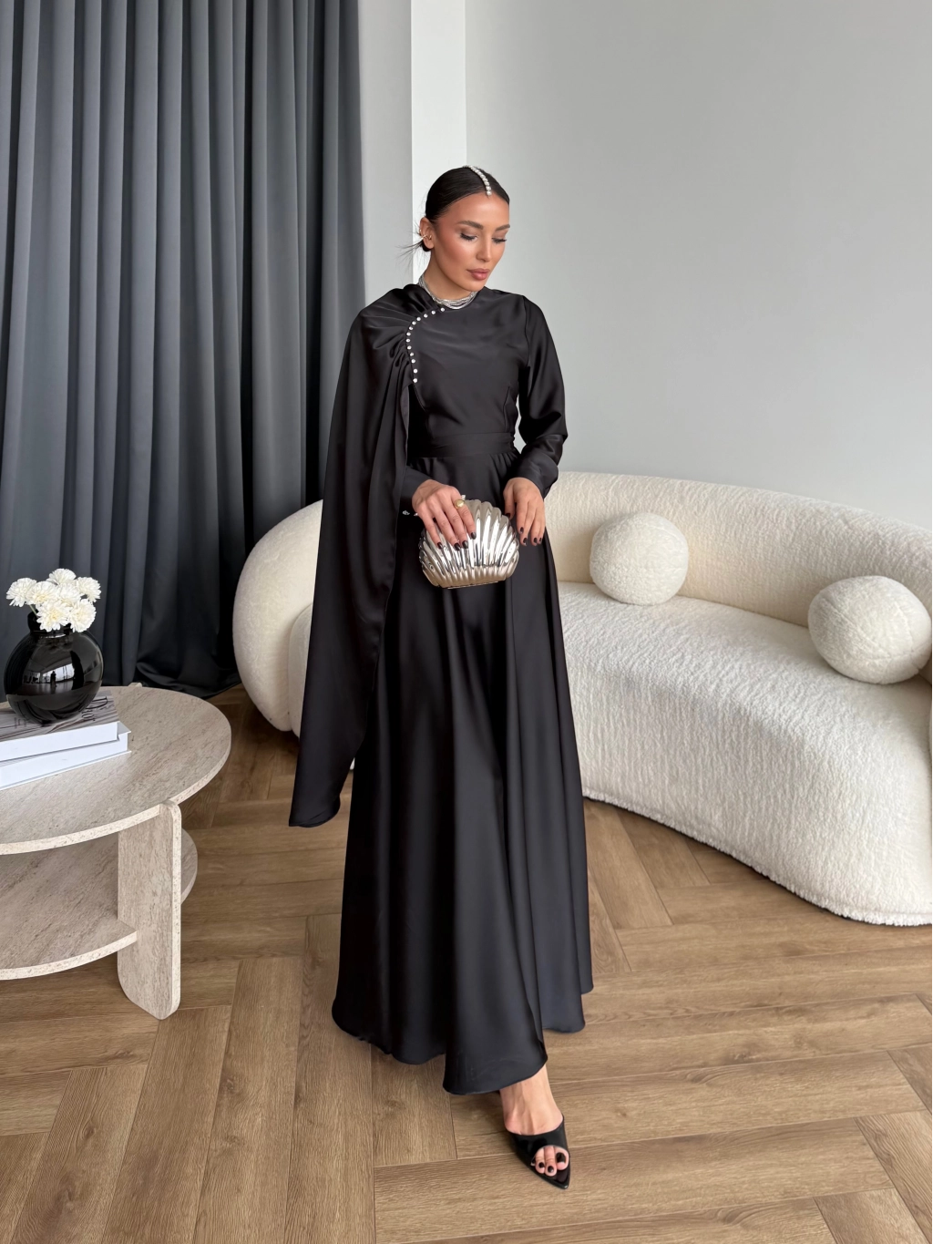 Fuş - Honey Şal Detaylı Saten Elbise - Siyah