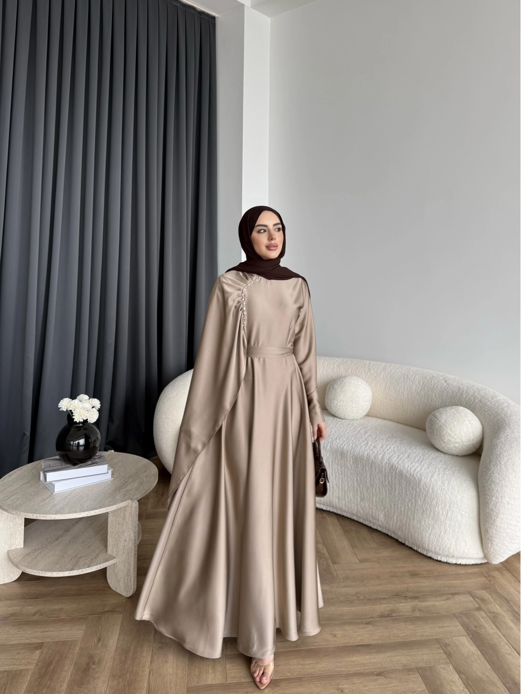 Fuş - Honey Şal Detaylı Saten Elbise - Vizon