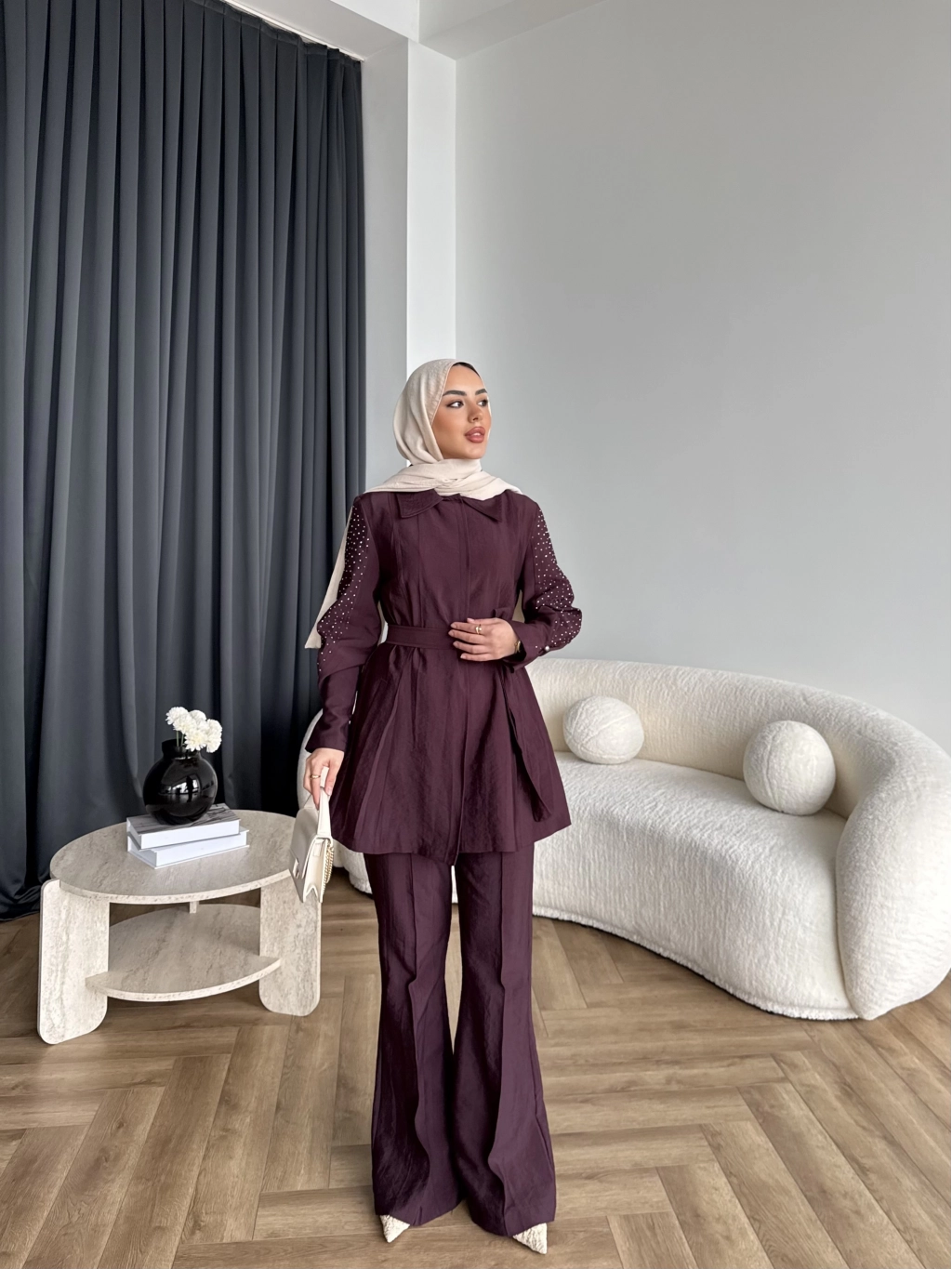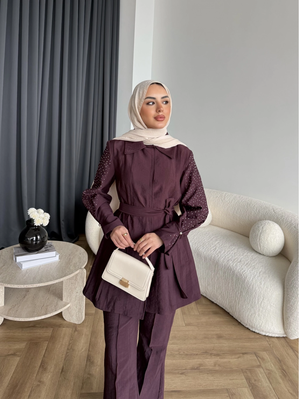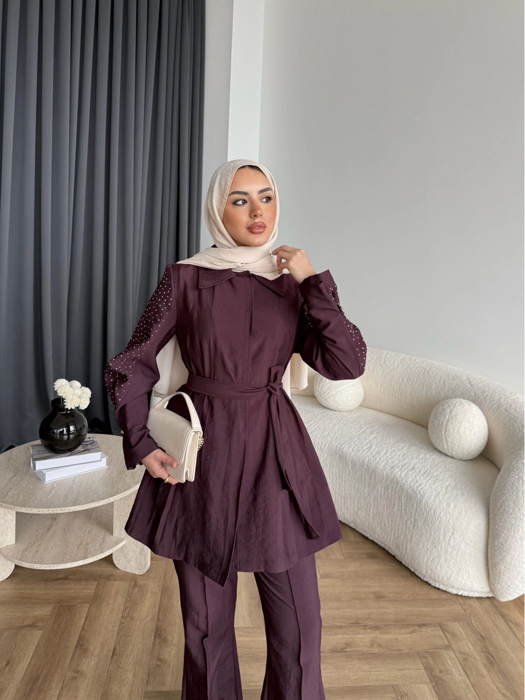 Fuş - Lisor Kol Taş Detay Takım - Bordo