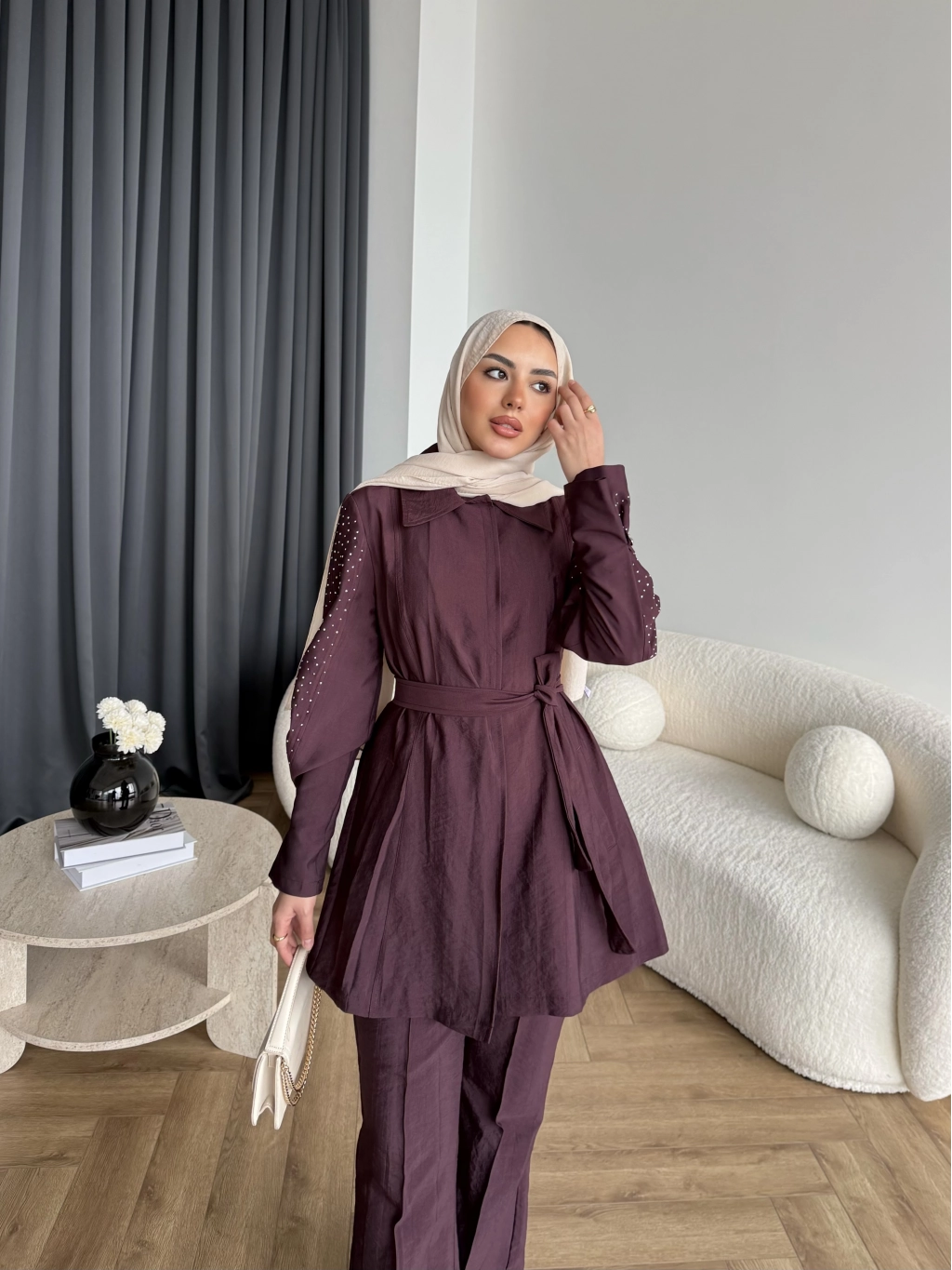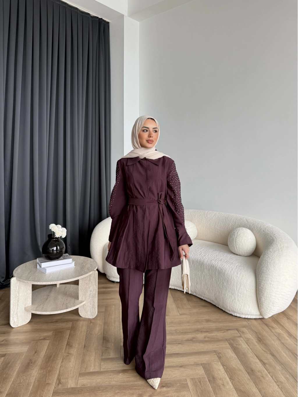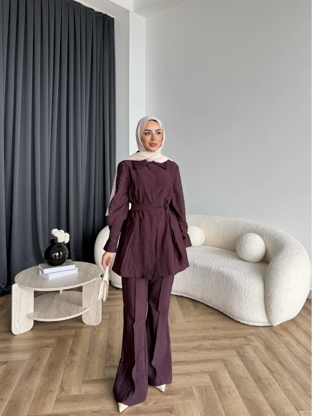 Fuş - Lisor Kol Taş Detay Takım - Bordo