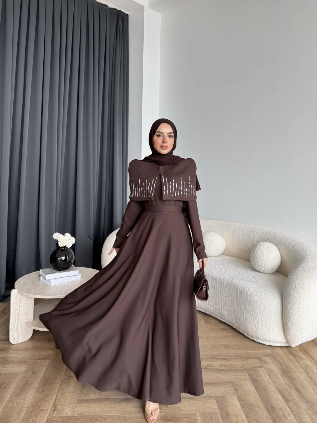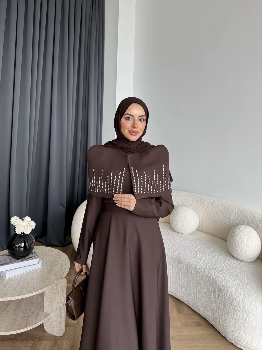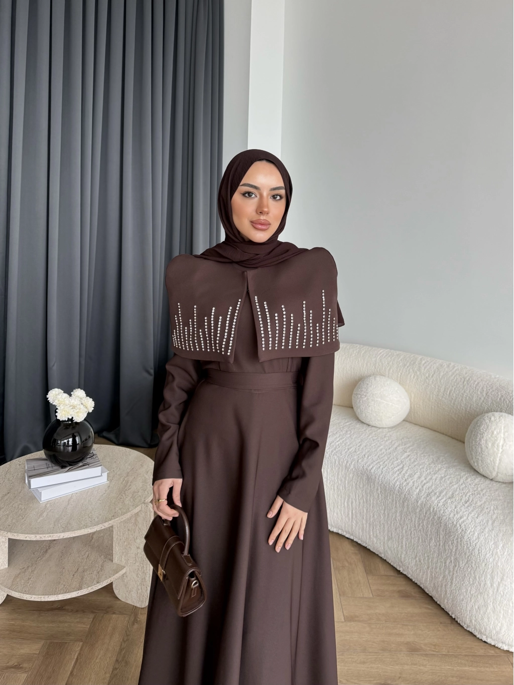 Fuş - Melafis Pelerin Taş Detay Elbise - Acı Kahve