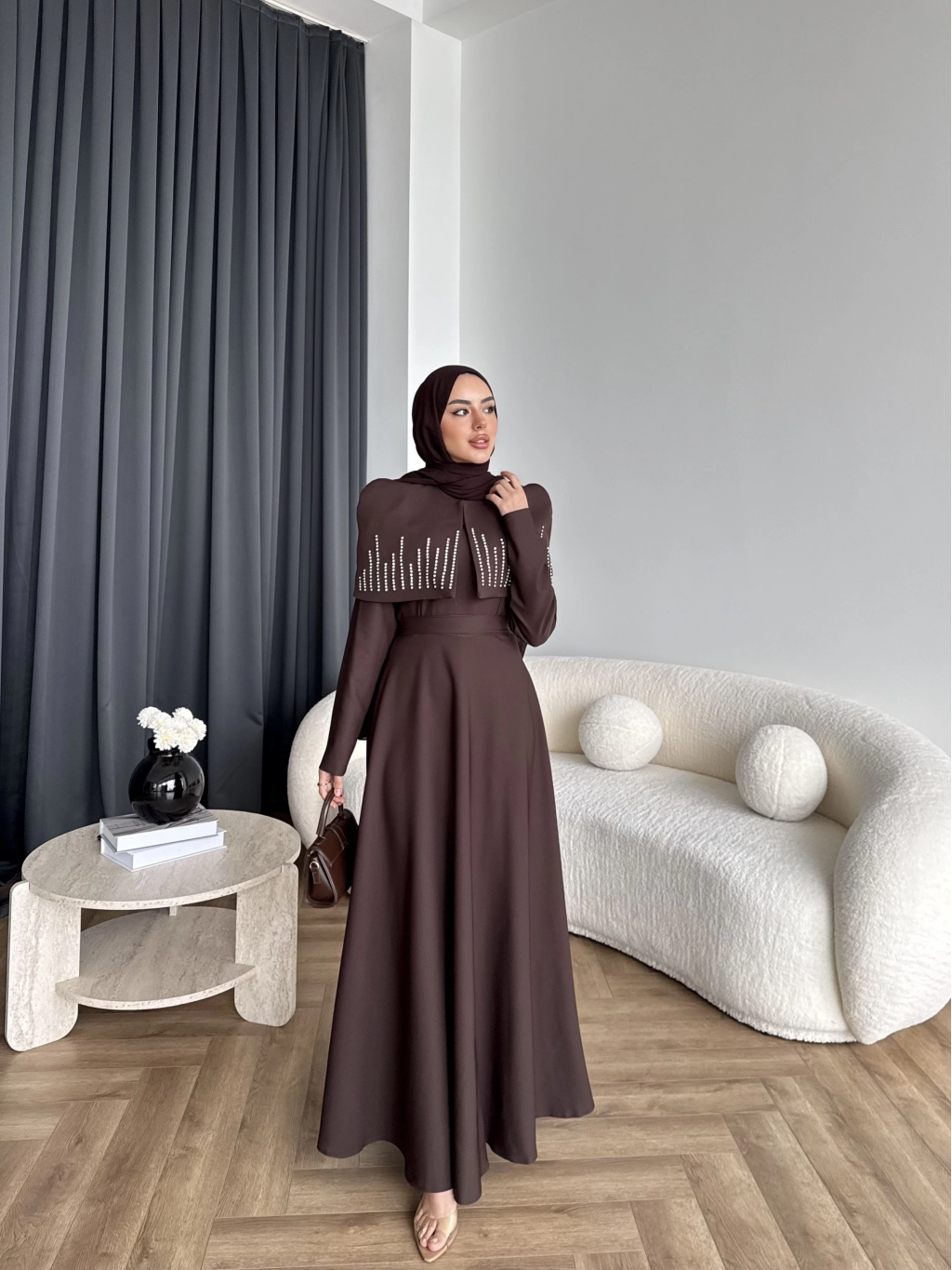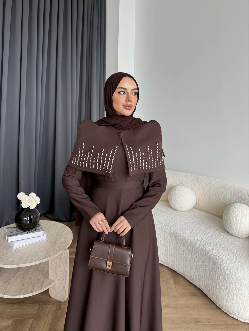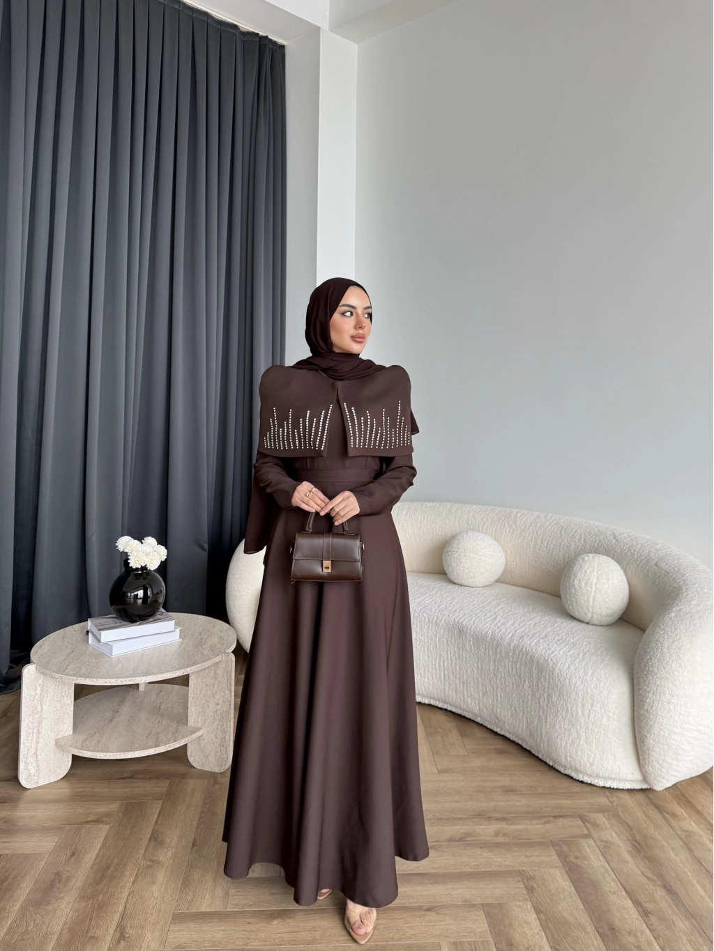 Fuş - Melafis Pelerin Taş Detay Elbise - Acı Kahve