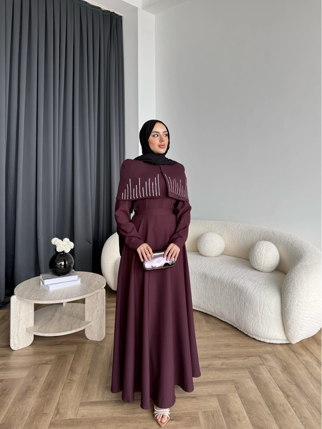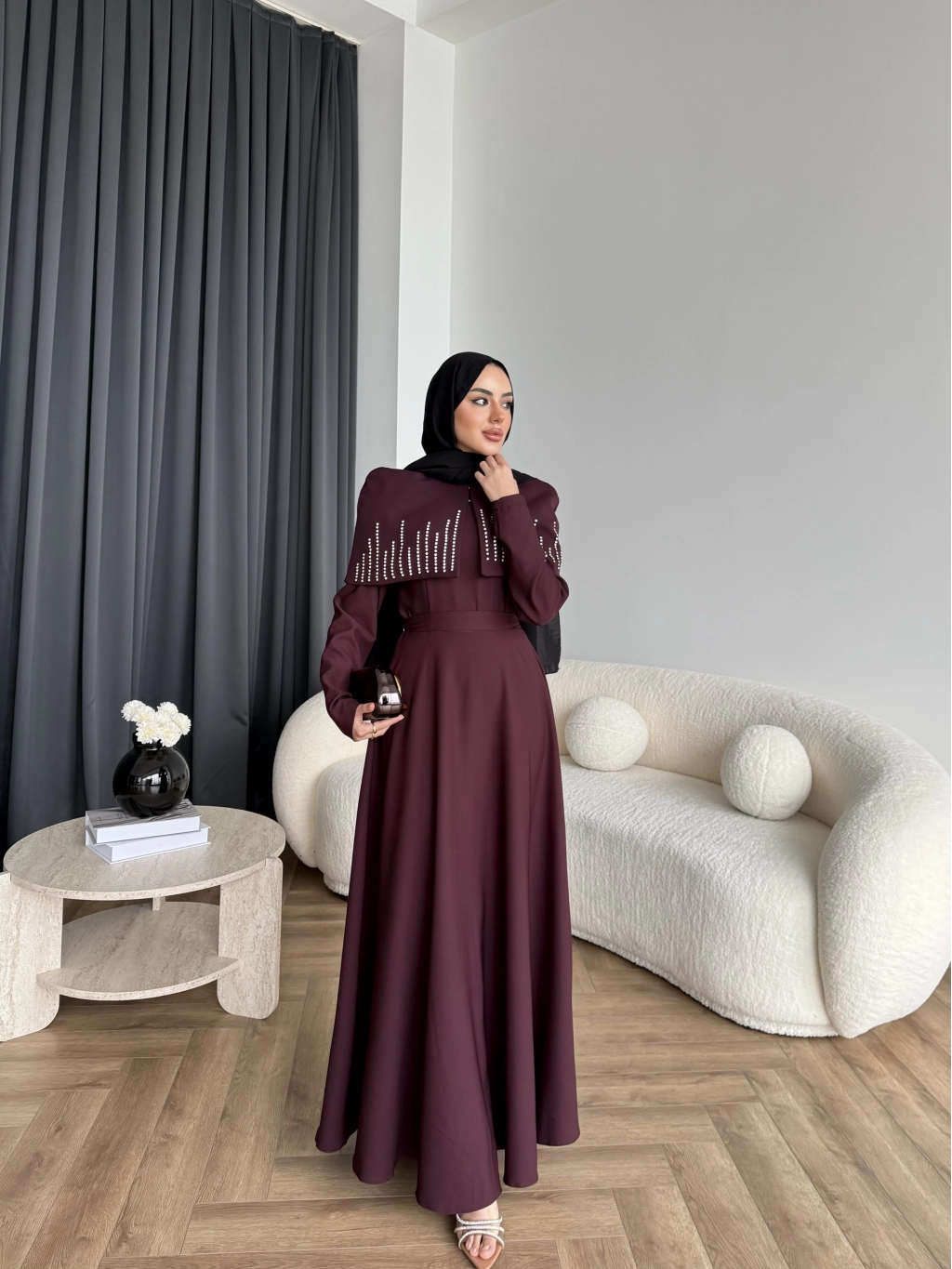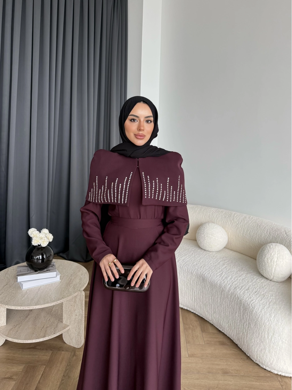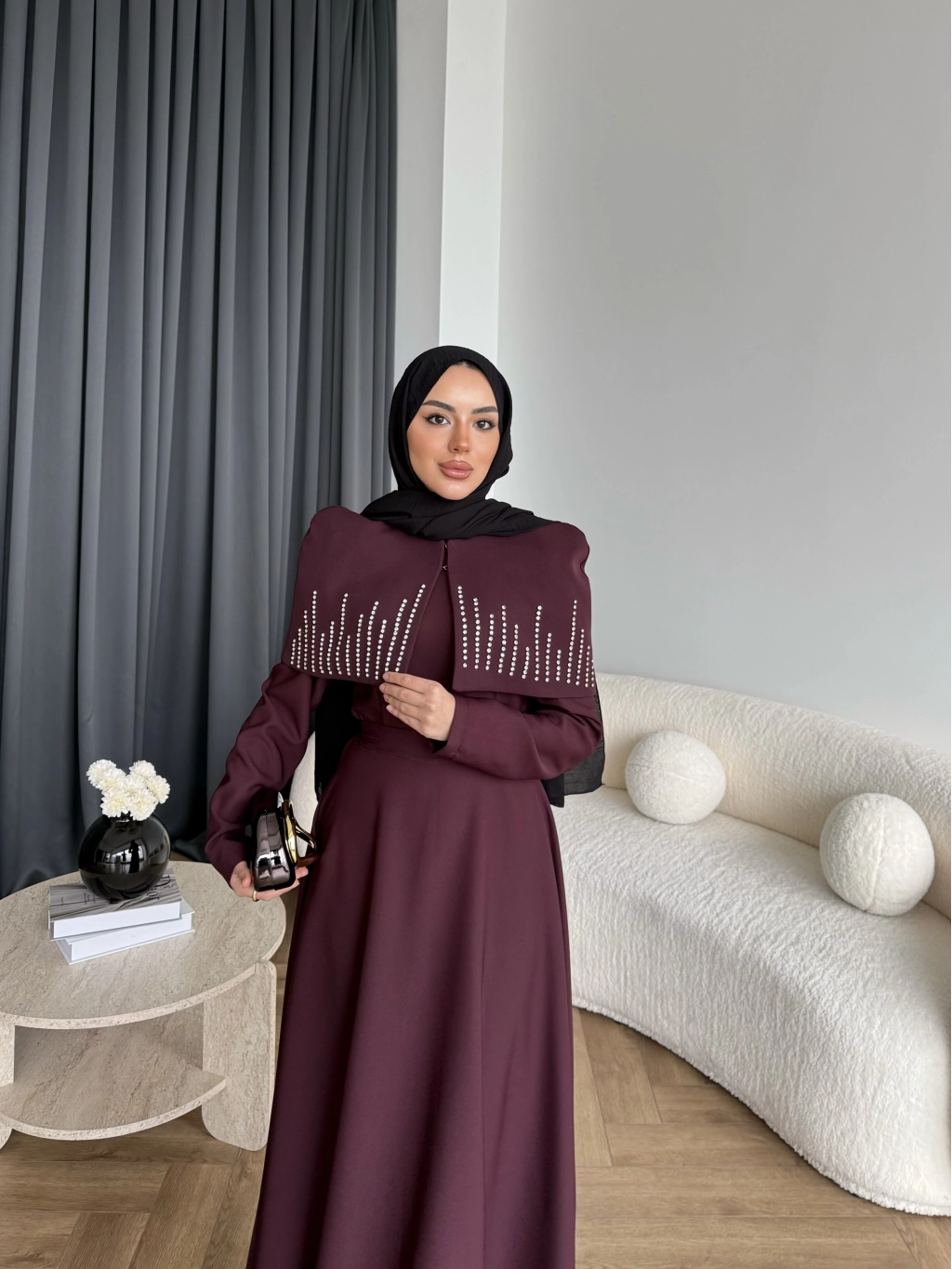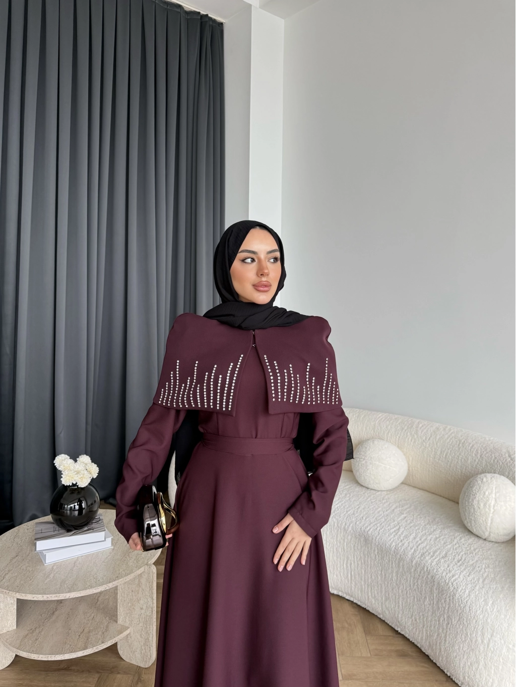 Fuş - Melafis Pelerin Taş Detay Elbise - Bordo