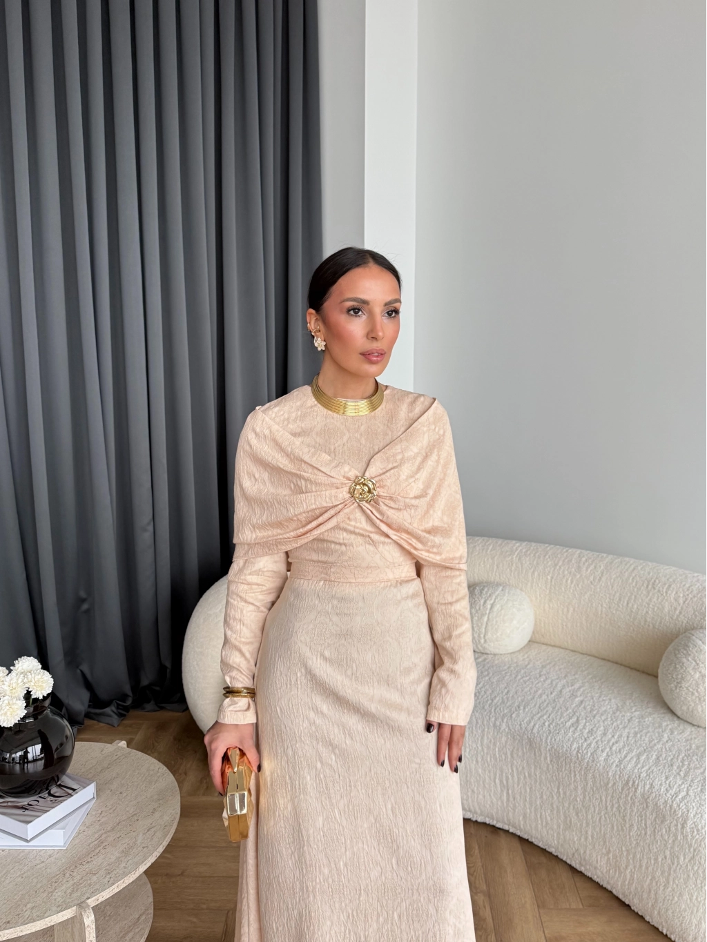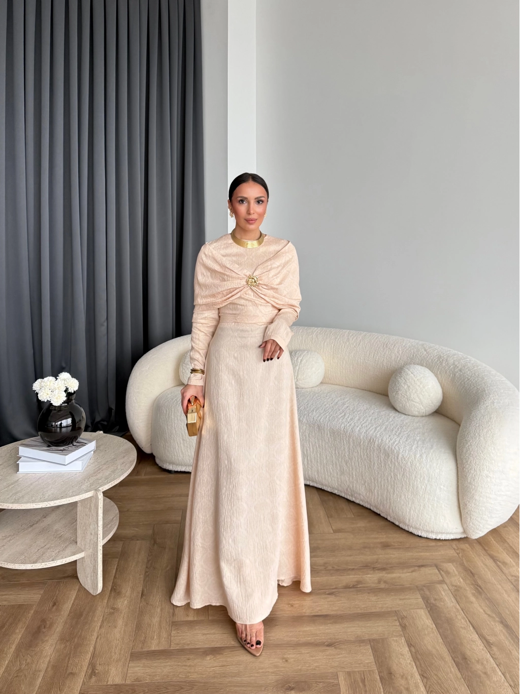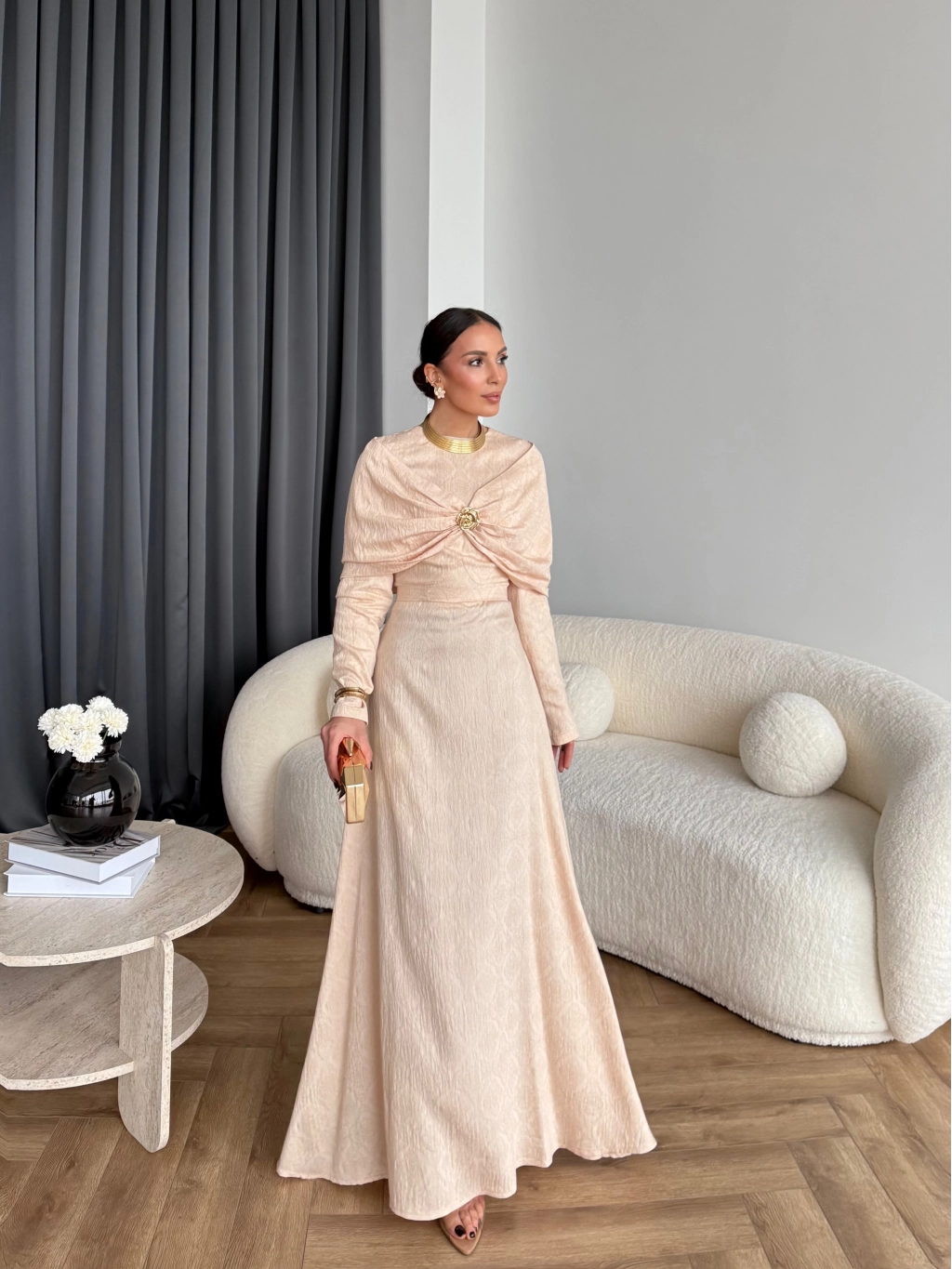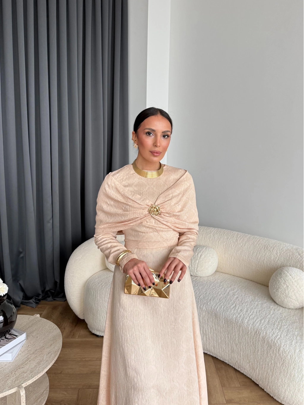 Fuş - Orchid Şal Detaylı Broşlu Elbise - Krem
