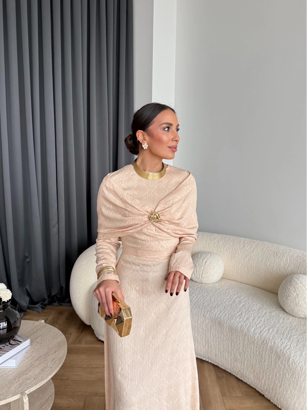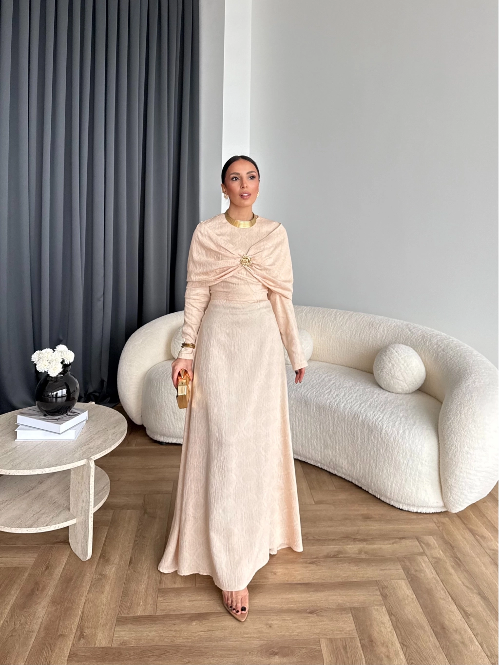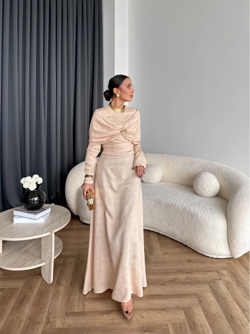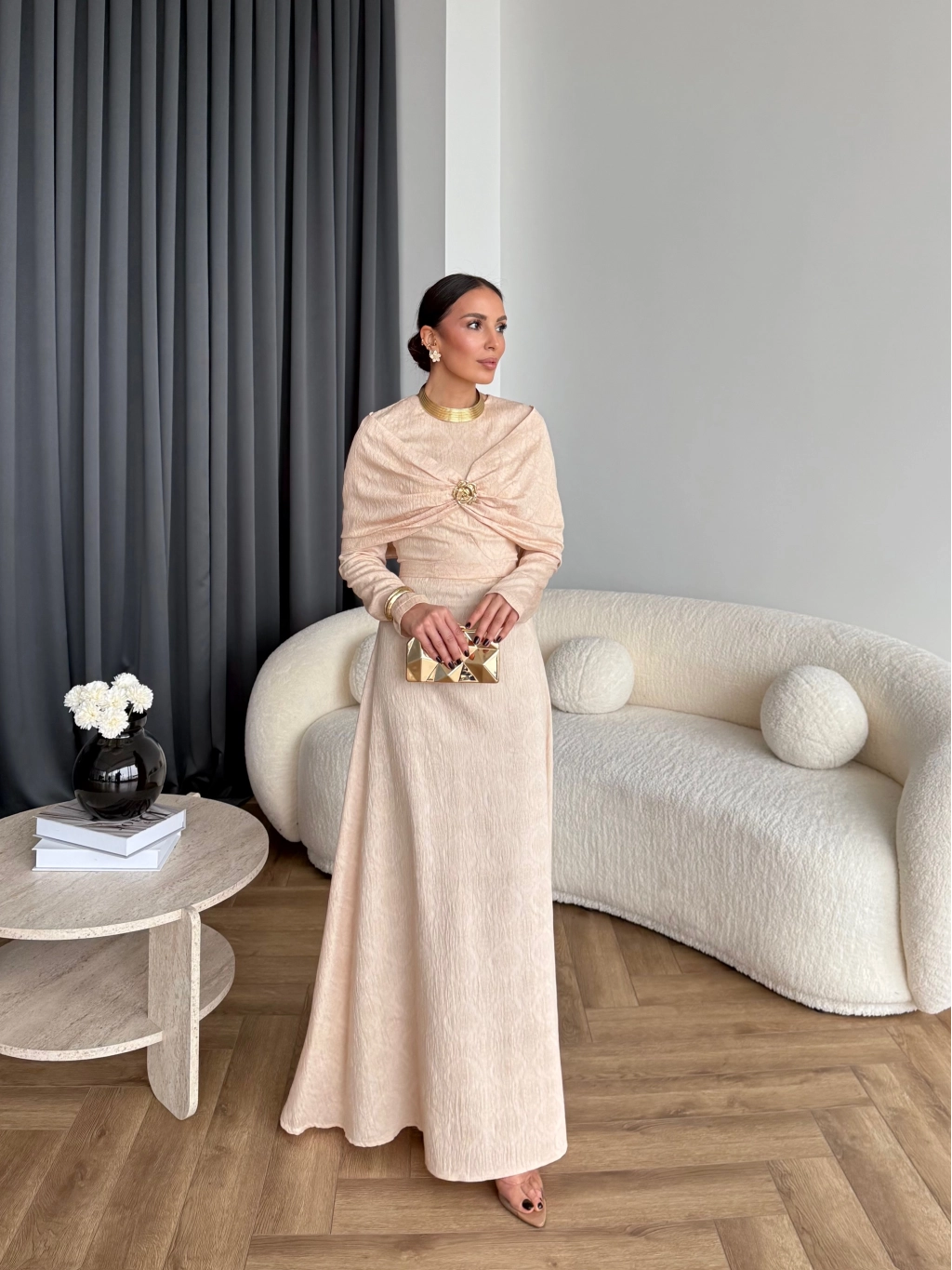 Fuş - Orchid Şal Detaylı Broşlu Elbise - Krem