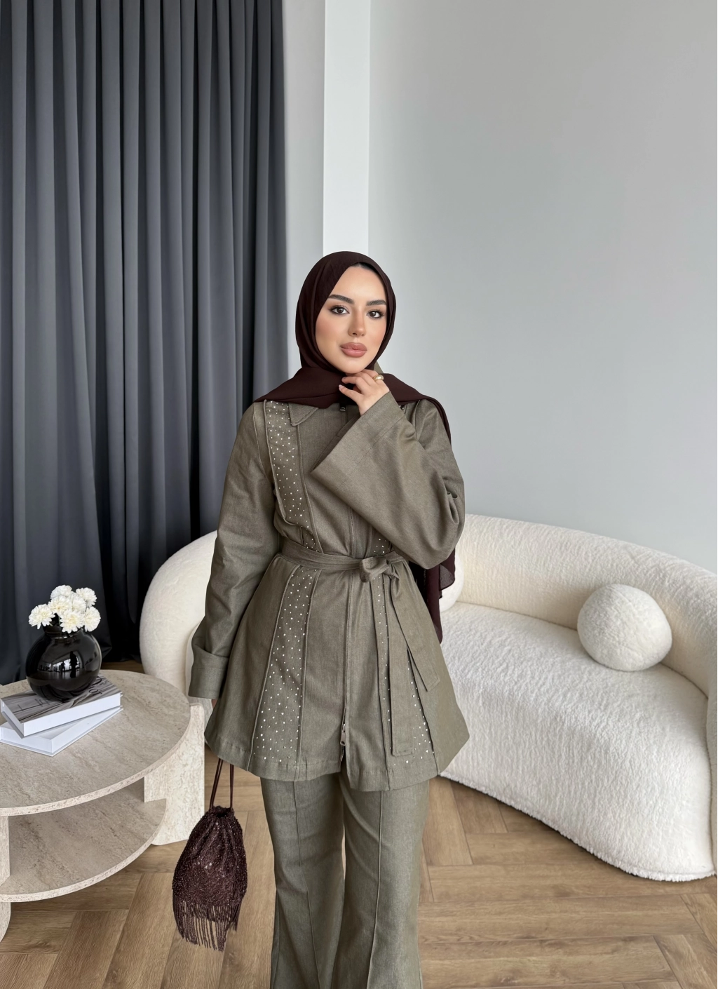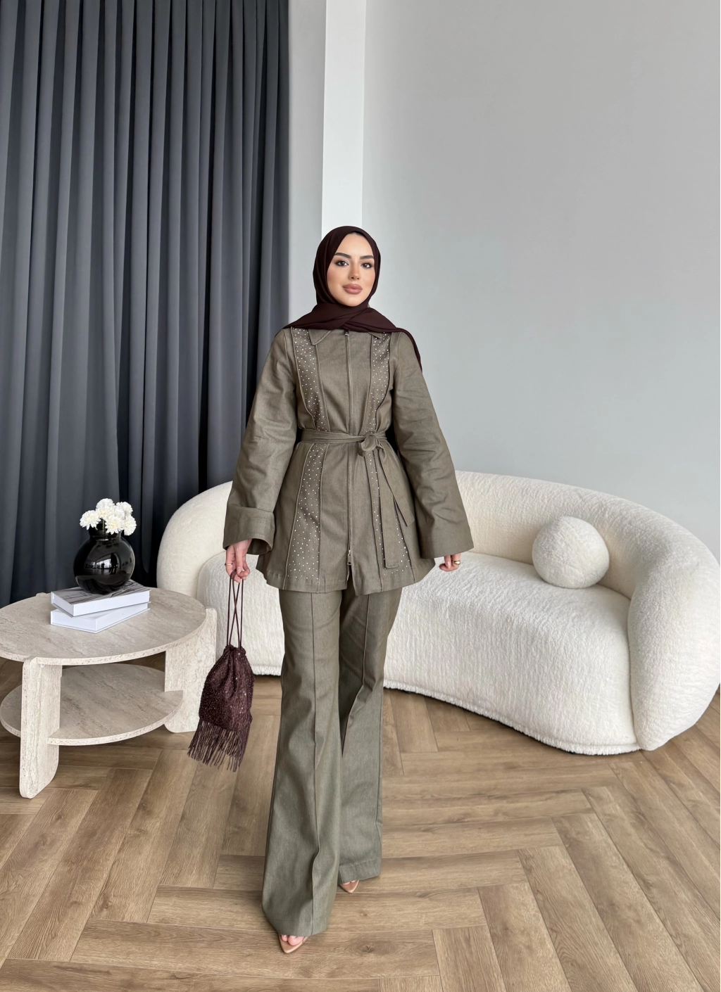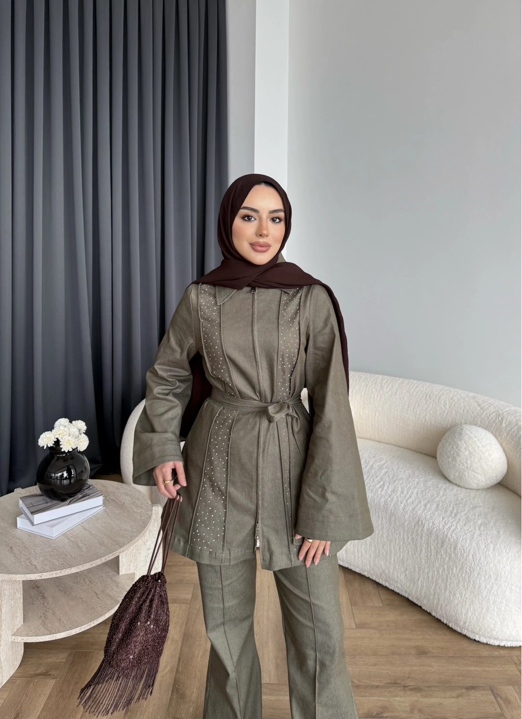 Fuş - Taş Detaylı Fermuarlı Pantolonlu Takım - Haki