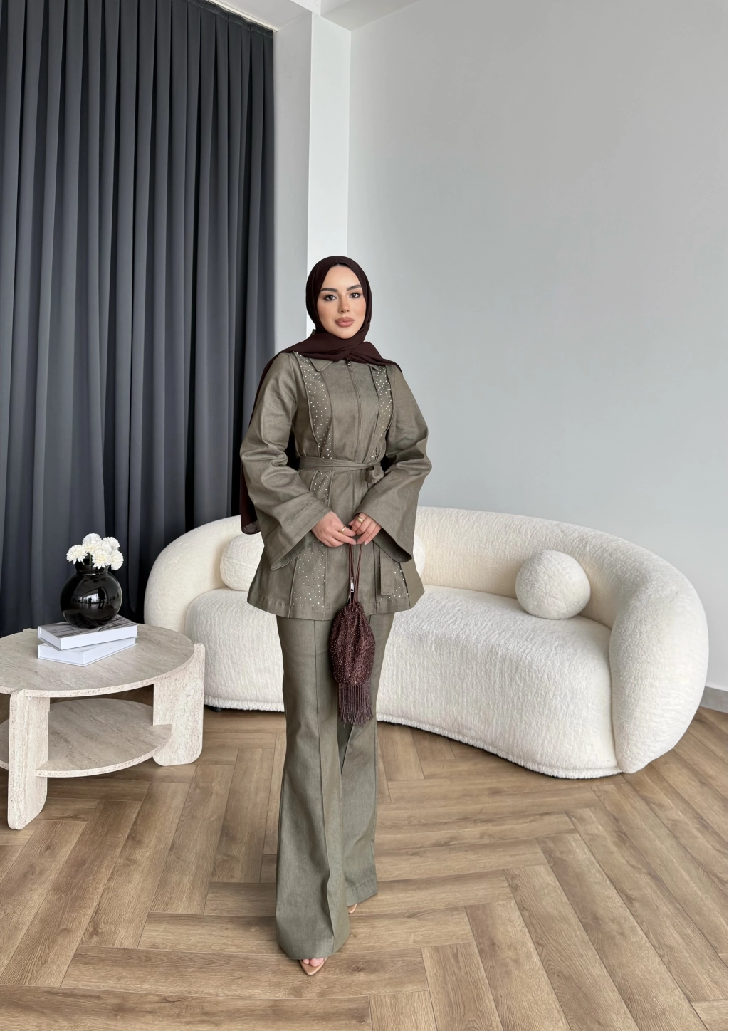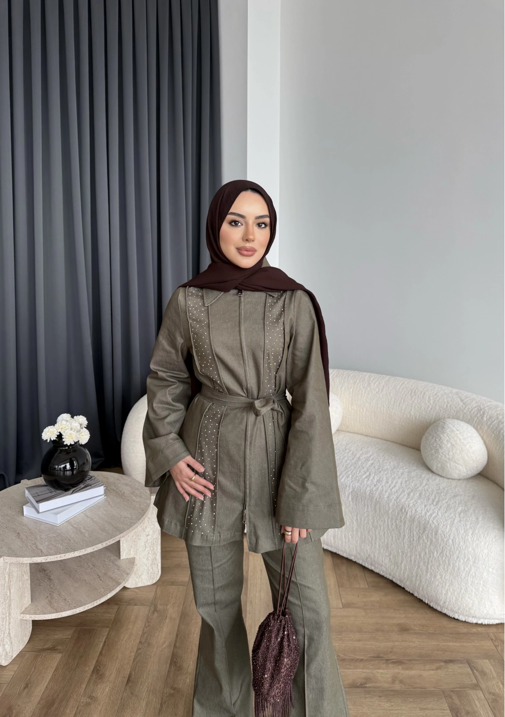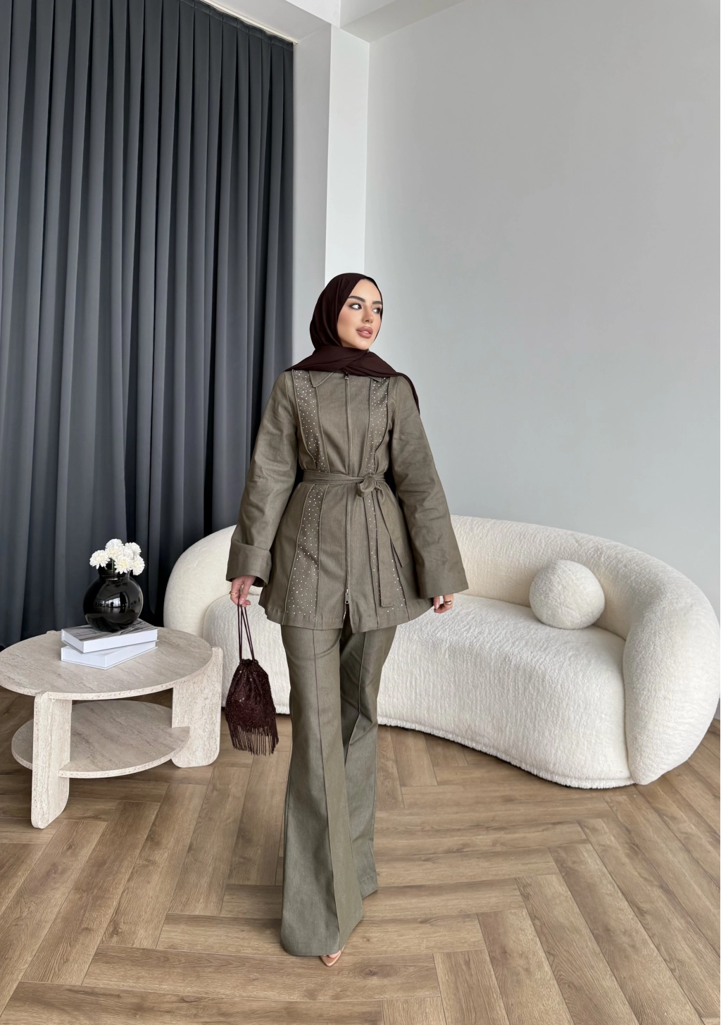 Fuş - Taş Detaylı Fermuarlı Pantolonlu Takım - Haki