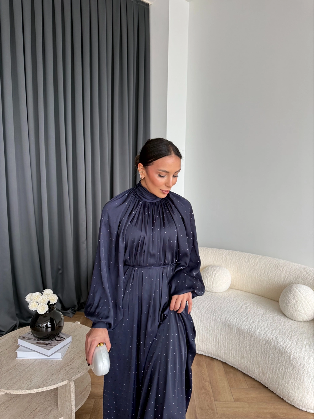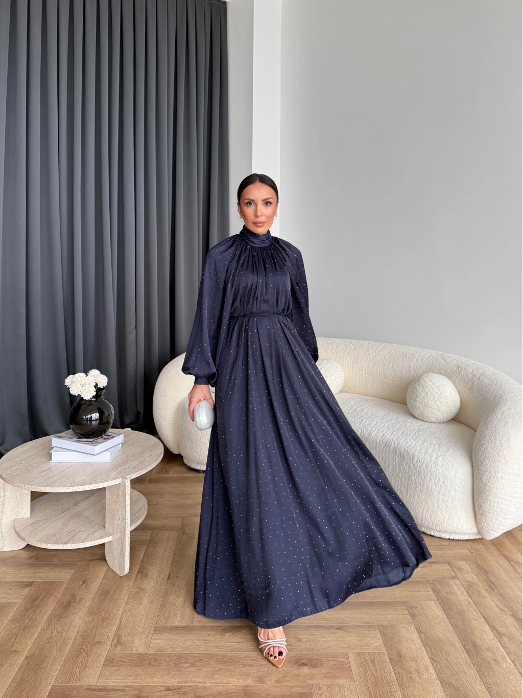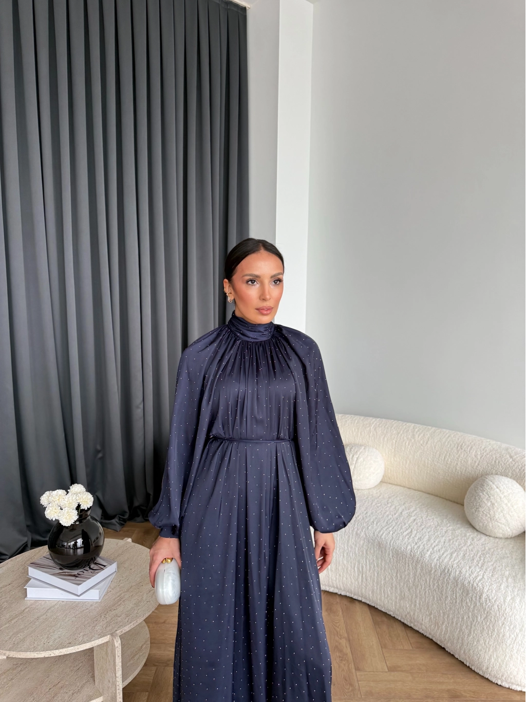 Hew - Gasto Taşlı Saten Elbise - Lacivert