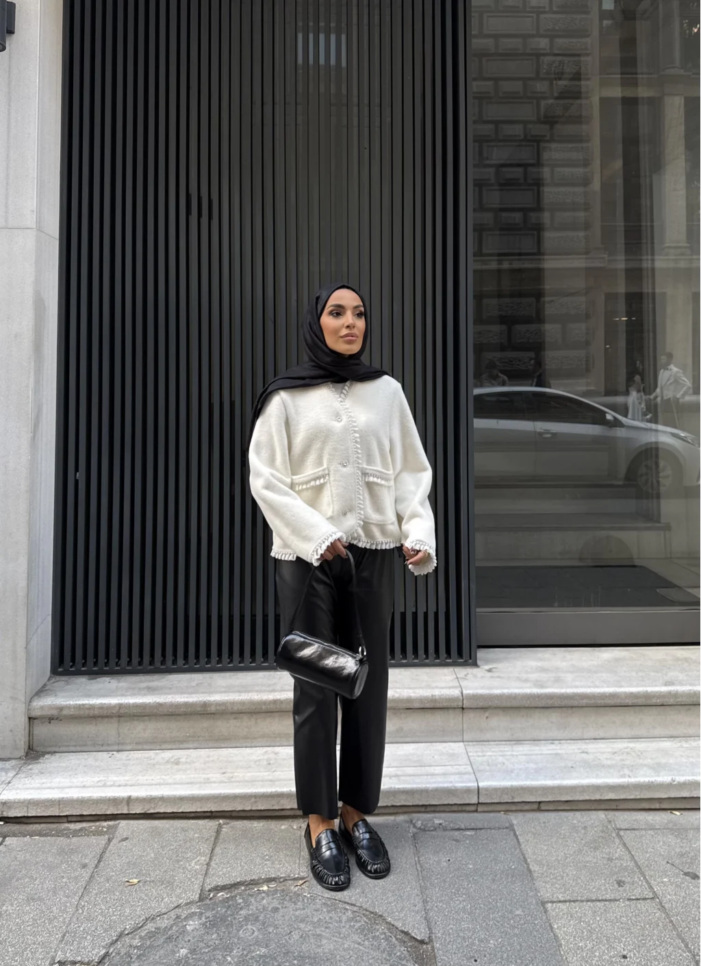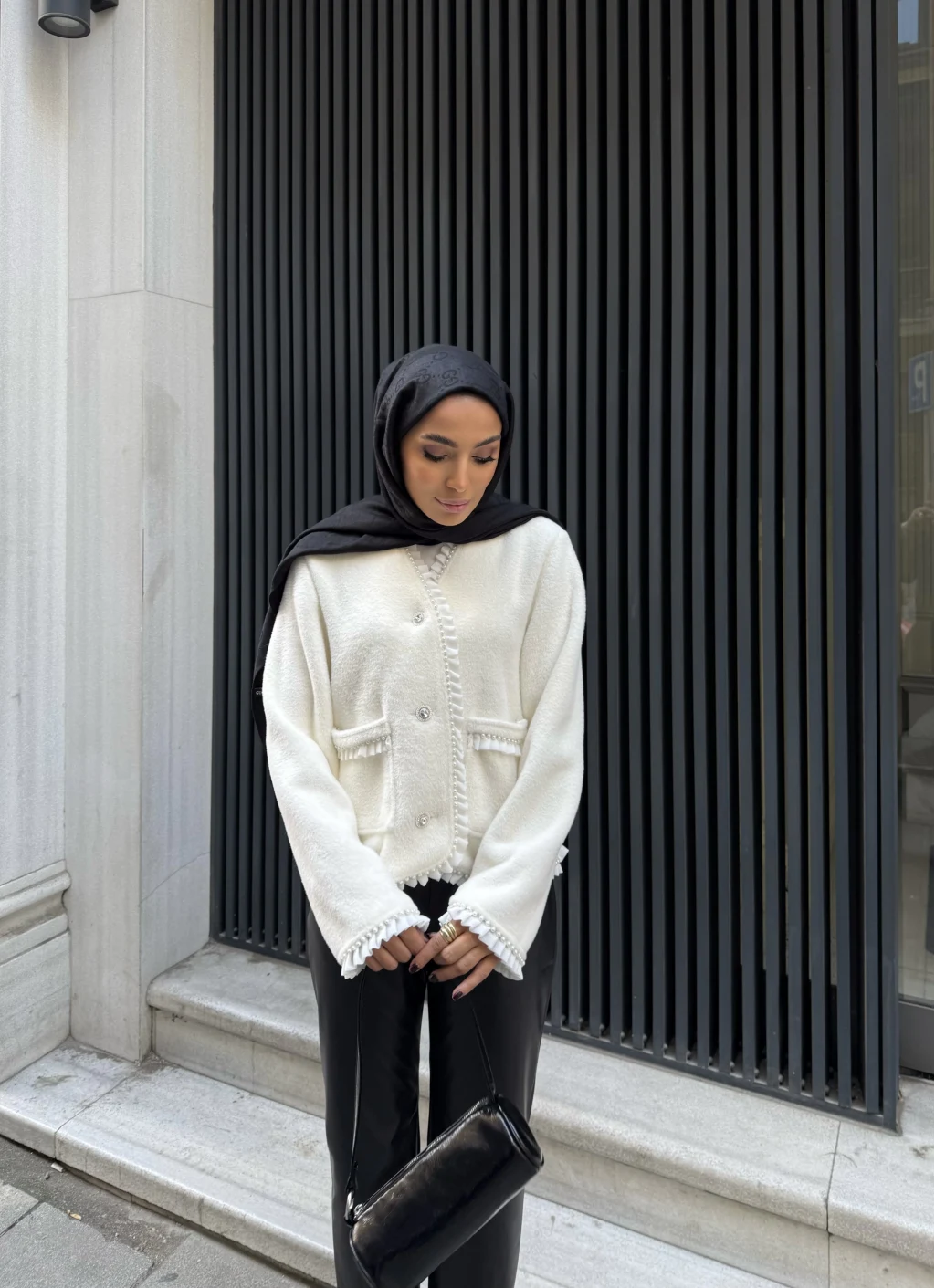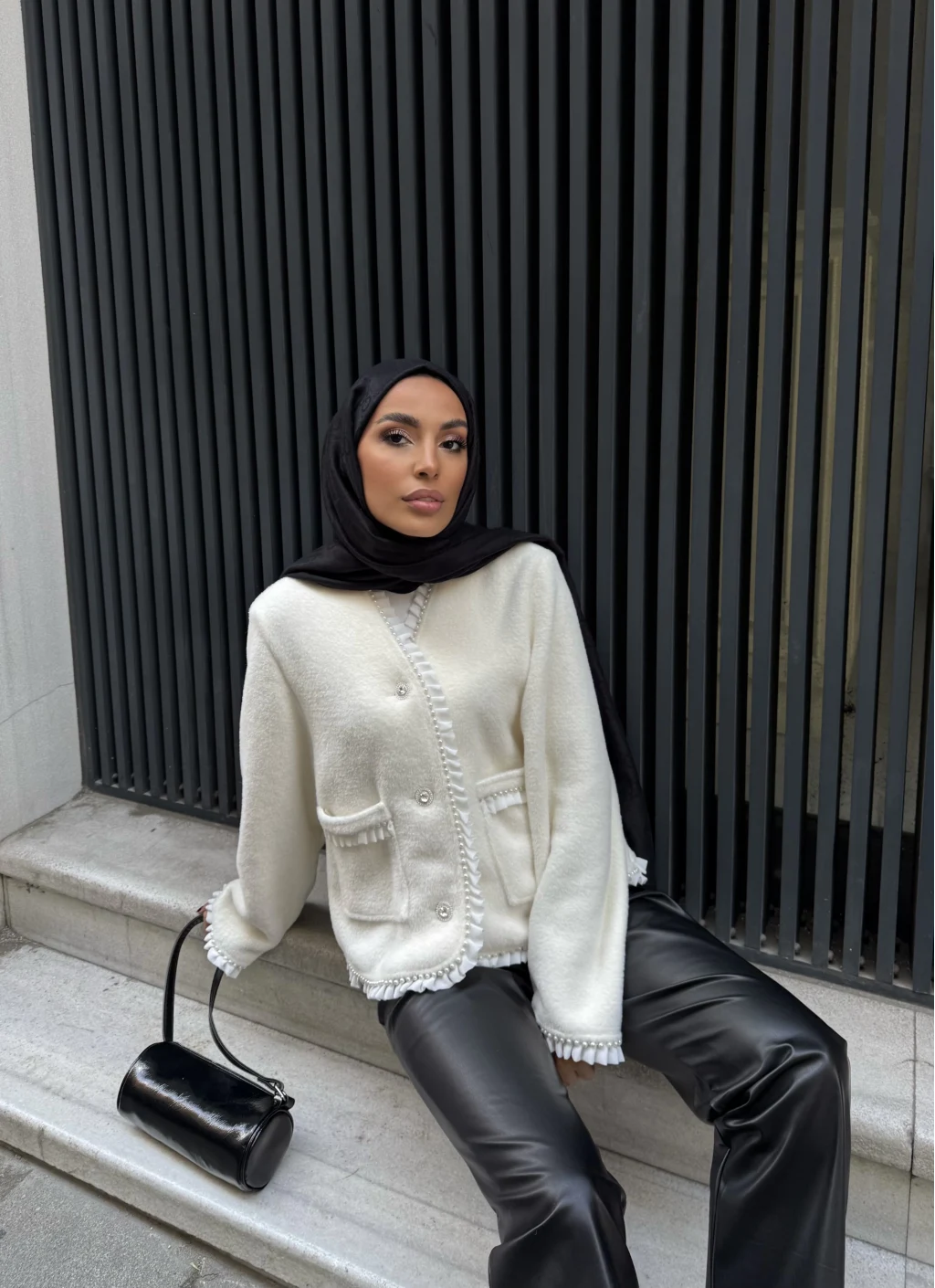 İnci Şerit Detaylı Kürk Ceket - Beyaz