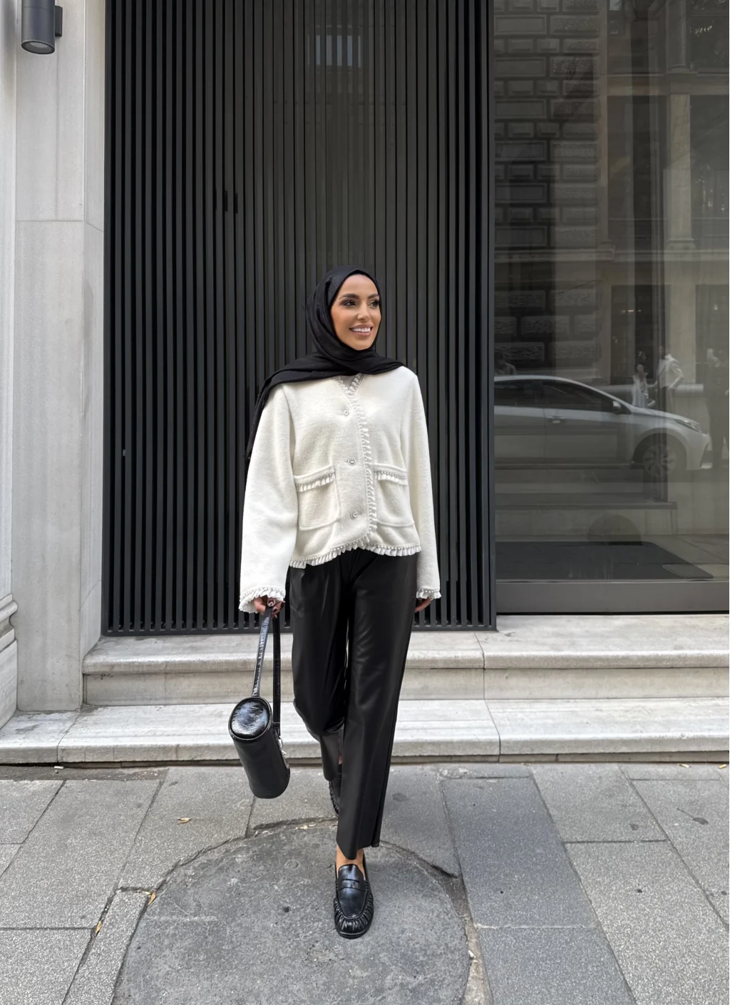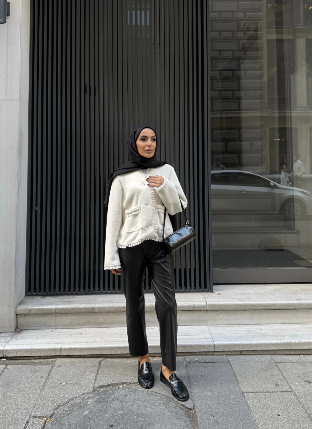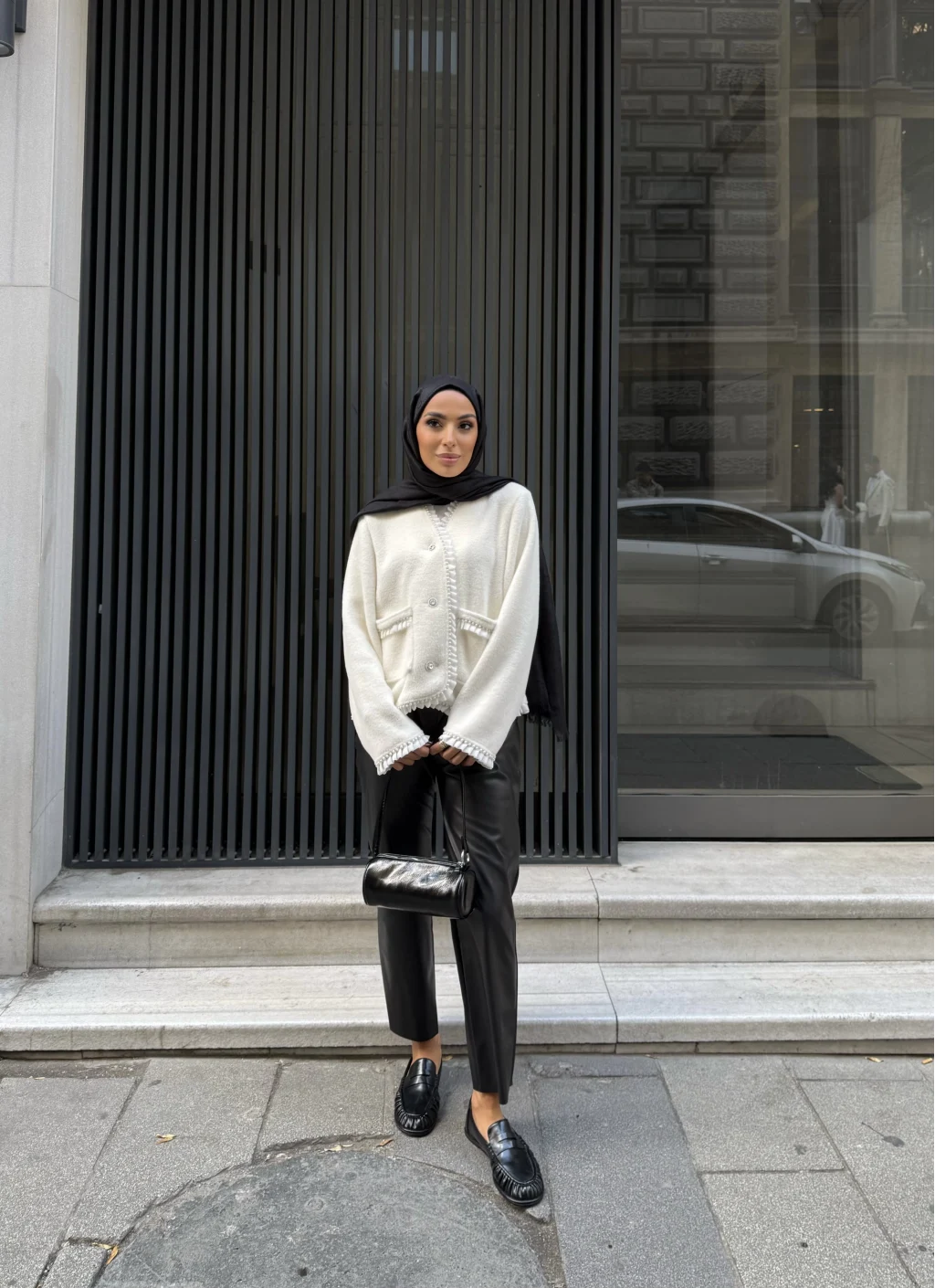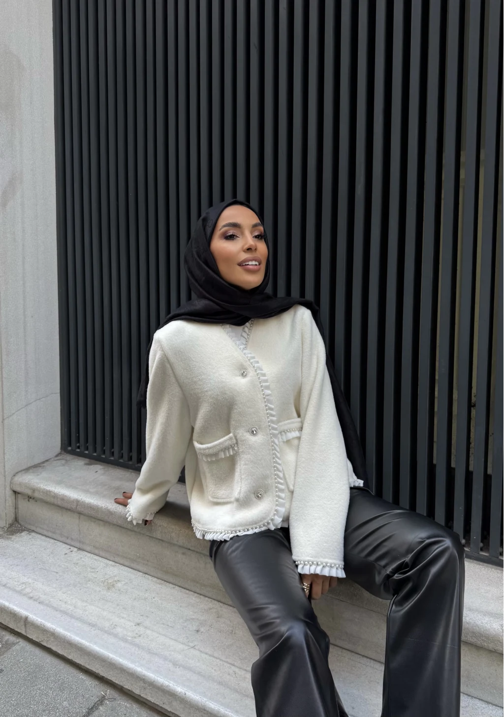 İnci Şerit Detaylı Kürk Ceket - Beyaz