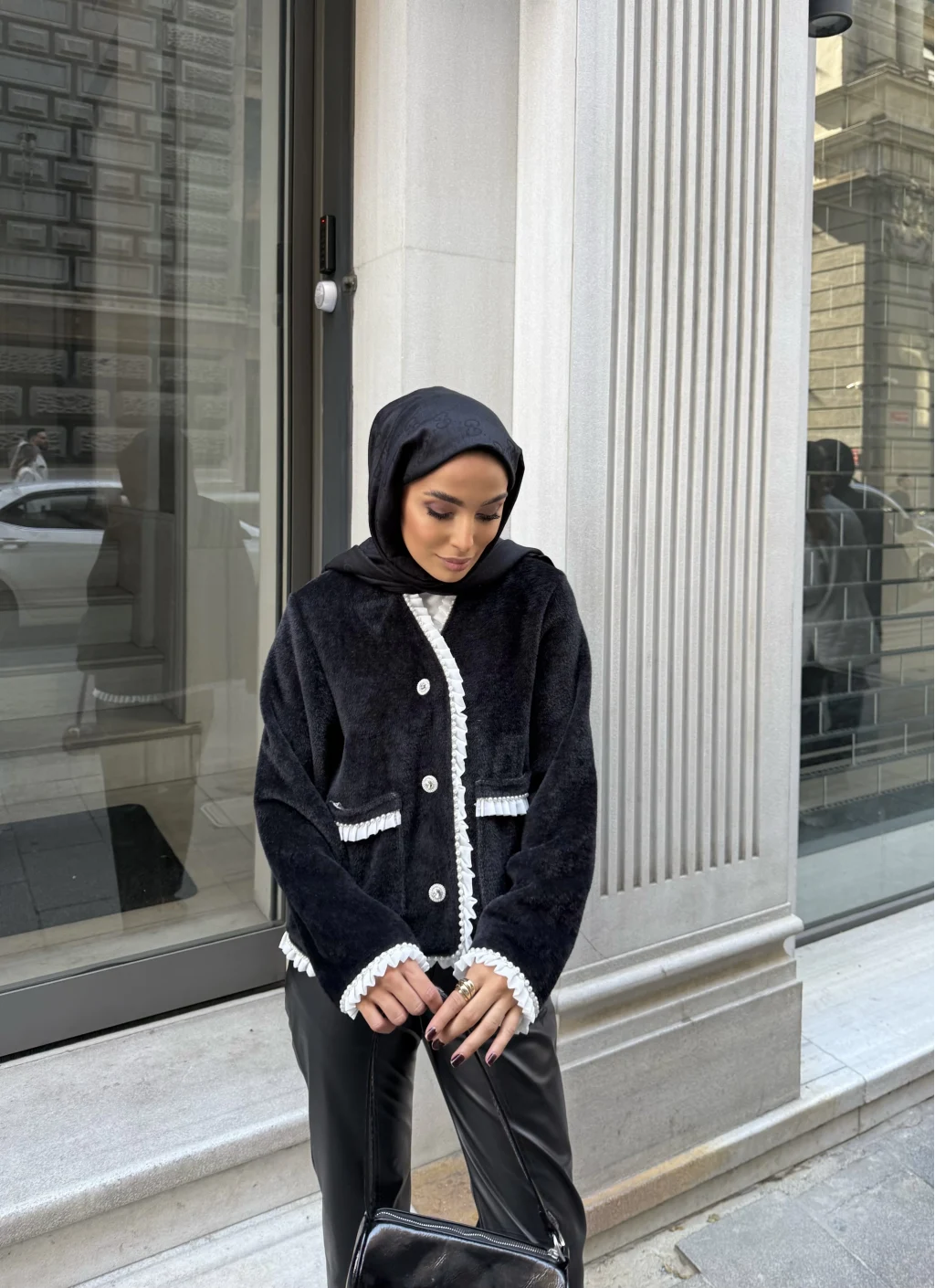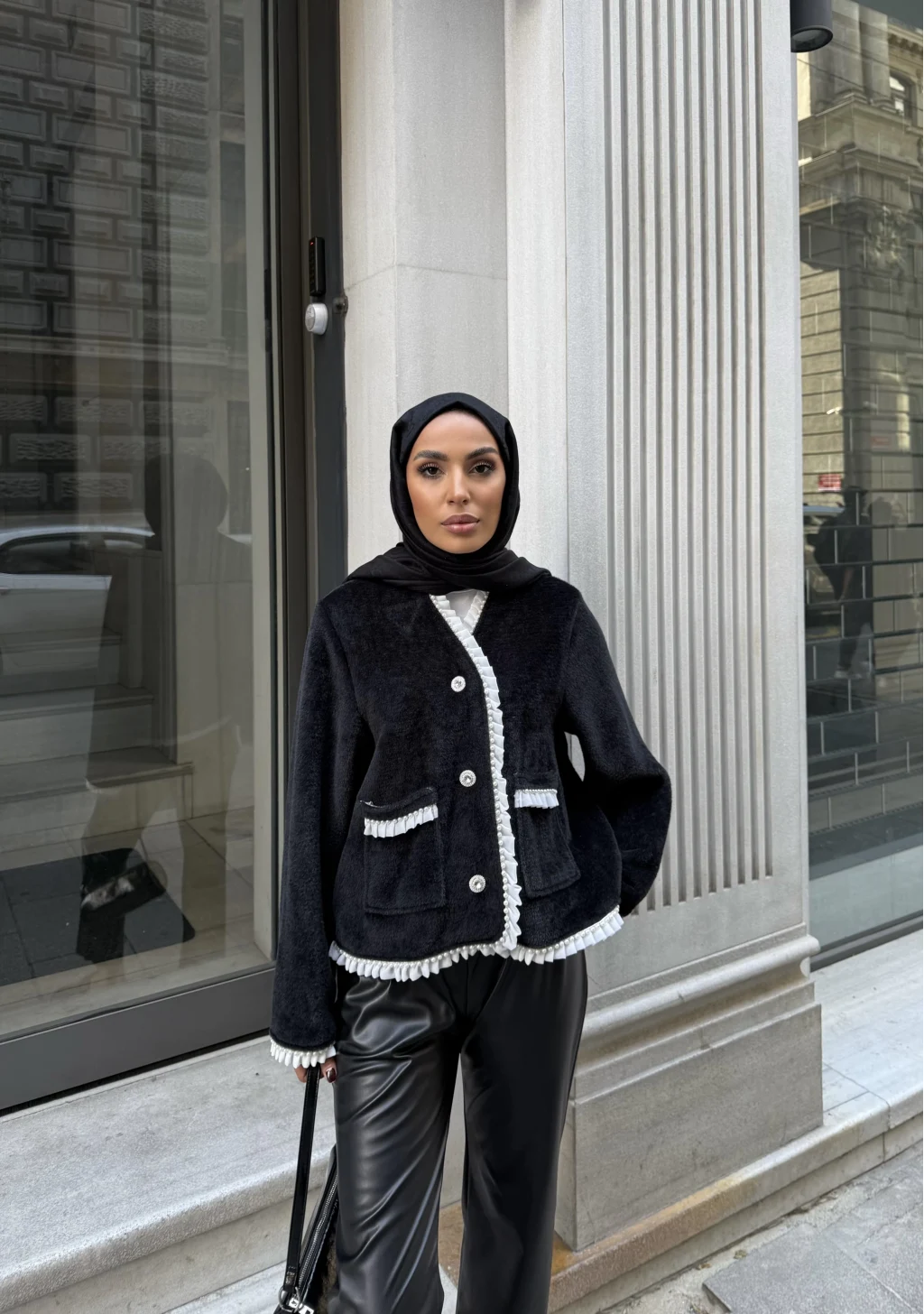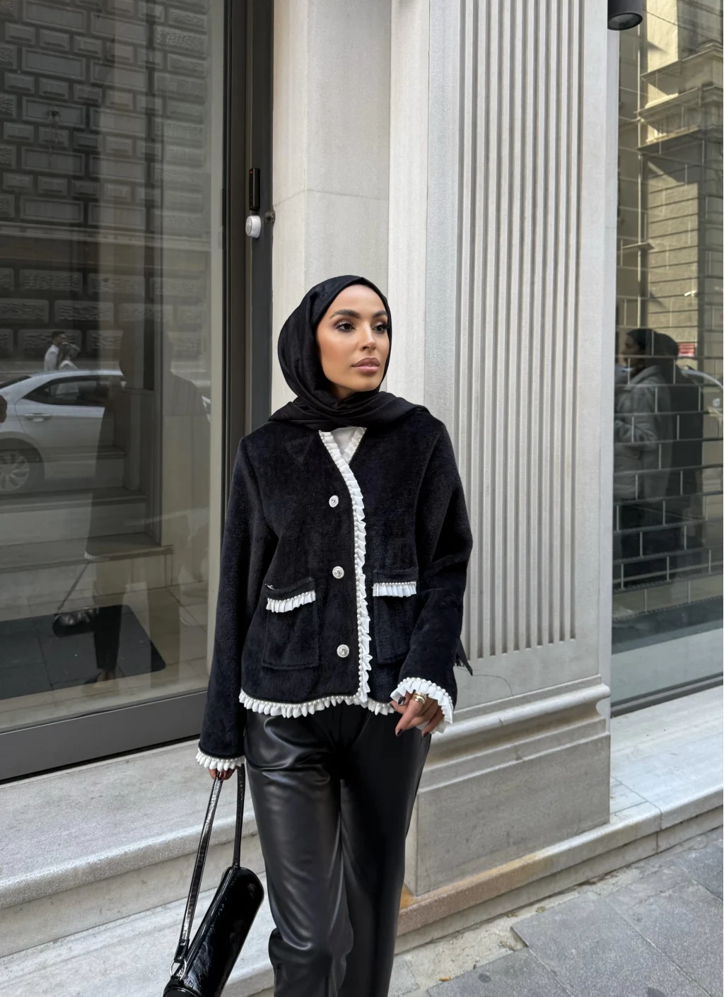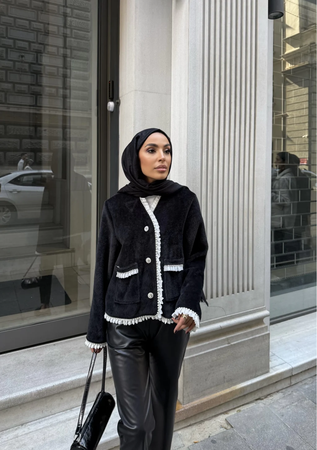 İnci Şerit Detaylı Kürk Ceket - Siyah