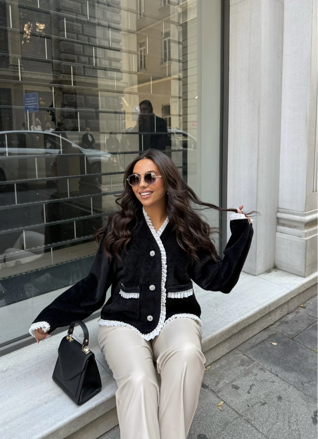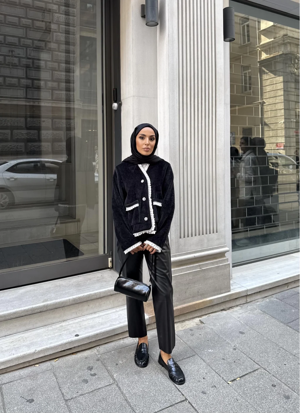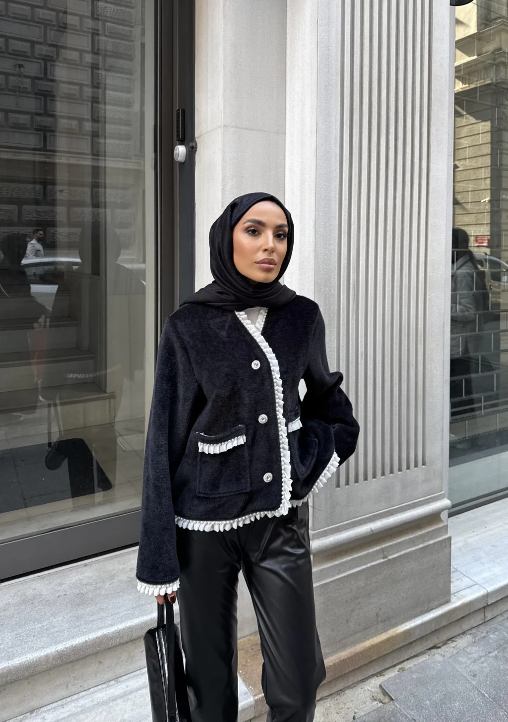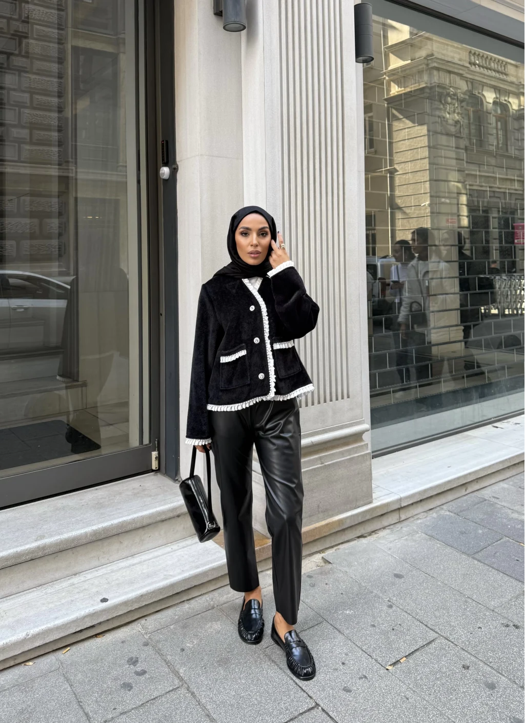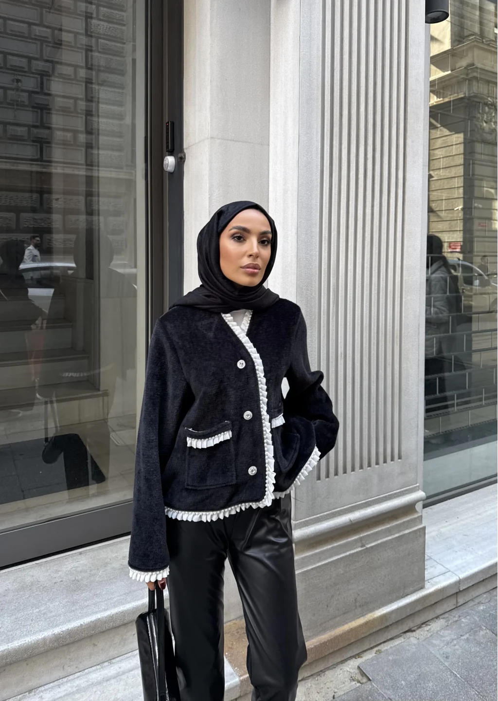 İnci Şerit Detaylı Kürk Ceket - Siyah