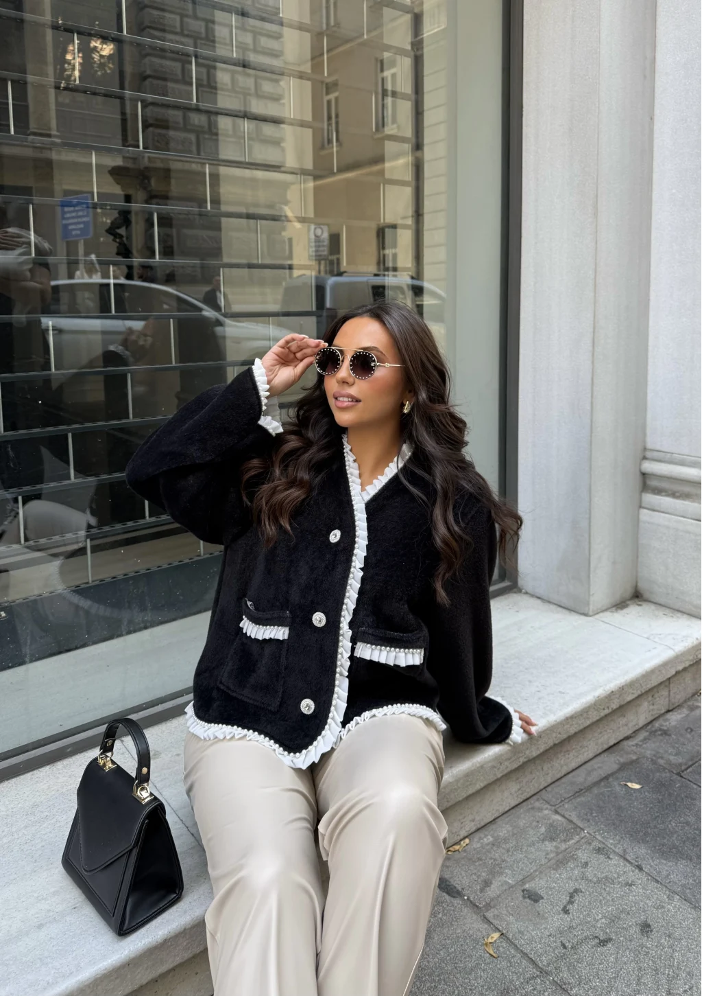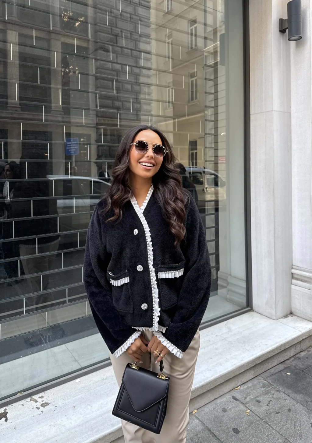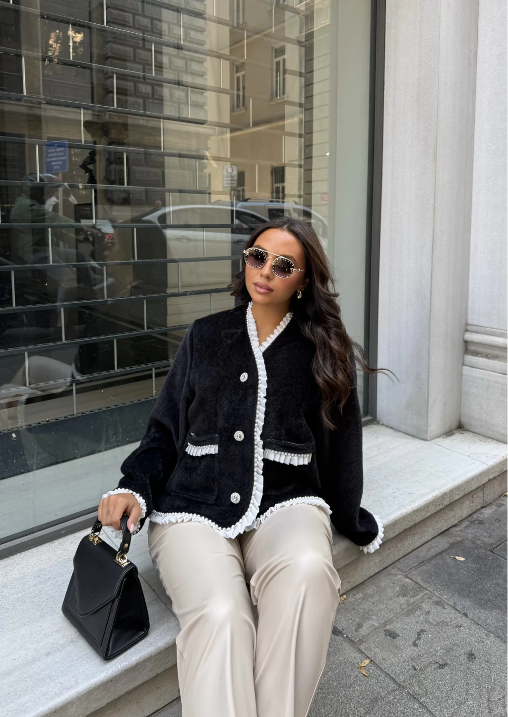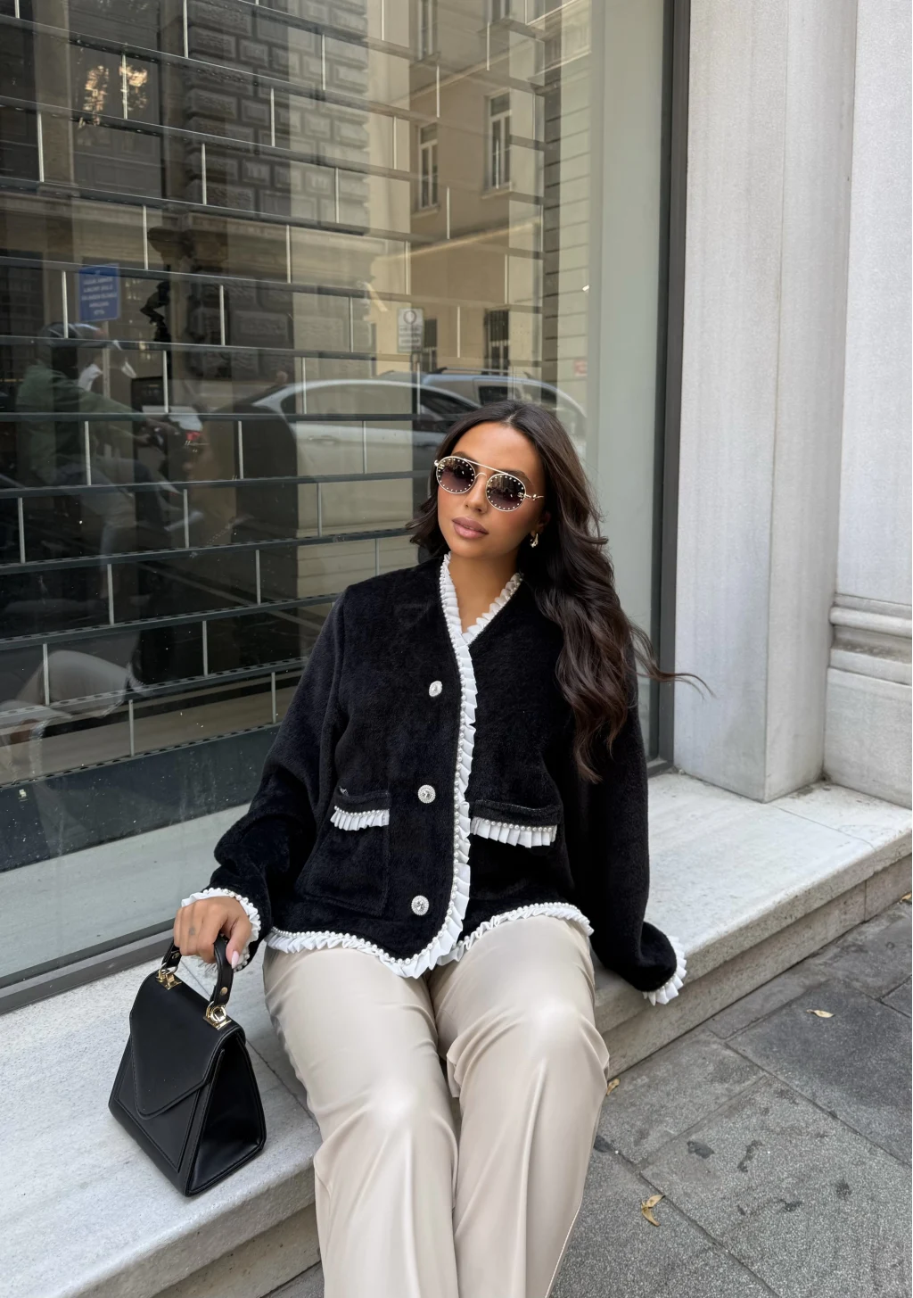 İnci Şerit Detaylı Kürk Ceket - Siyah