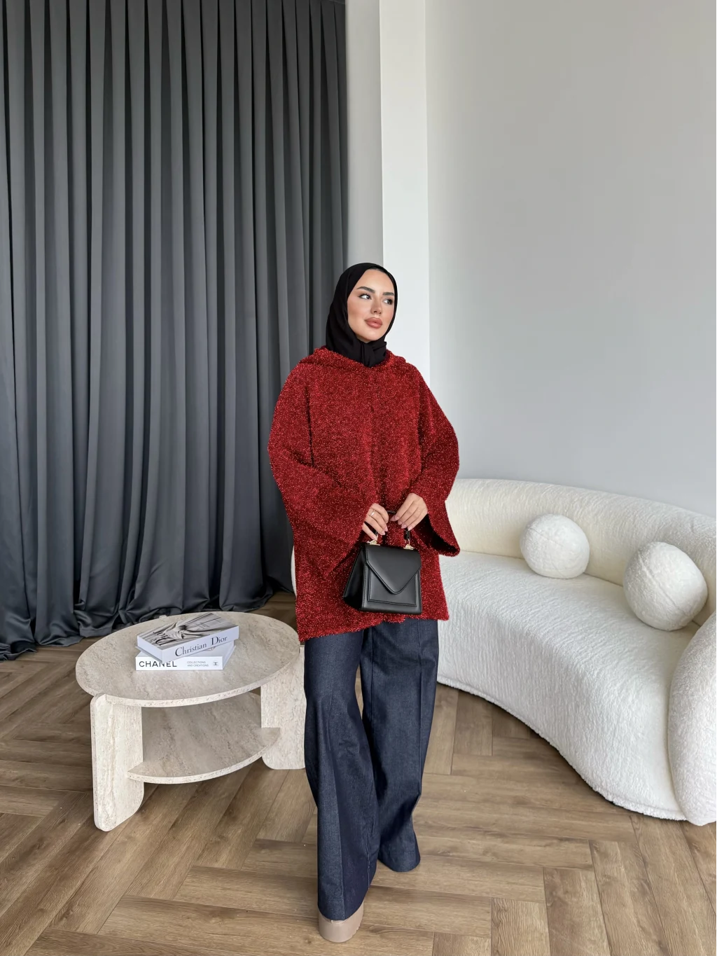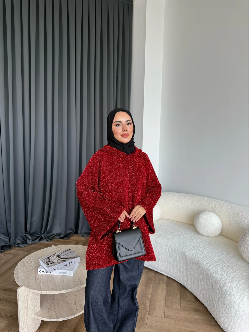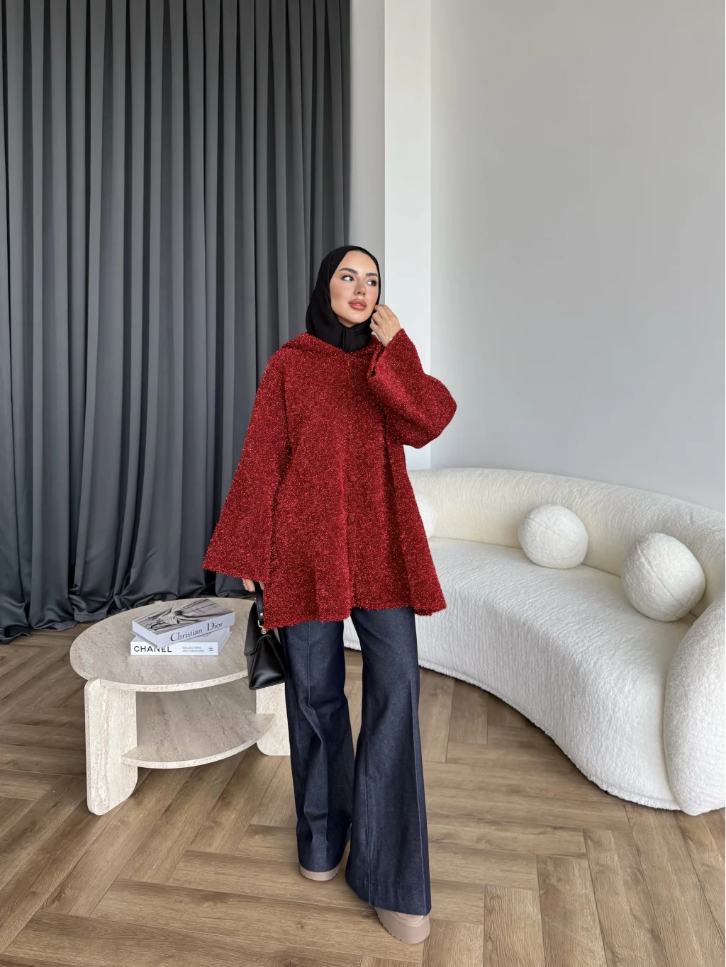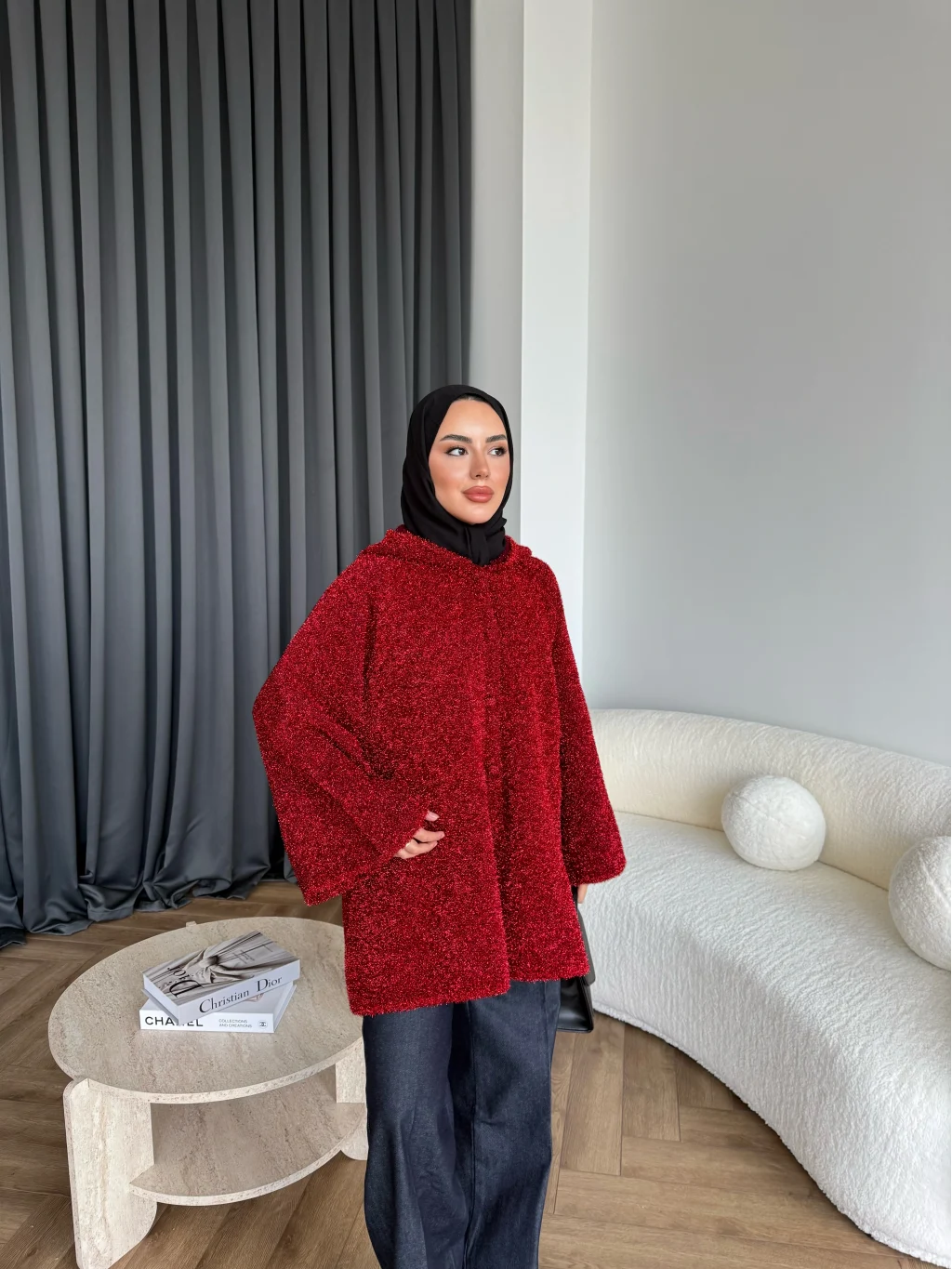 Kapşonlu Simli Hırka - Bordo