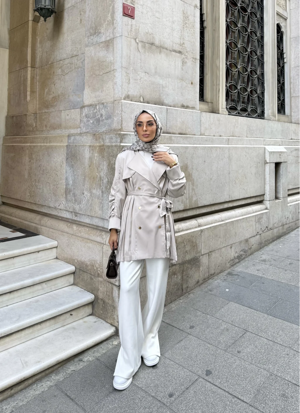 Kolları Büzgülü Sırtı Piliseli Saten Ceket - Bej