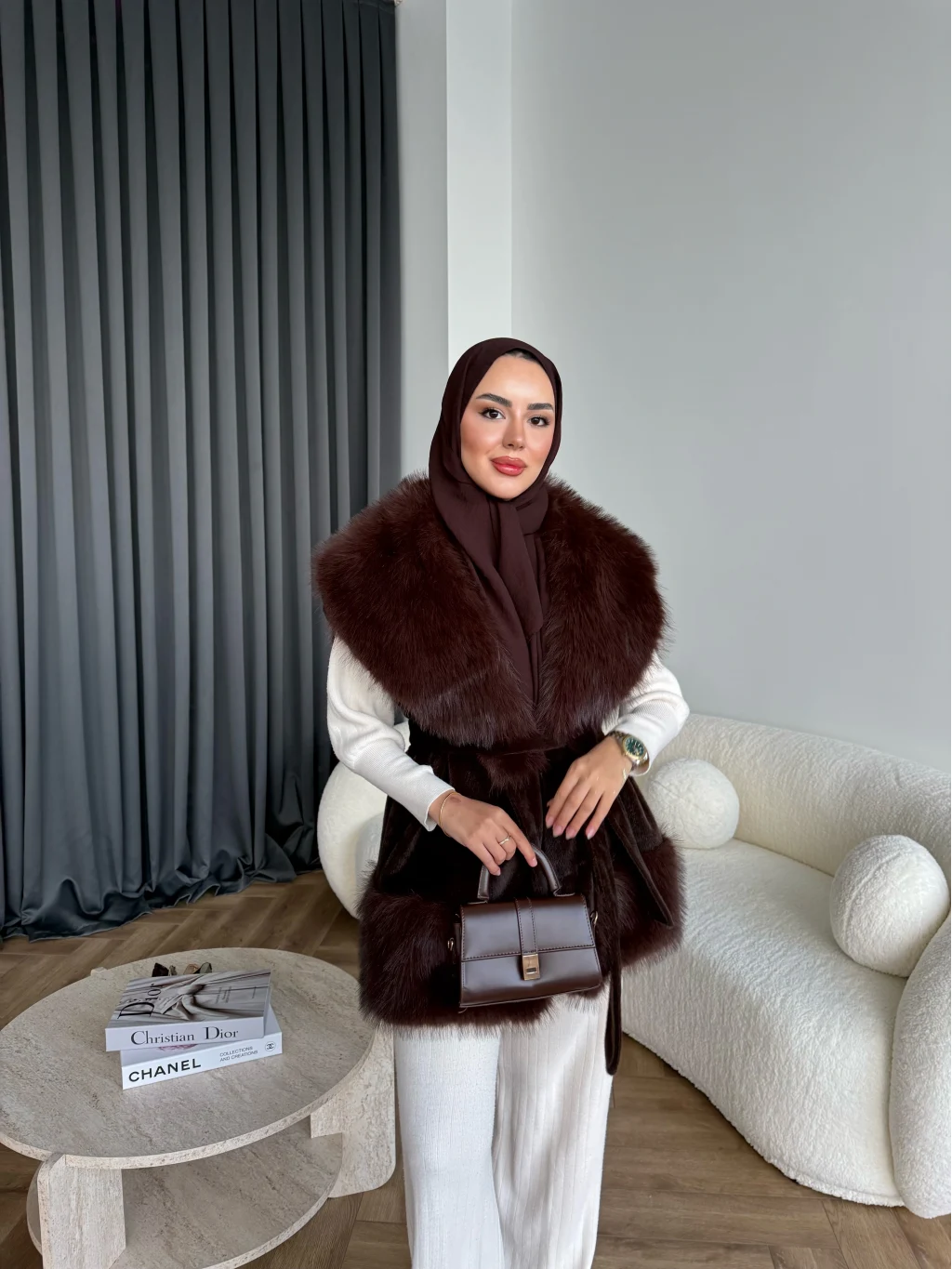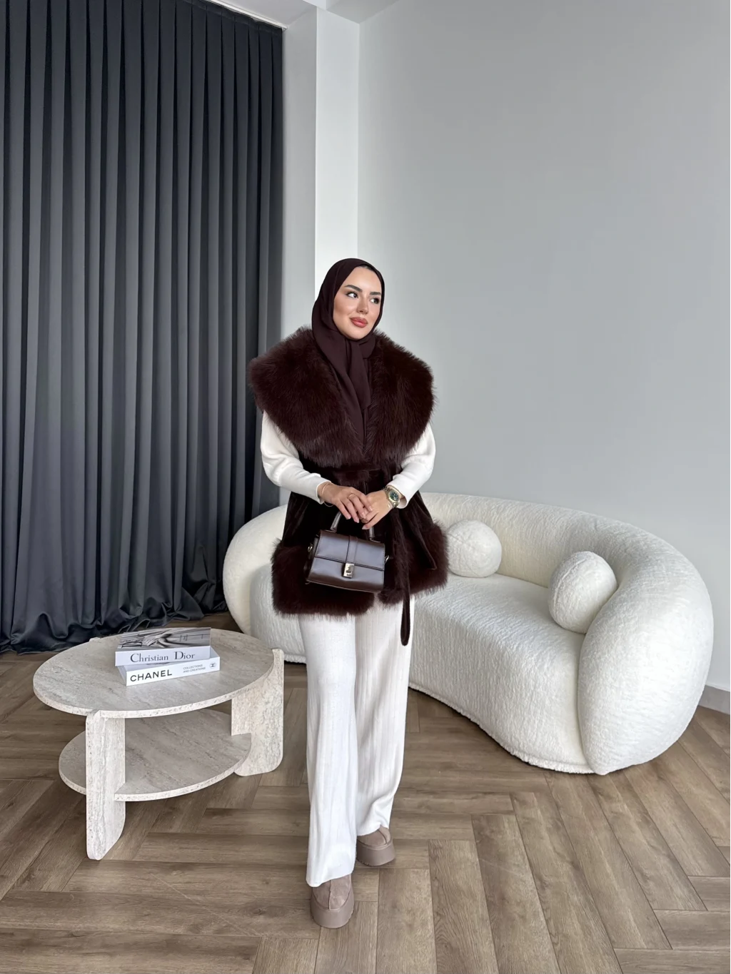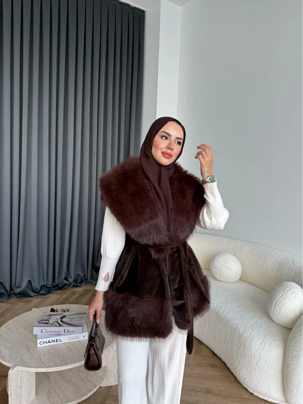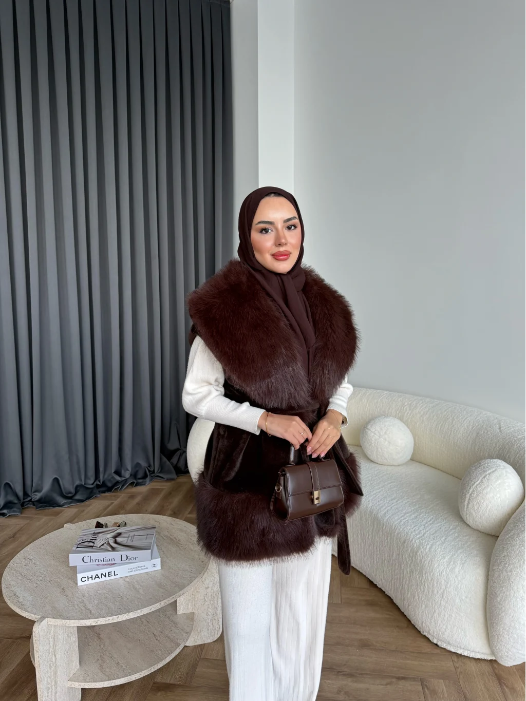 Lakas Yaka Ve Alt Kısmı Kürk Detaylı Yelek - Acı Kahve