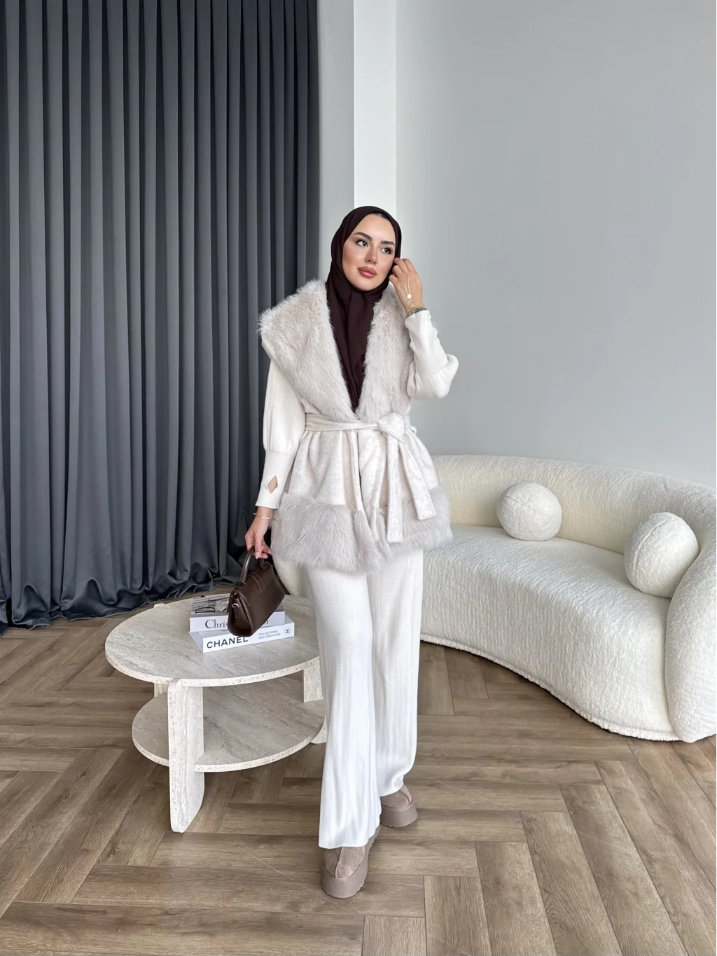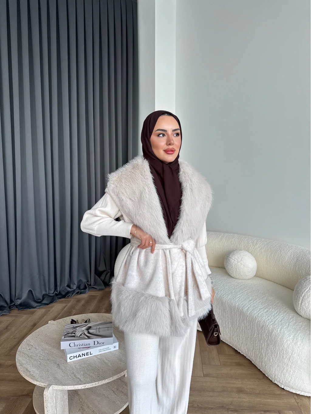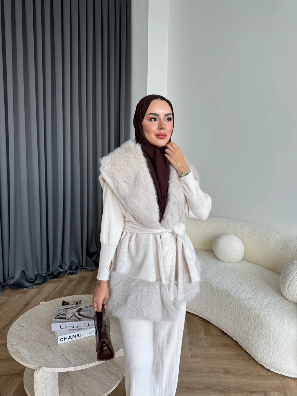 Lakas Yaka Ve Alt Kısmı Kürk Detaylı Yelek - Bej
