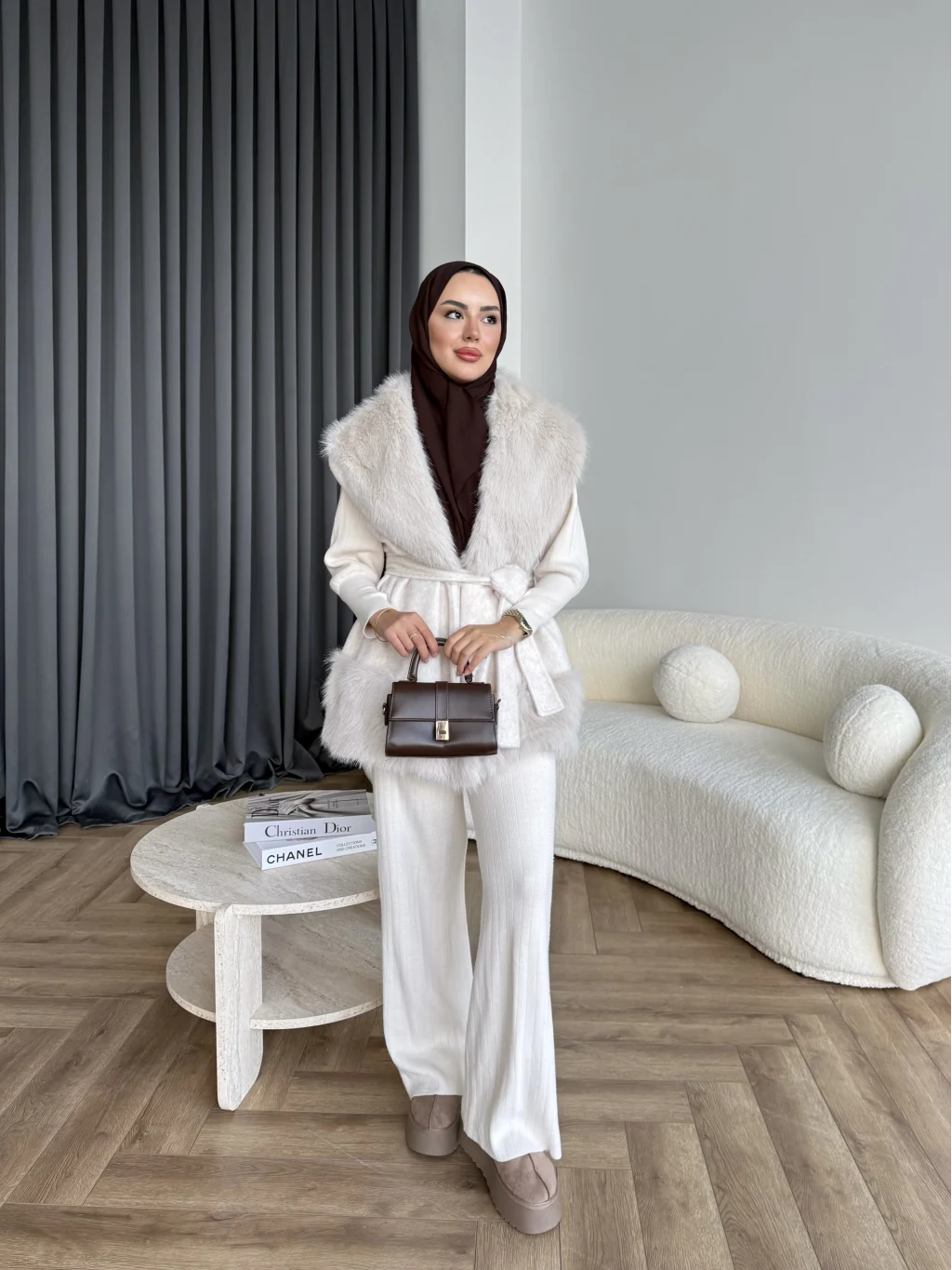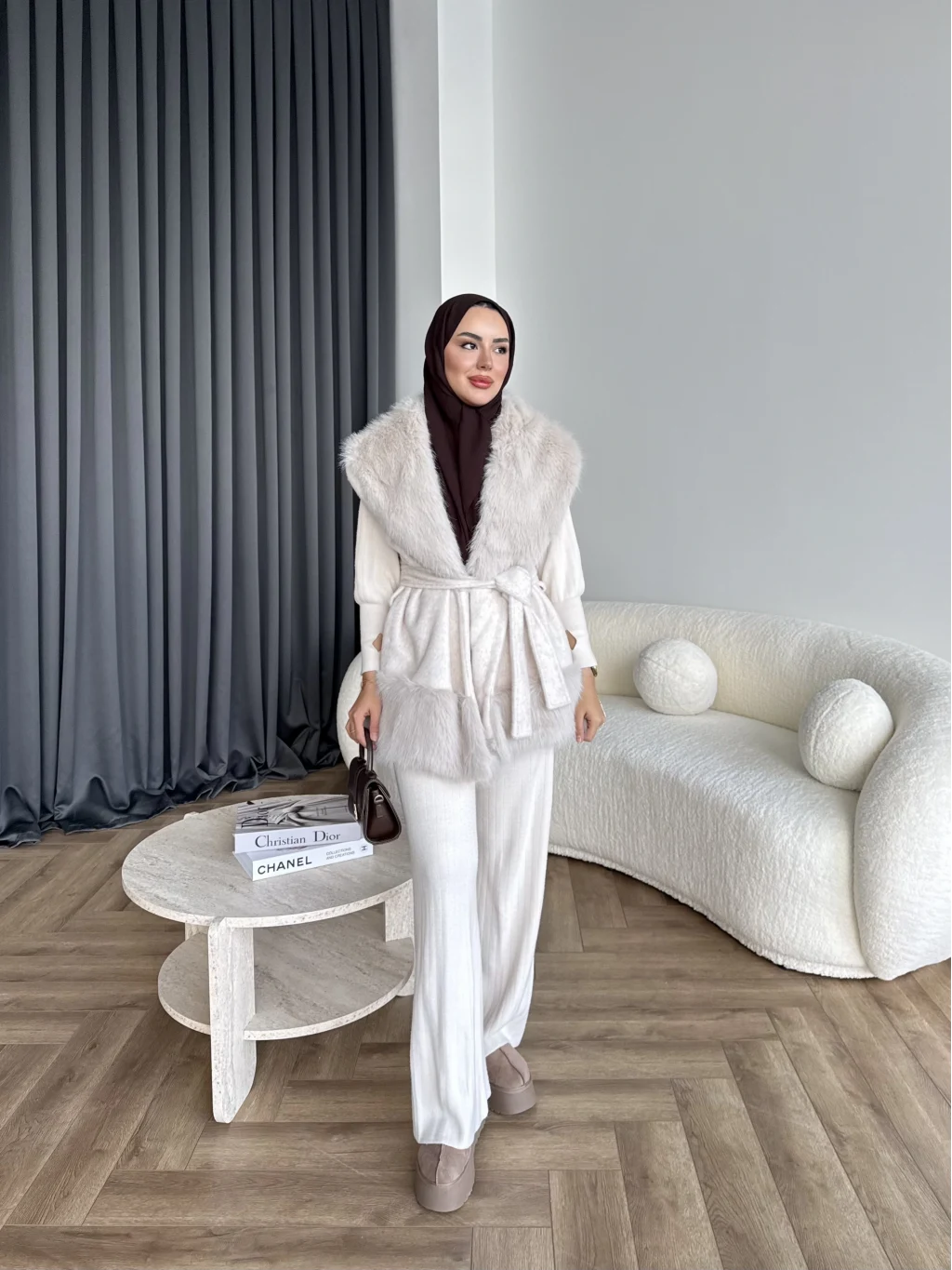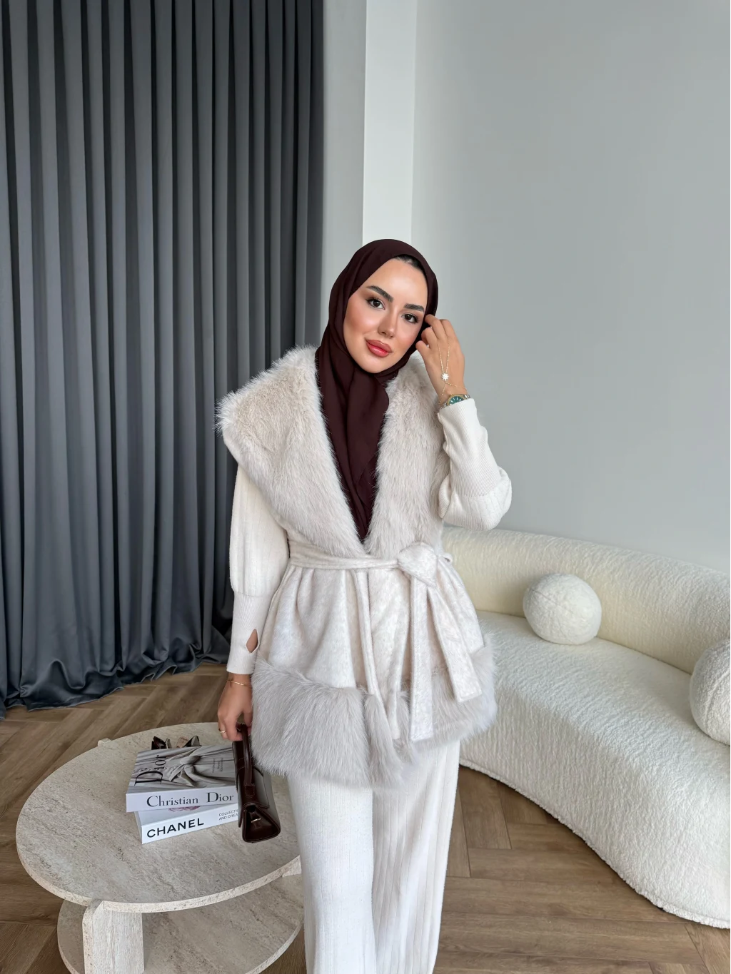 Lakas Yaka Ve Alt Kısmı Kürk Detaylı Yelek - Bej