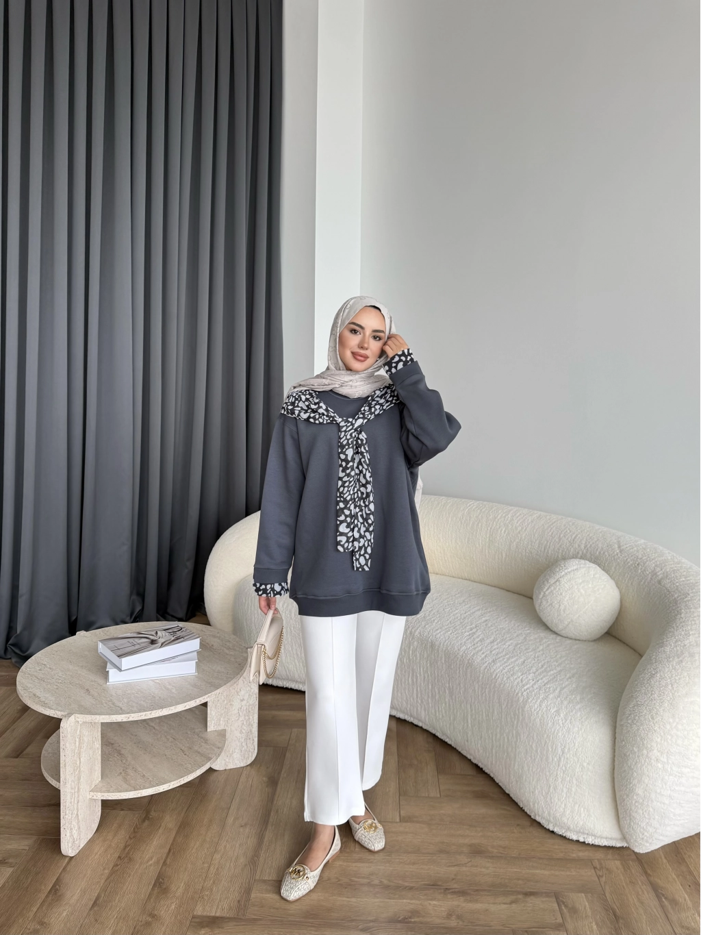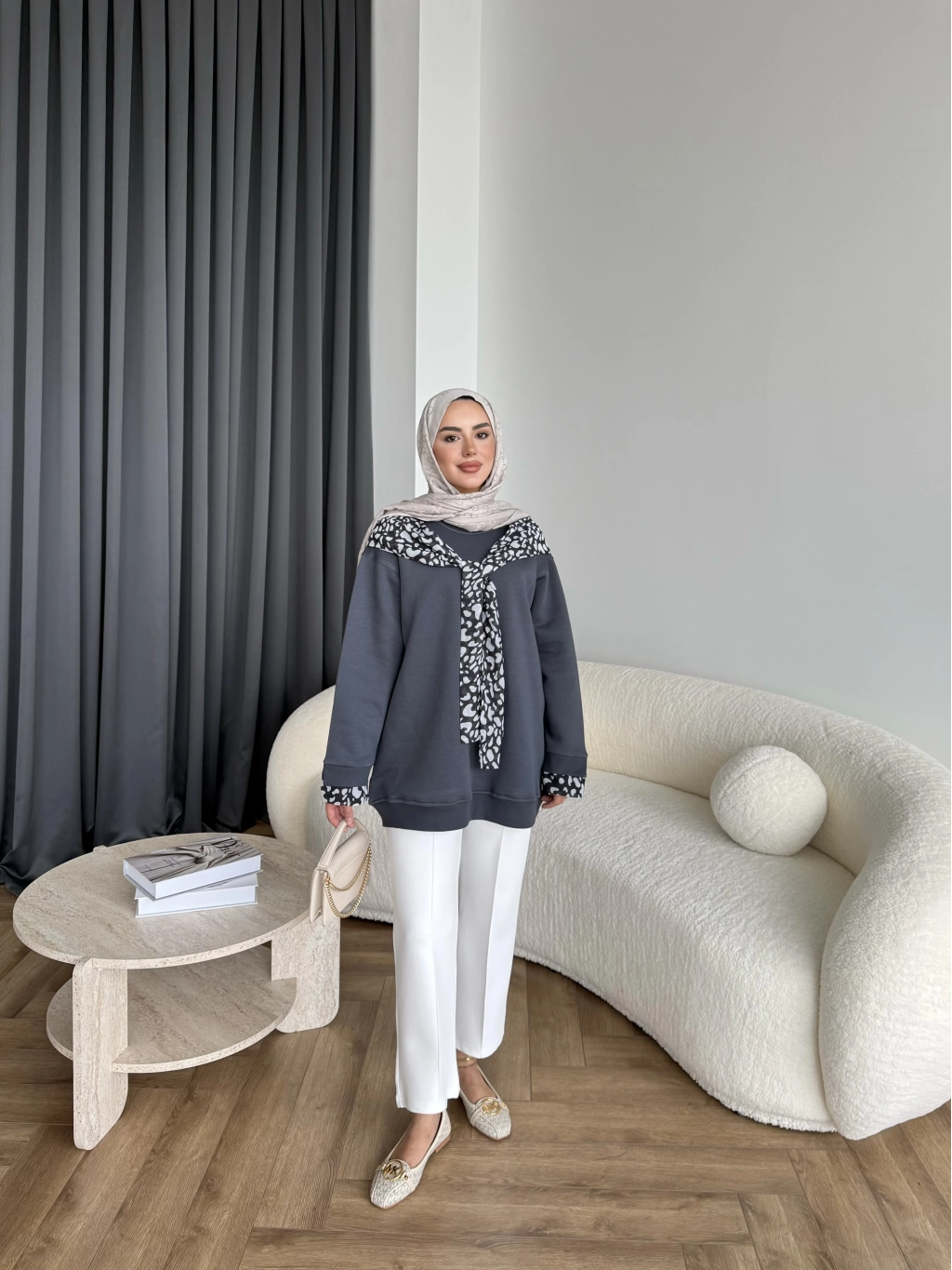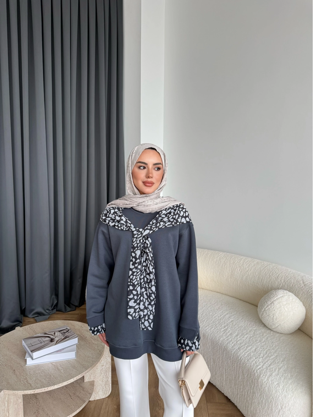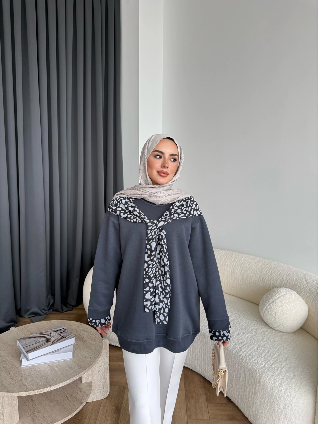 Leopar Fularlı Sweat - Antrasit