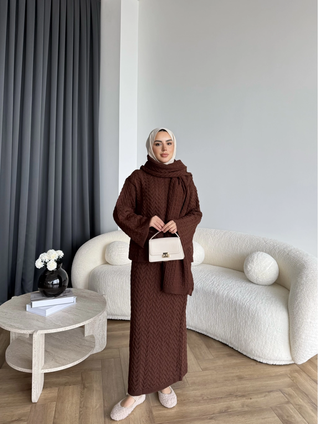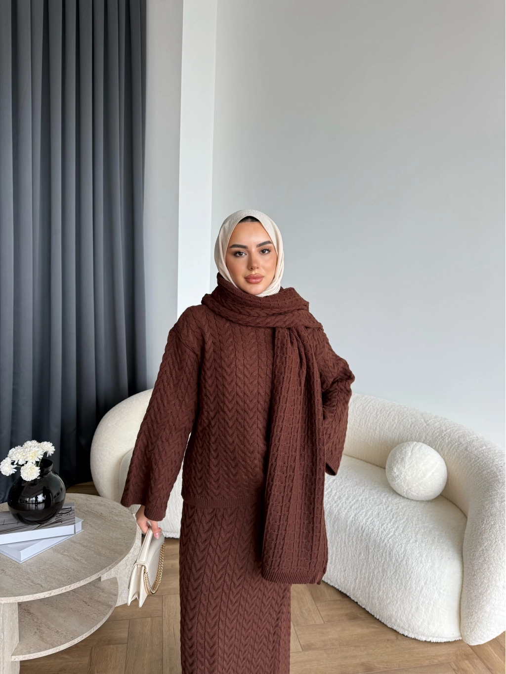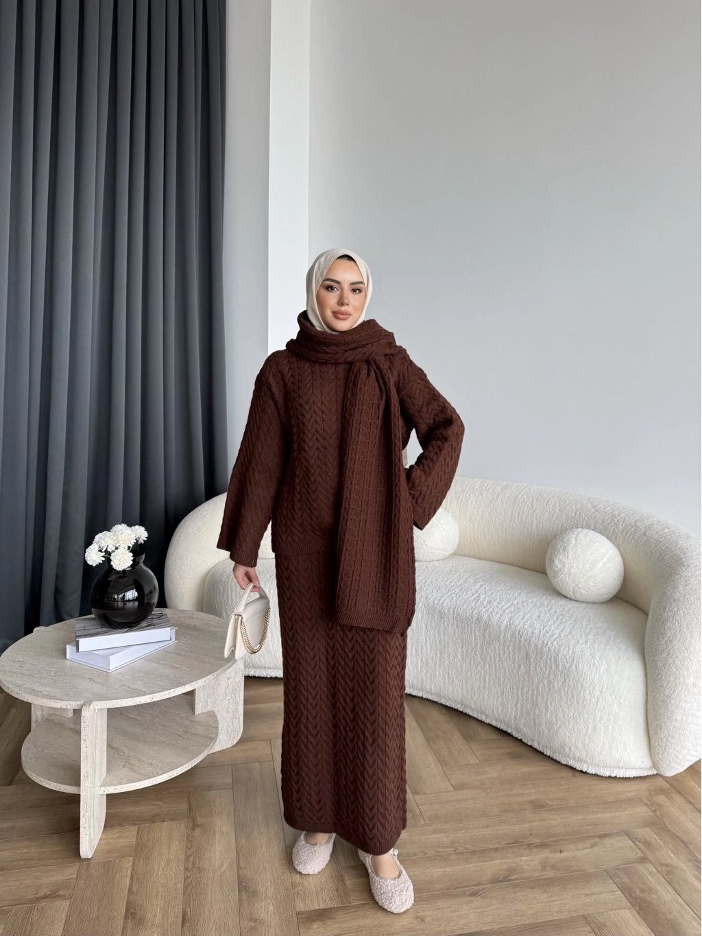 Mb - Atkı Örgü Etekli Takım - Acı Kahve