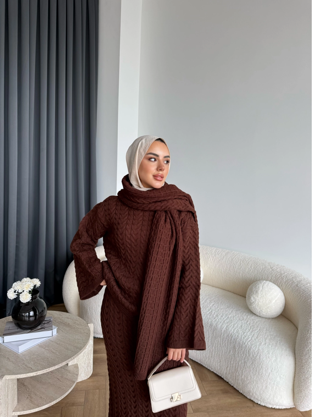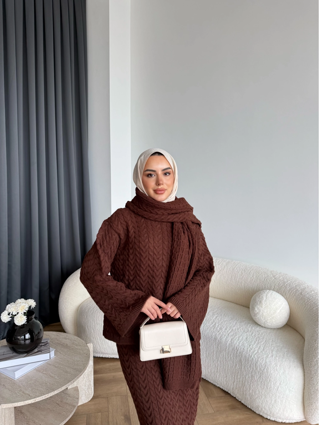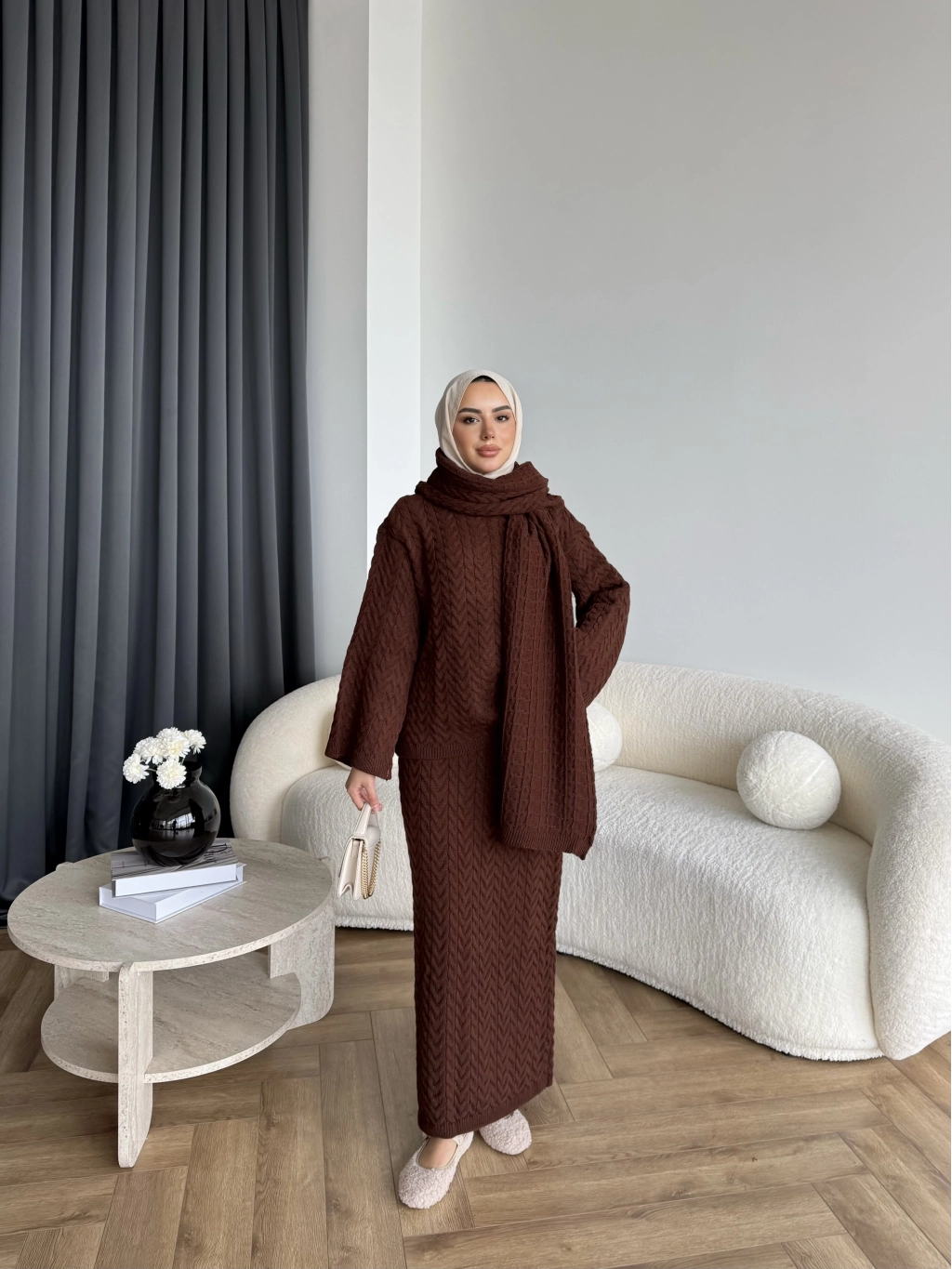 Mb - Atkı Örgü Etekli Takım - Acı Kahve