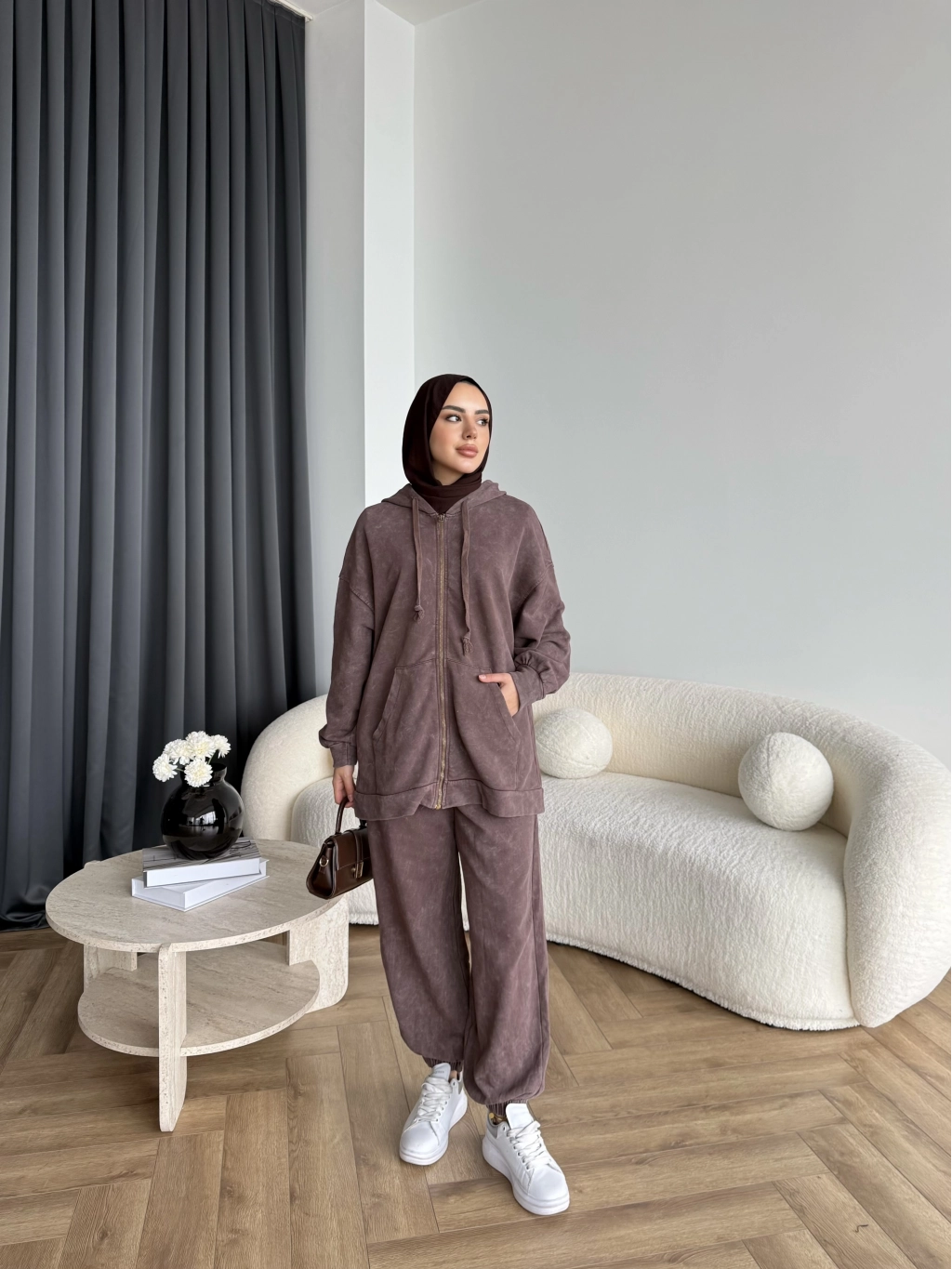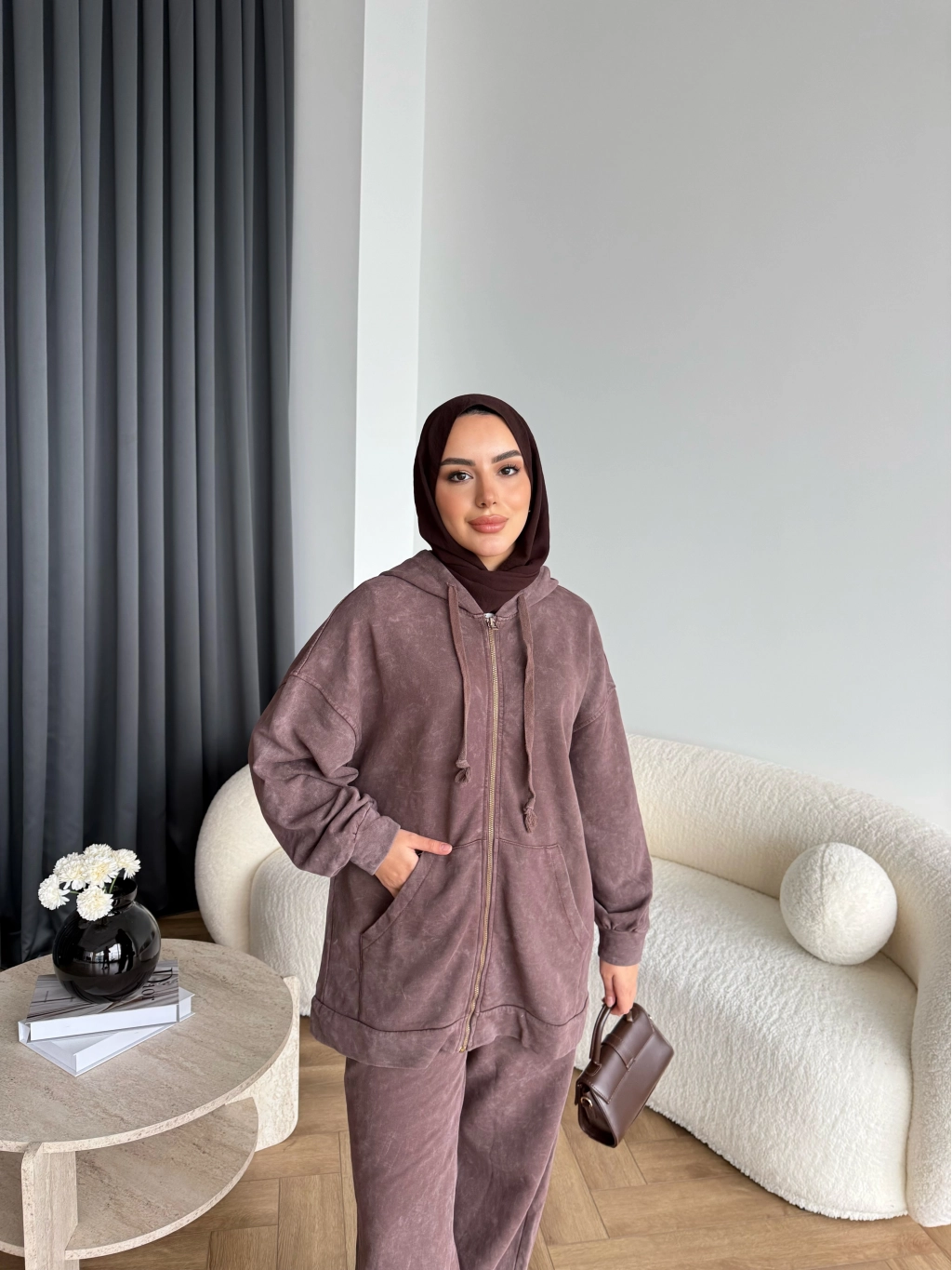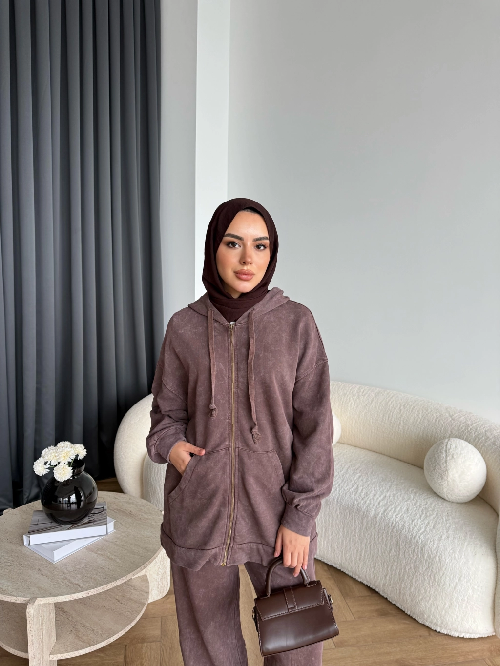 Mb - Fermuar Detay Yıkamalı Takım - Kahve