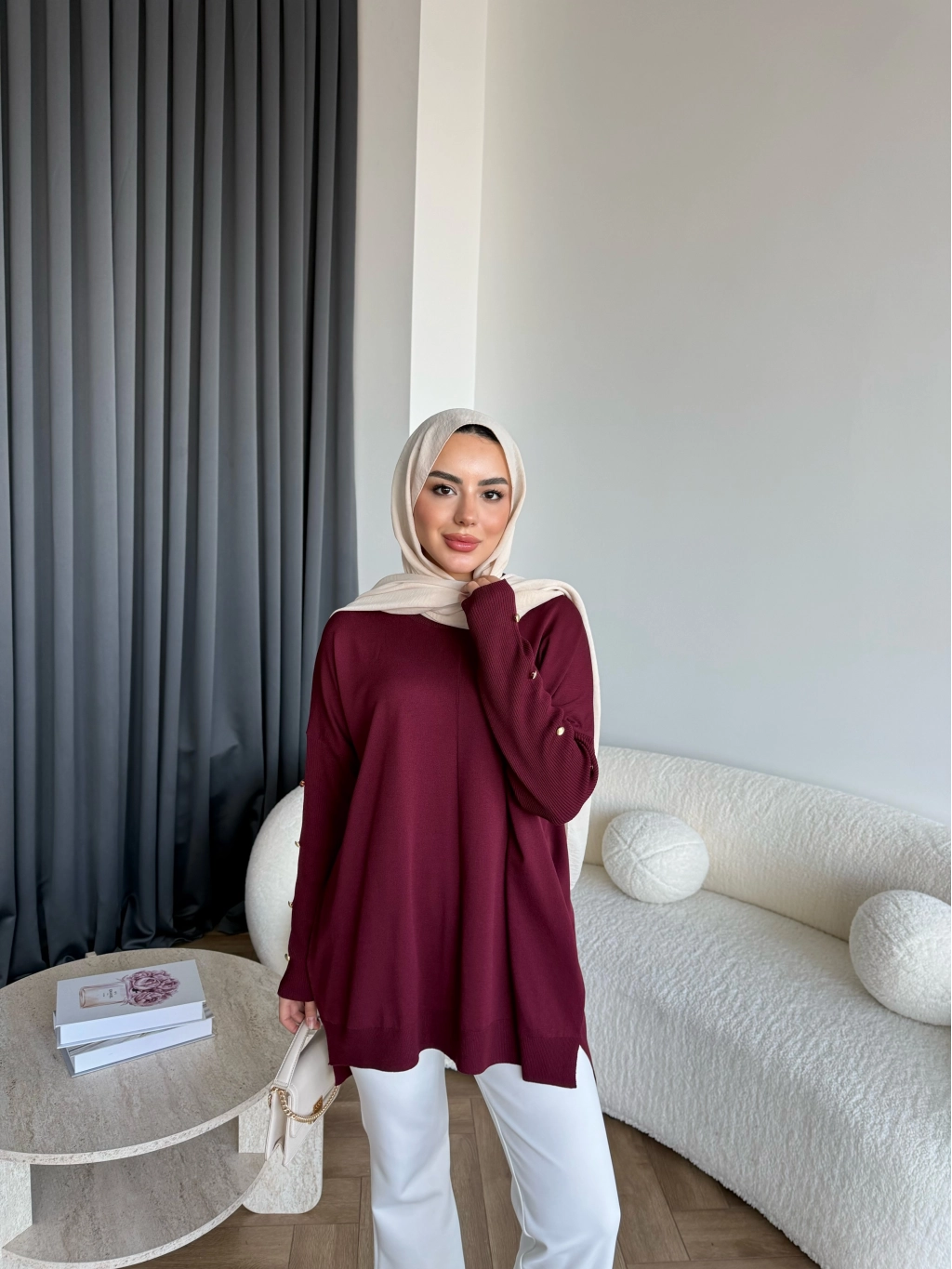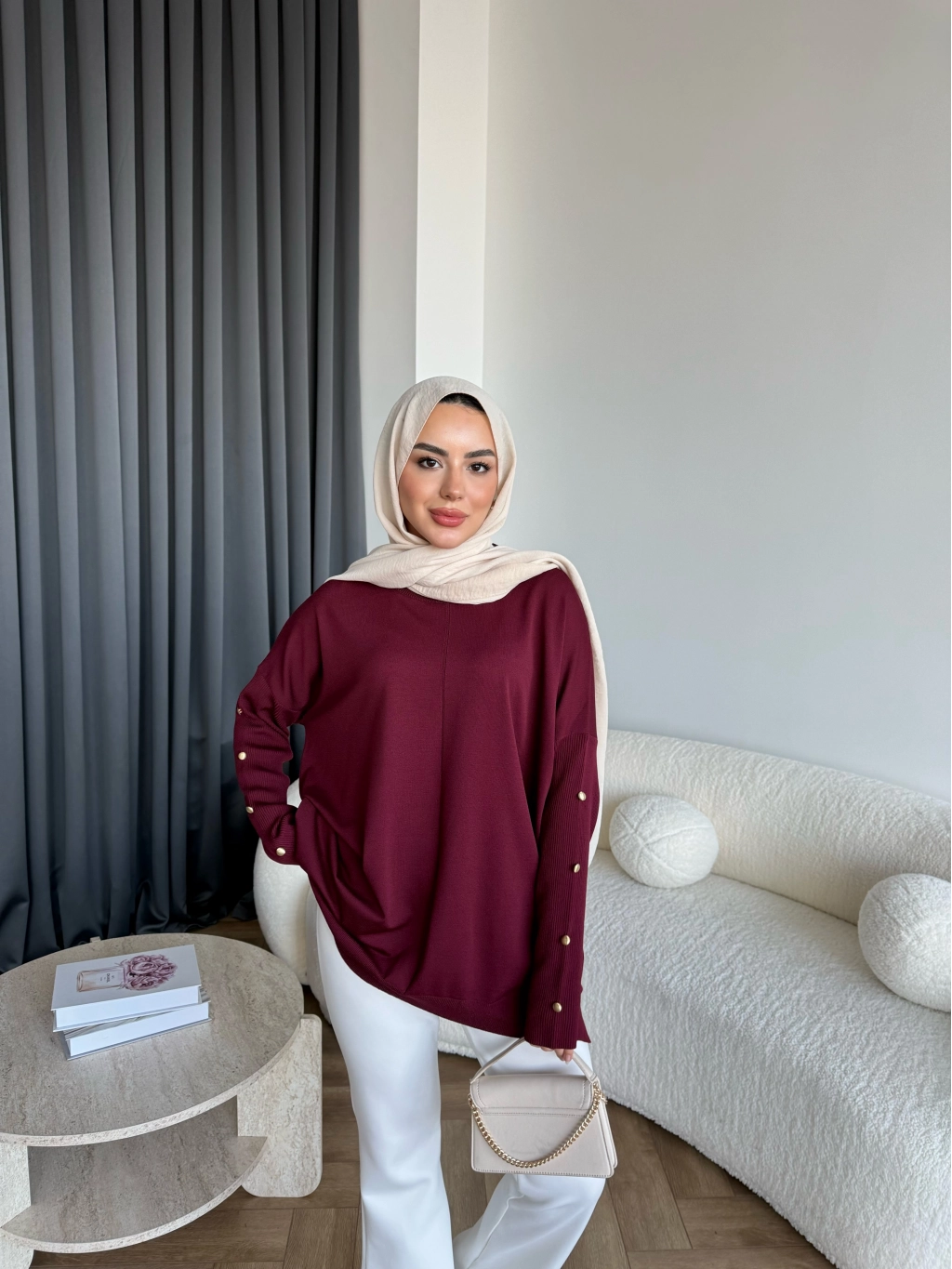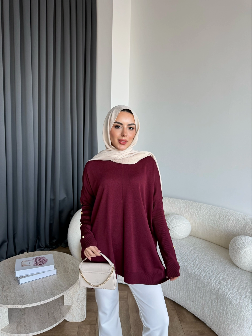 Nesy Kol Gold Düğmeli Triko Kazak - Bordo
