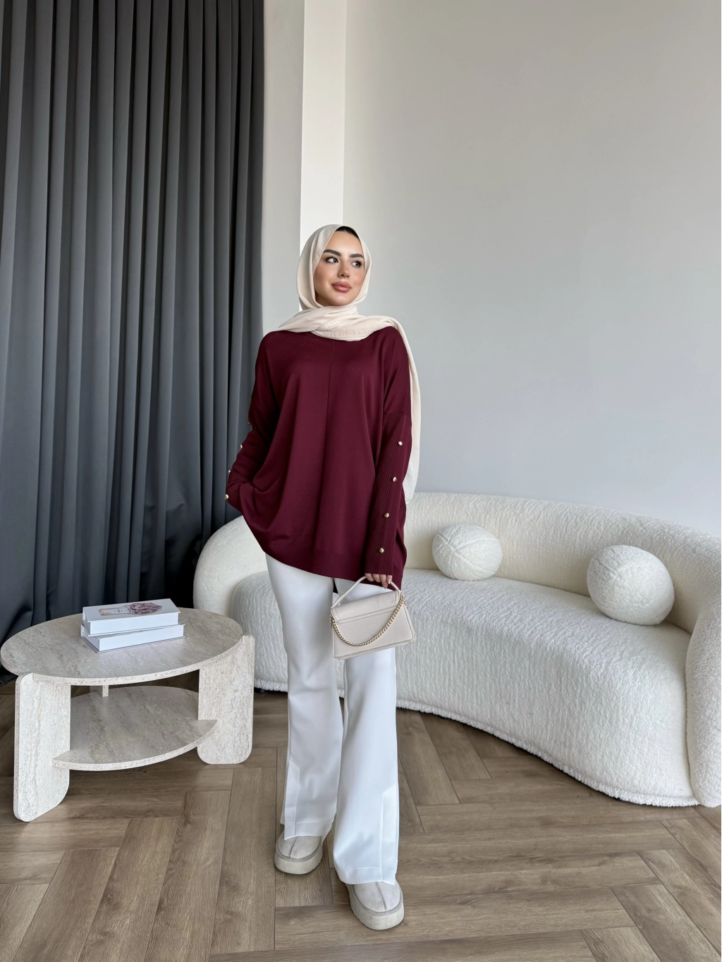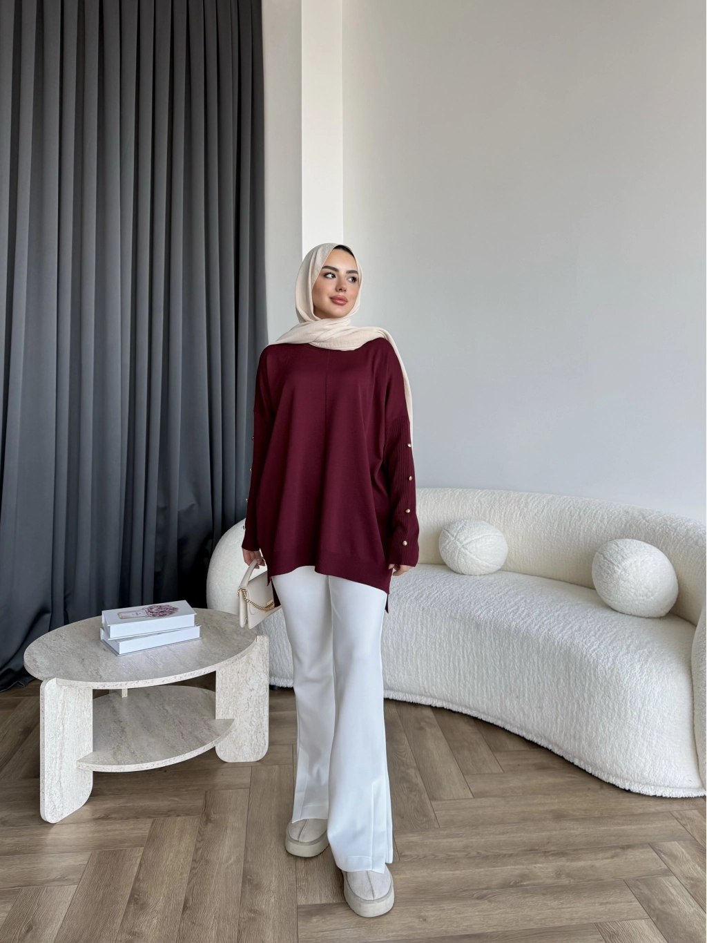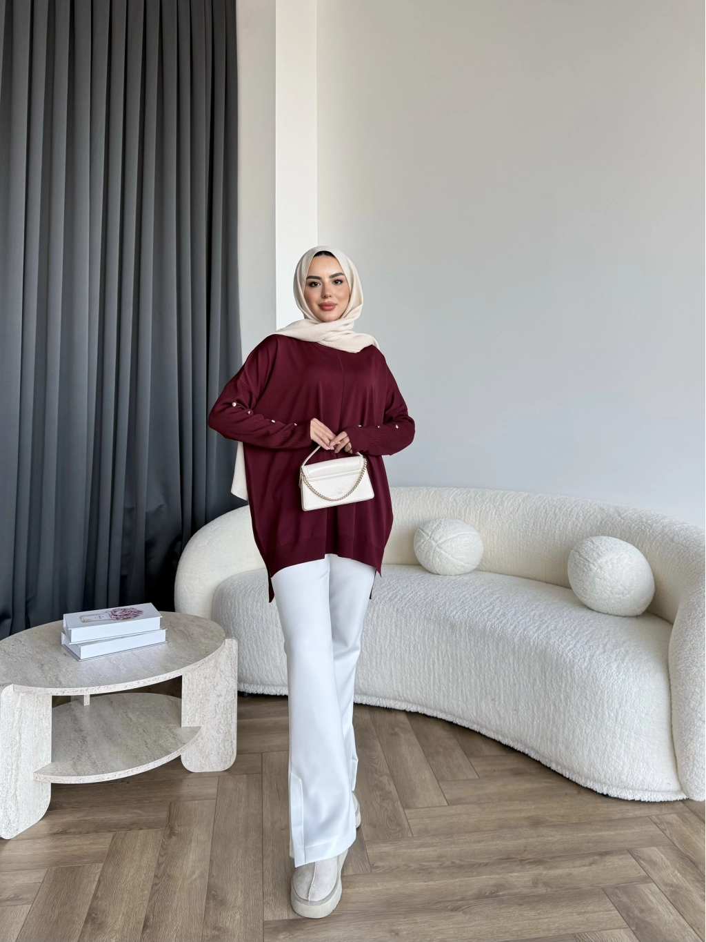 Nesy Kol Gold Düğmeli Triko Kazak - Bordo