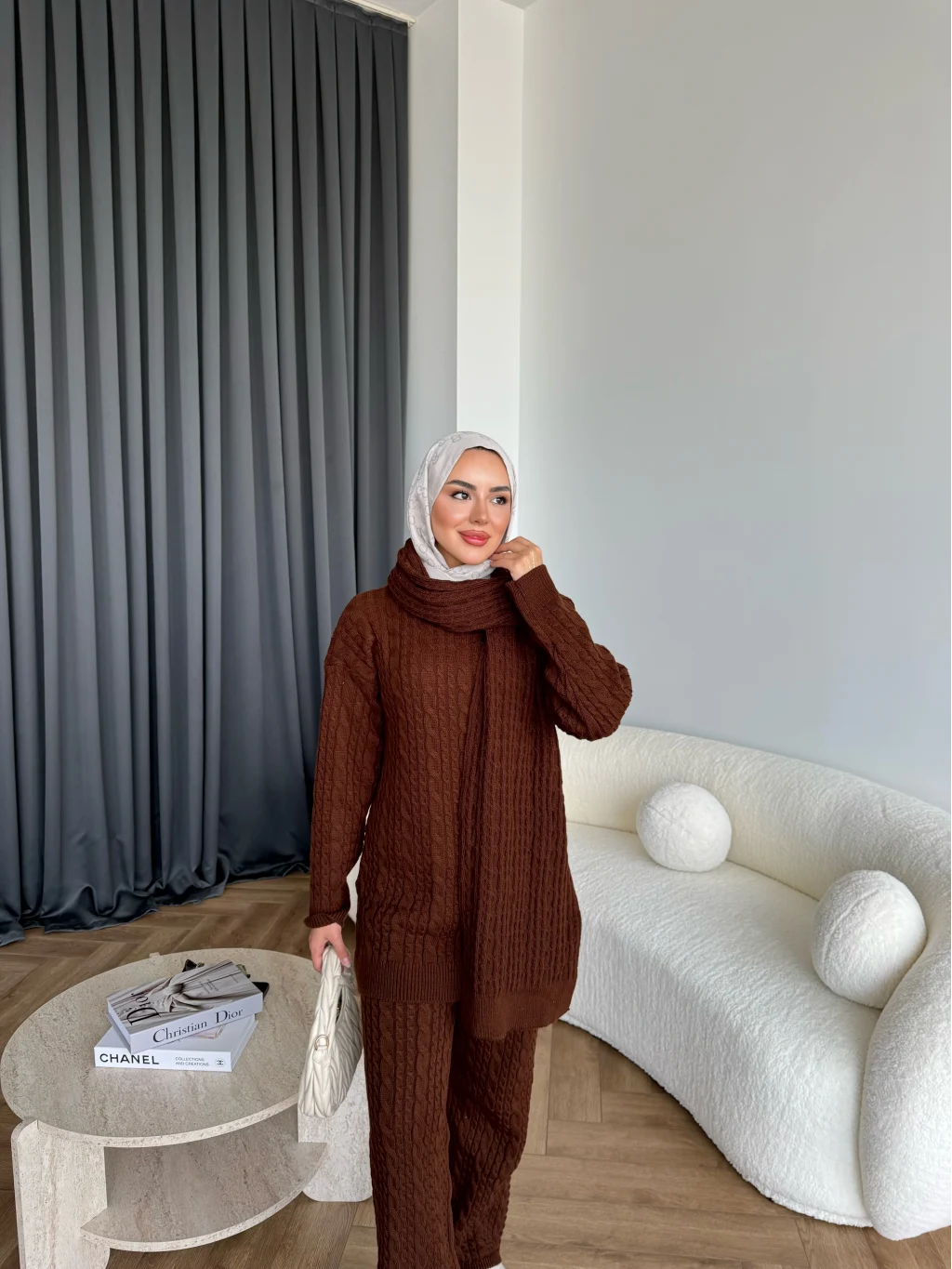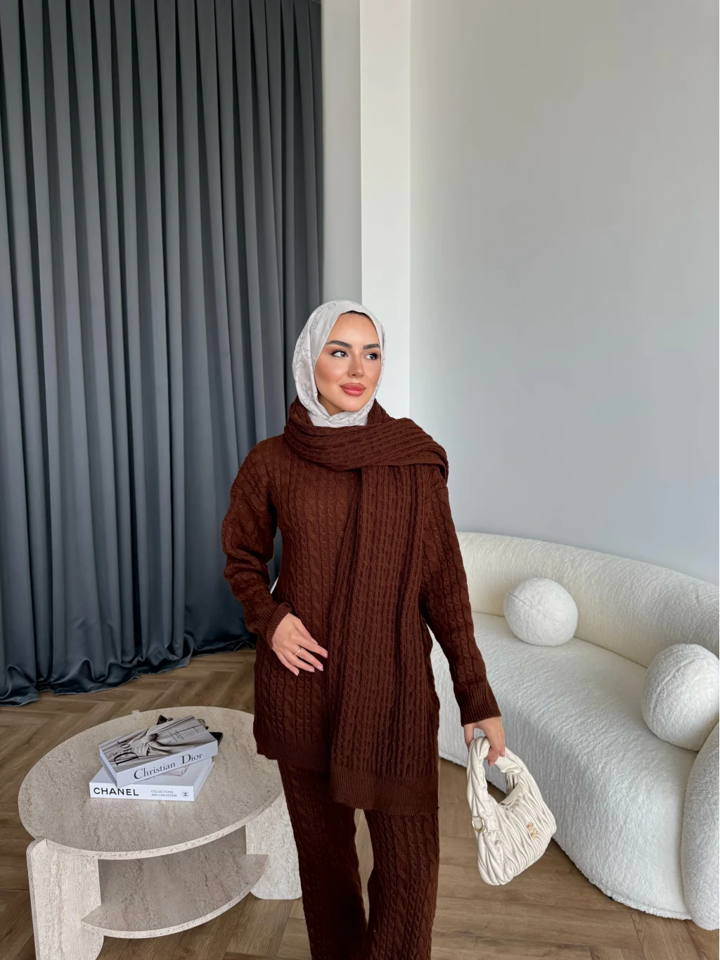 Örgü Atkı Detaylı Triko Takım - Acı Kahve