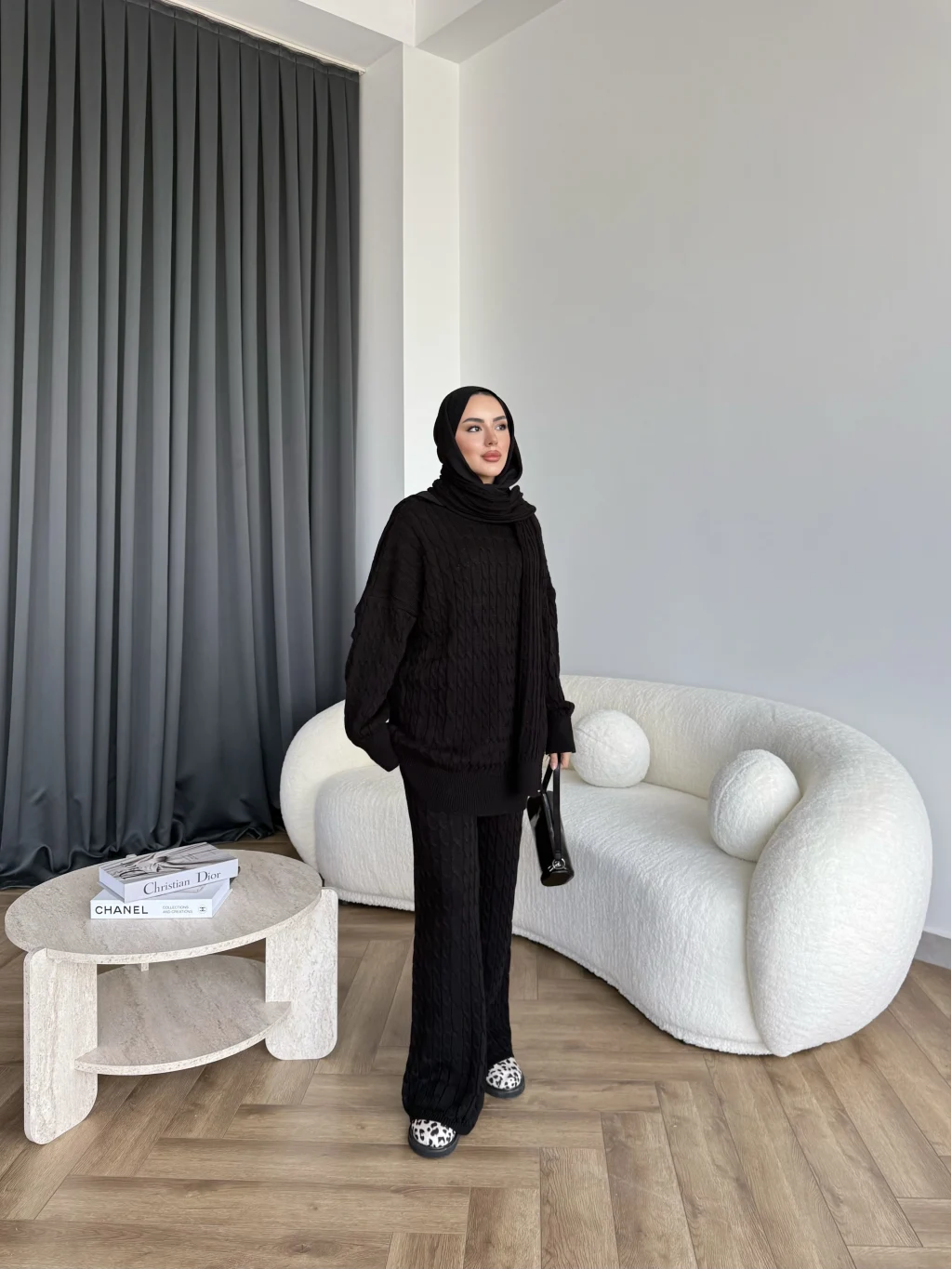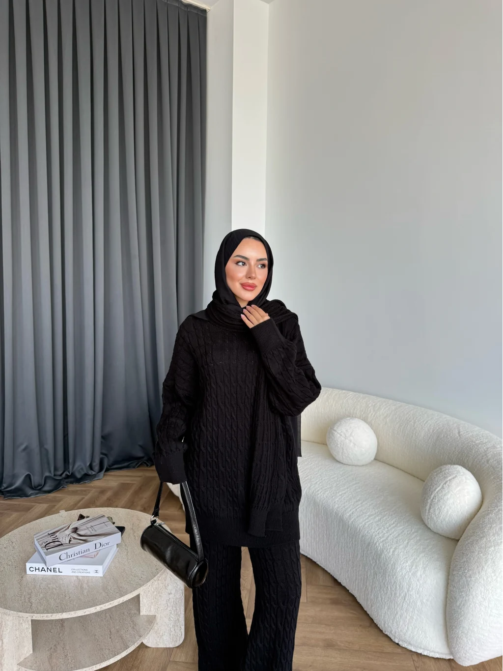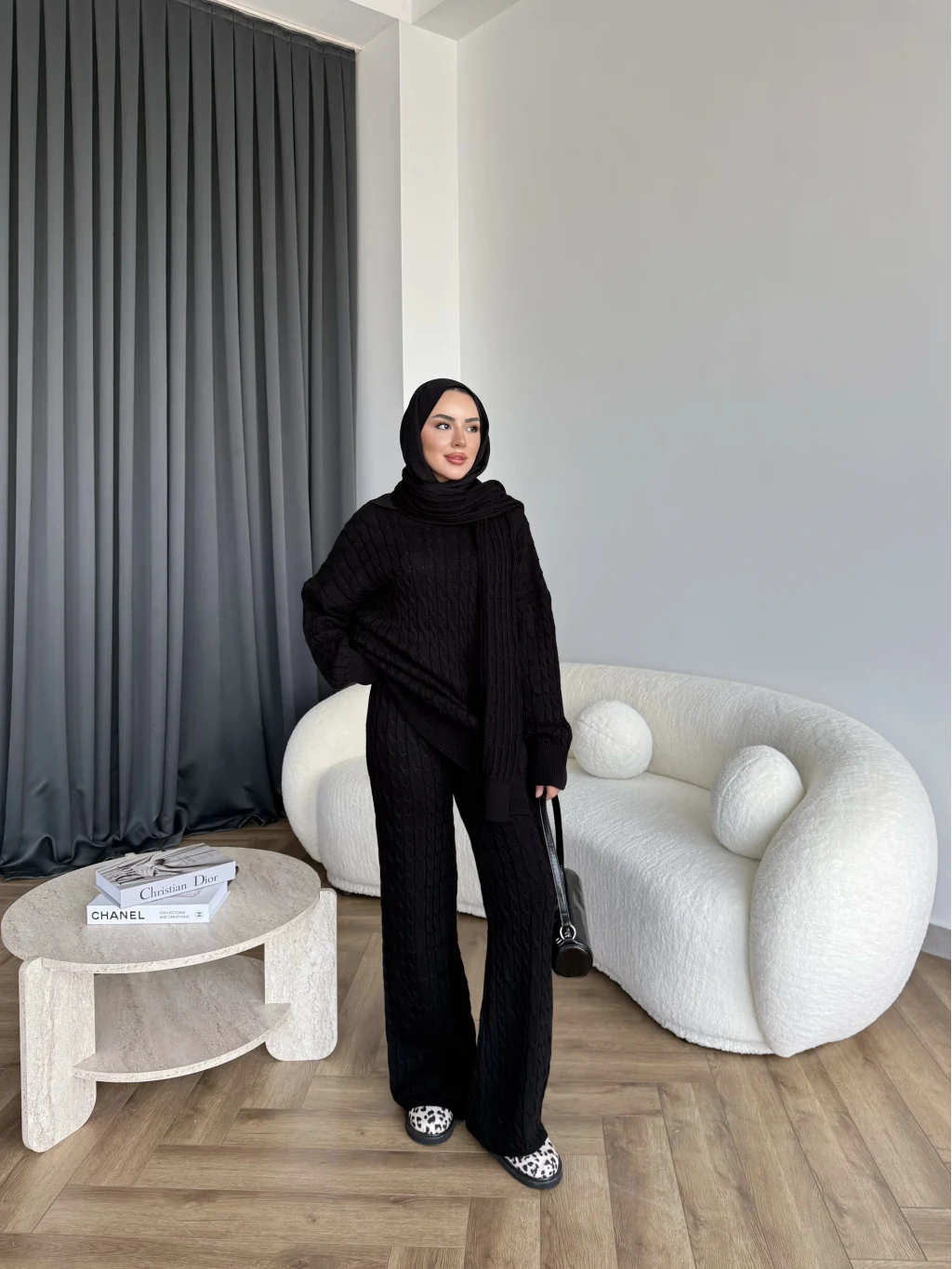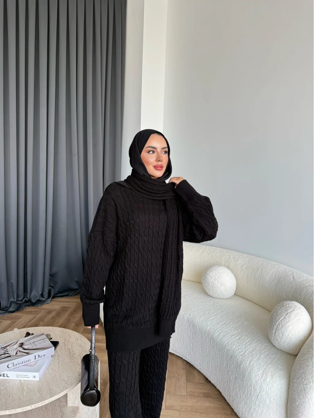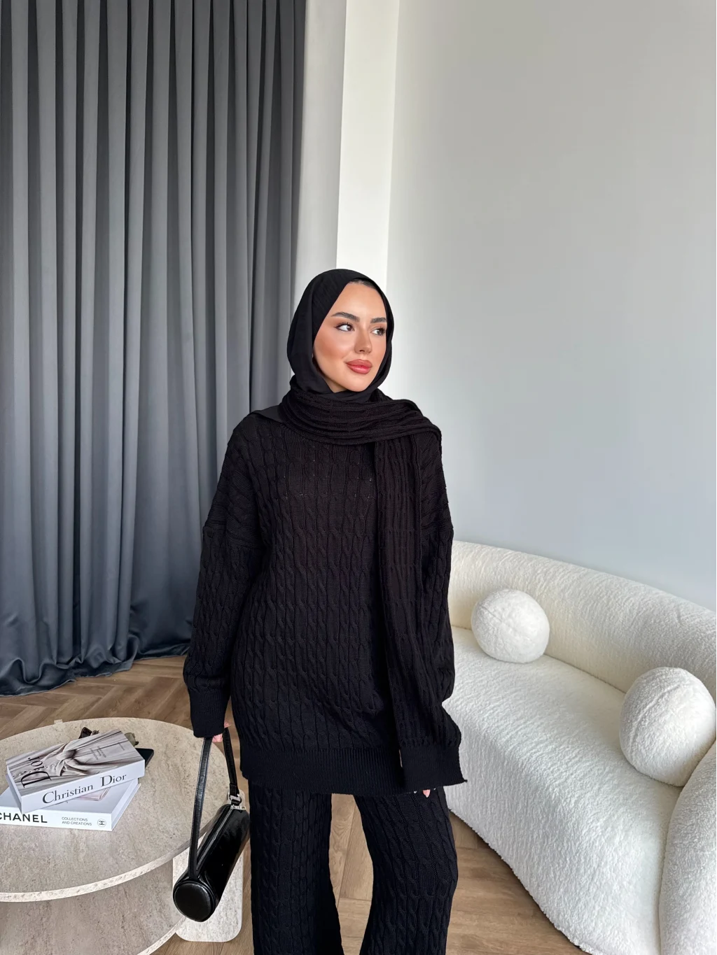 Örgü Atkı Detaylı Triko Takım - Siyah