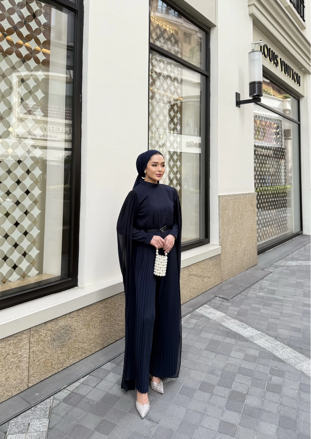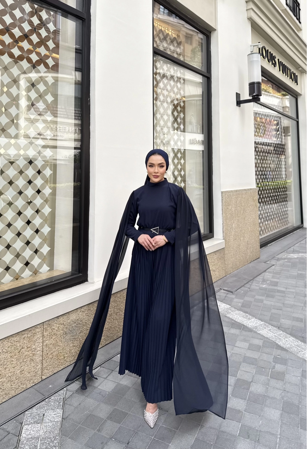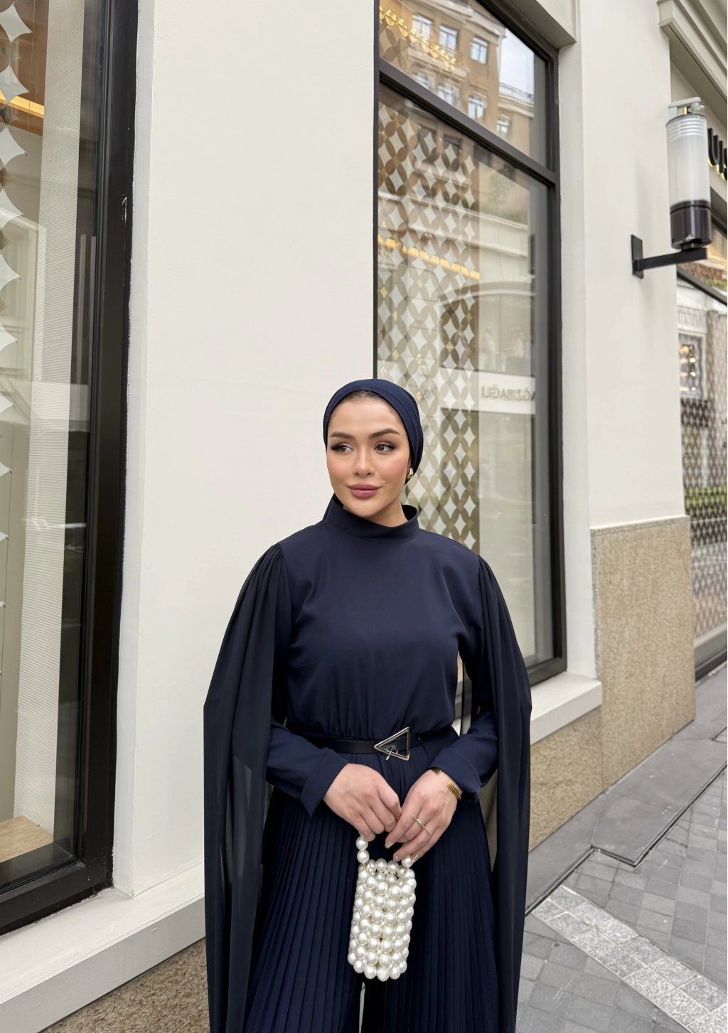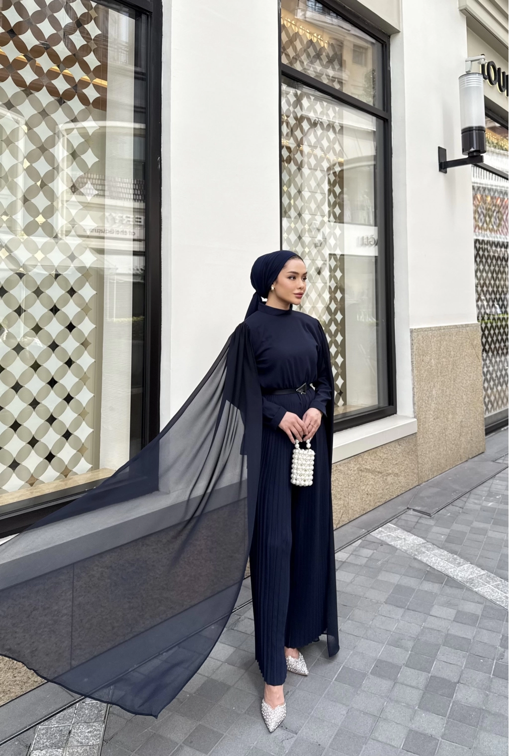 Yarım dik yaka , arkadan fermuarlı , beli lastikli , alt kısmı piliseli , seyyar kemerli , pelerin detaylı tulum .