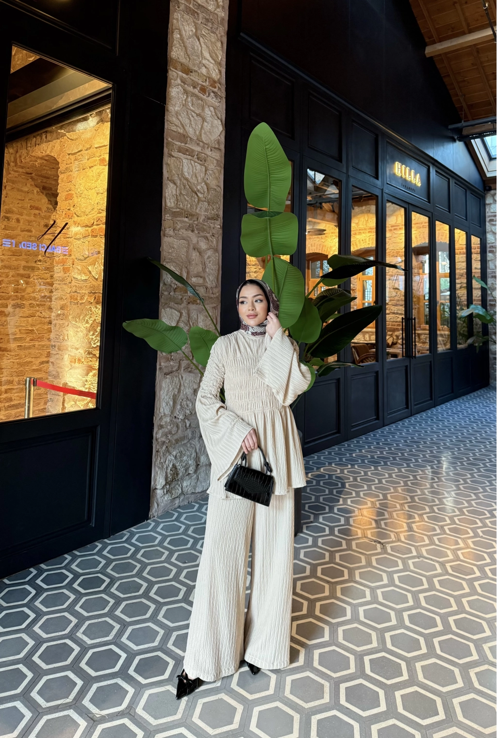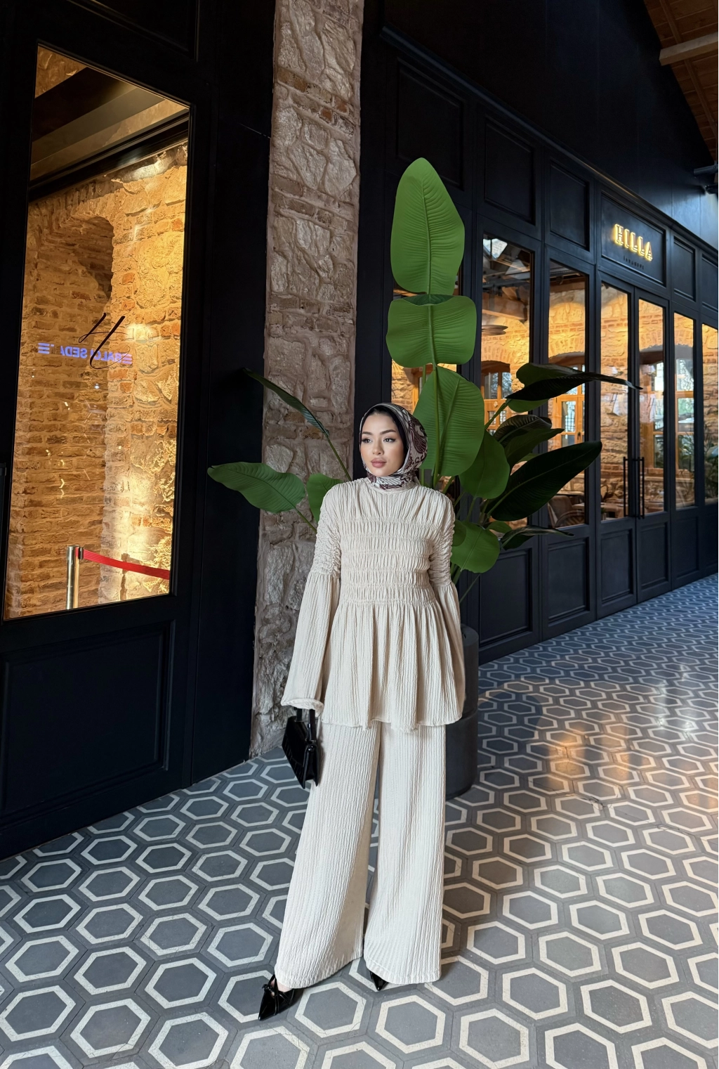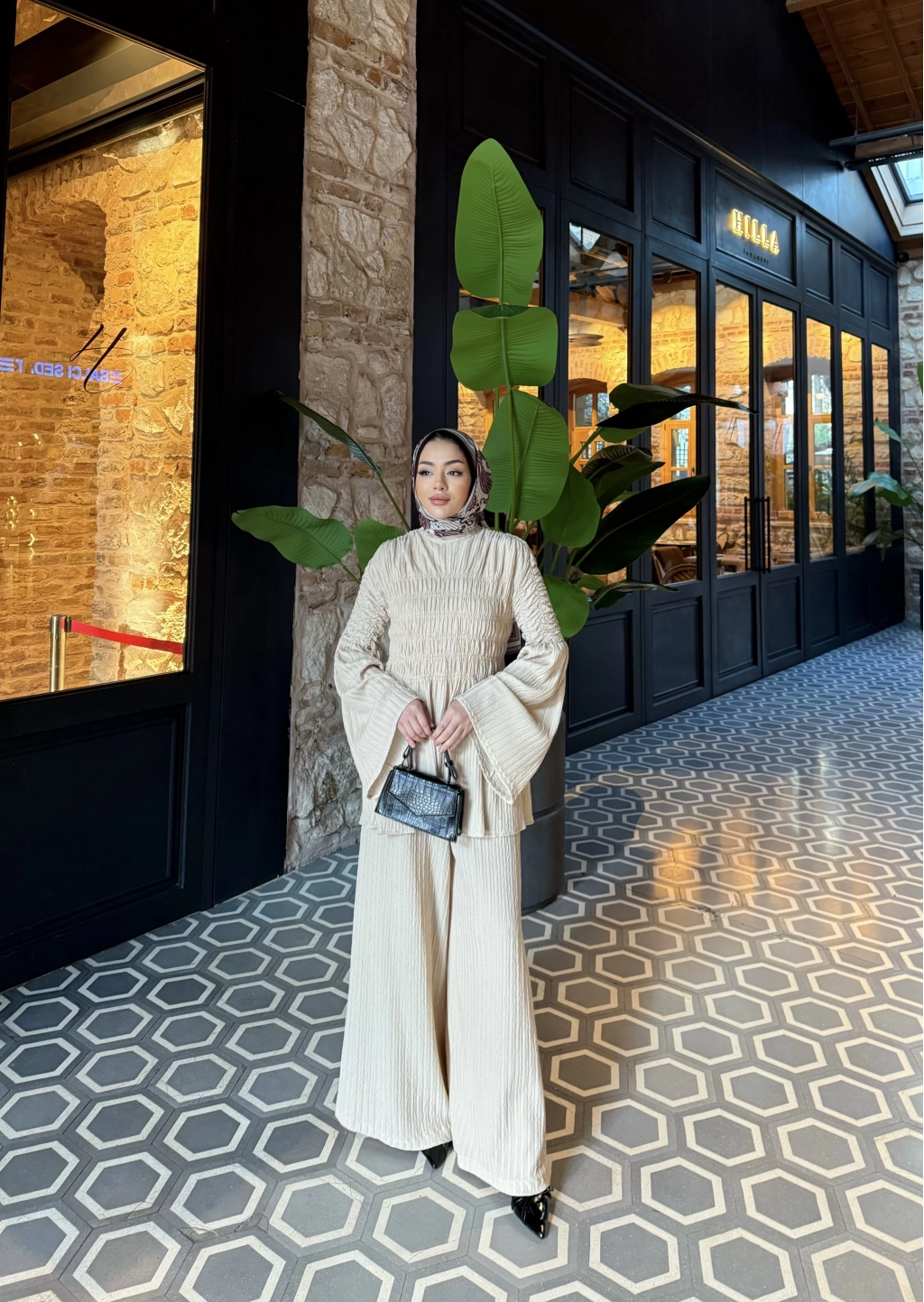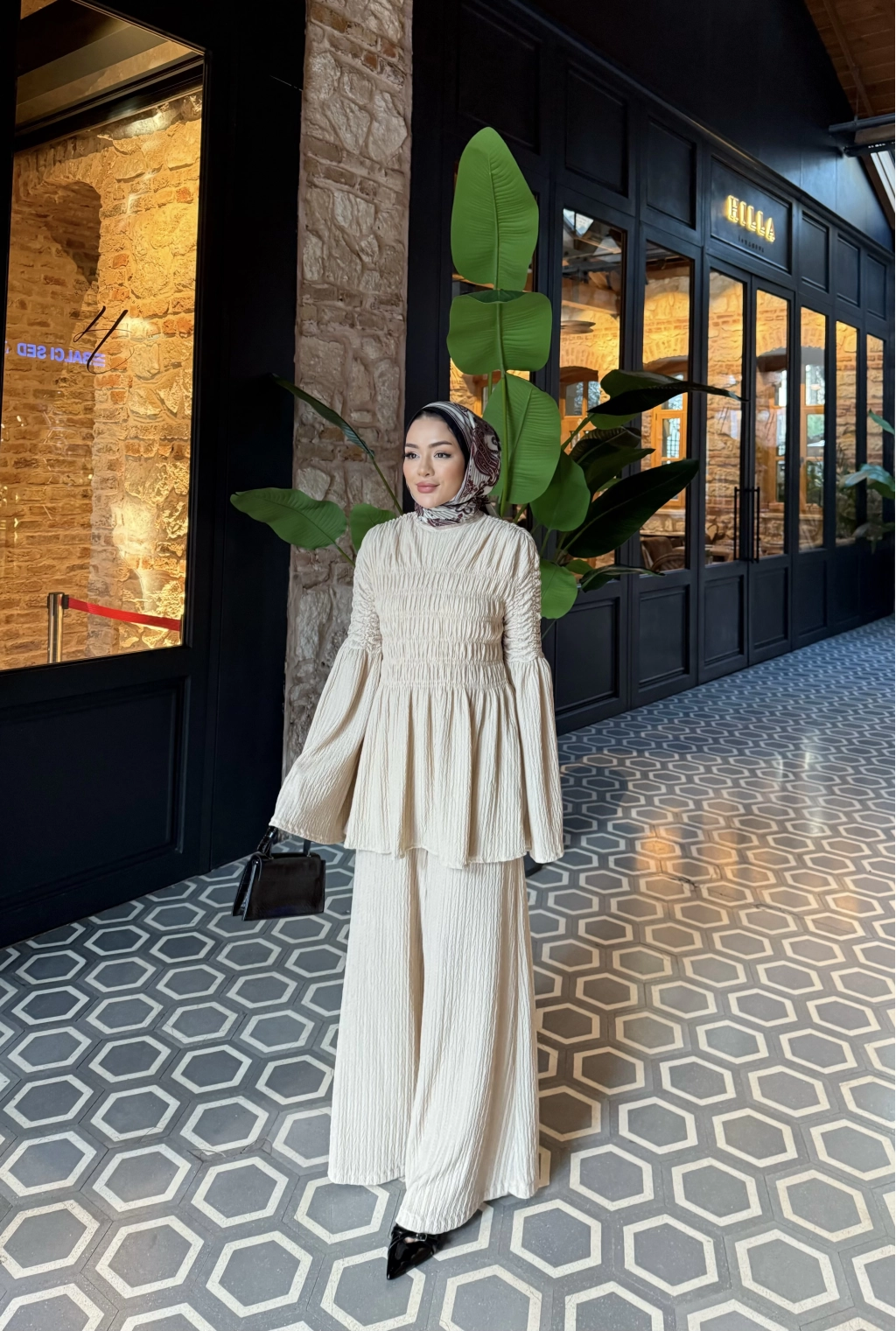 Piliseli Lastik Detay Takım - Bej