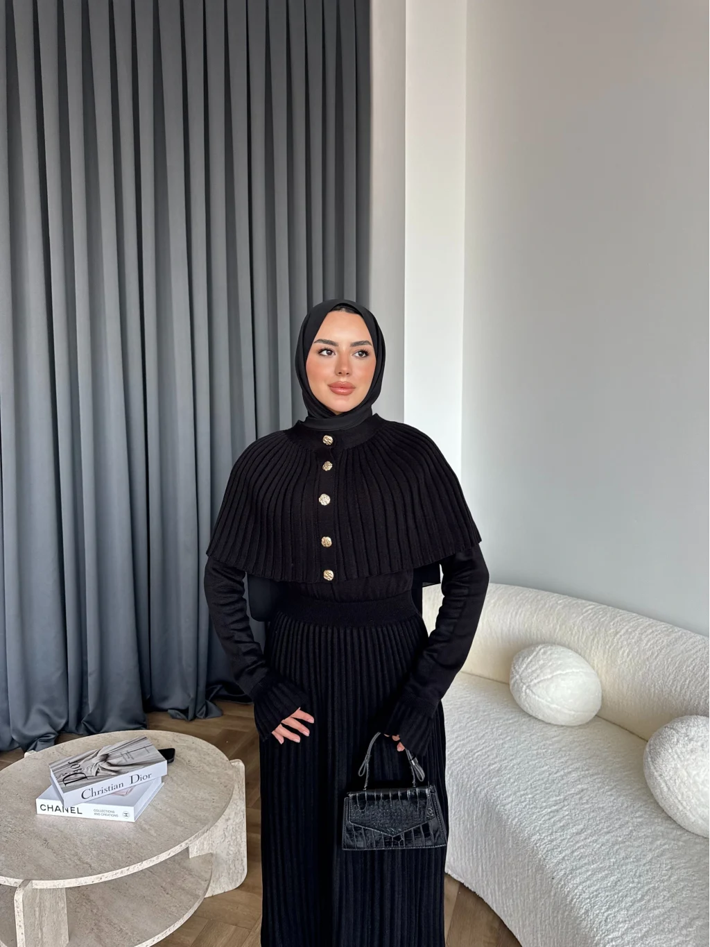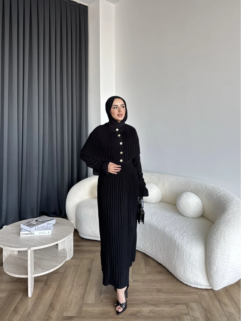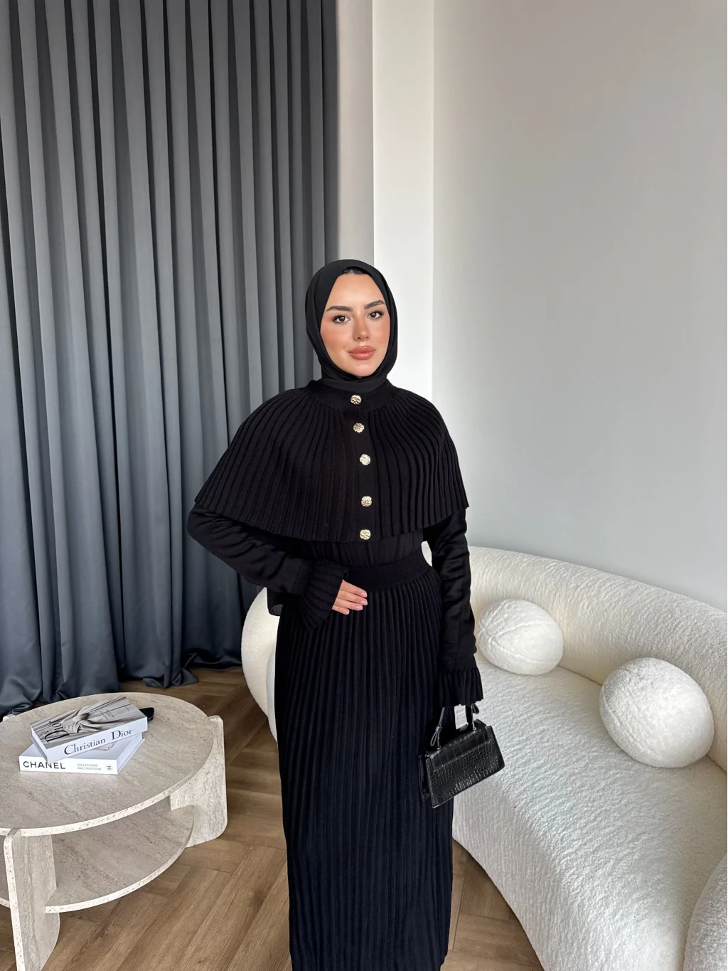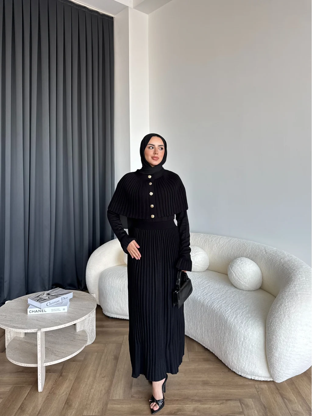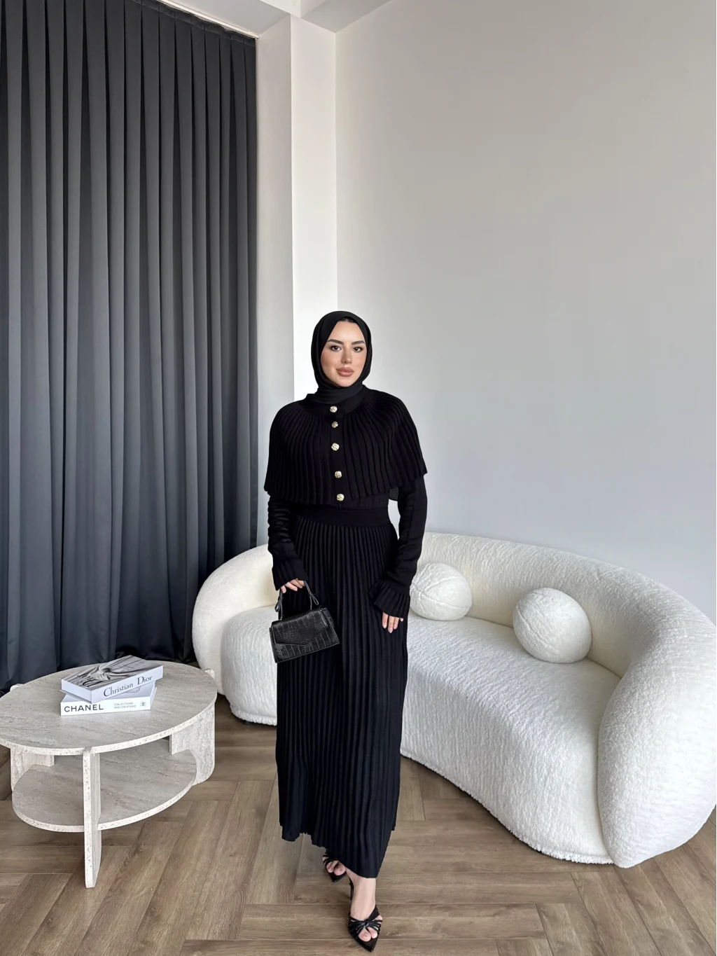 Piliseli Triko Elbise - Siyah