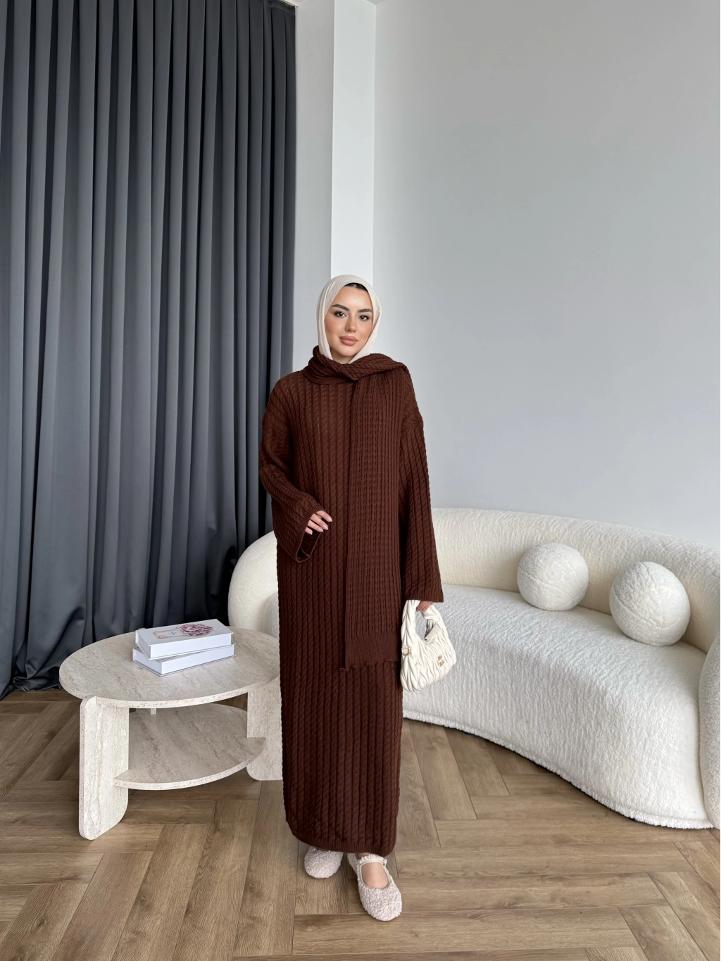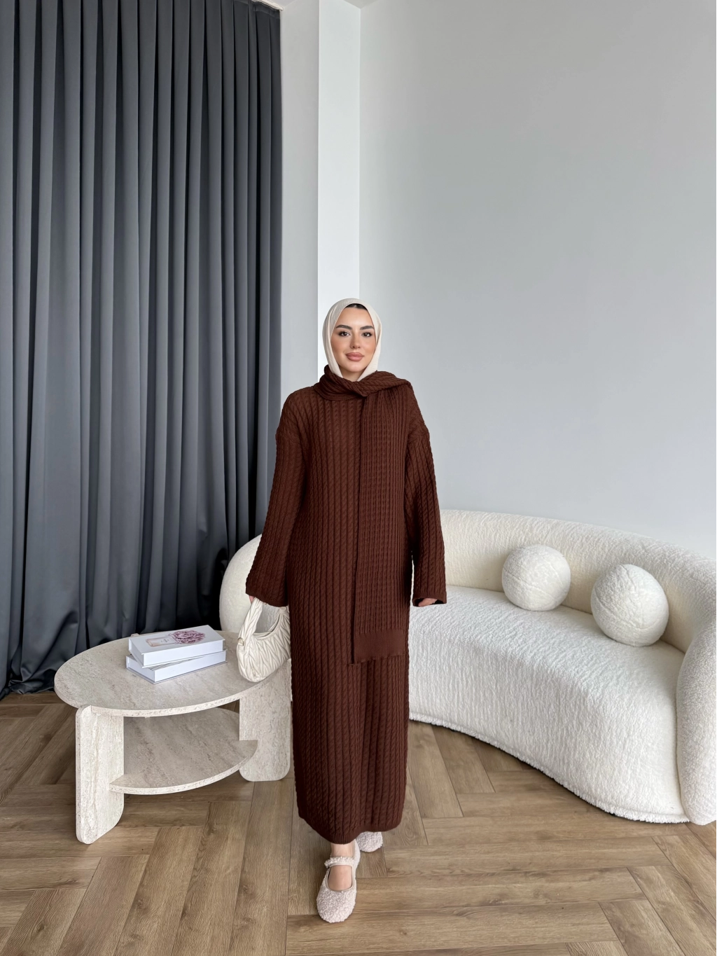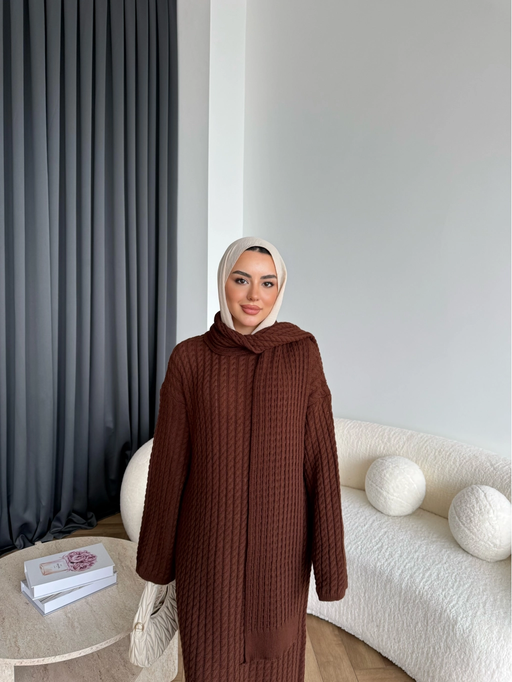 Pln-Atkı Örgü Triko Elbise - Acı Kahve