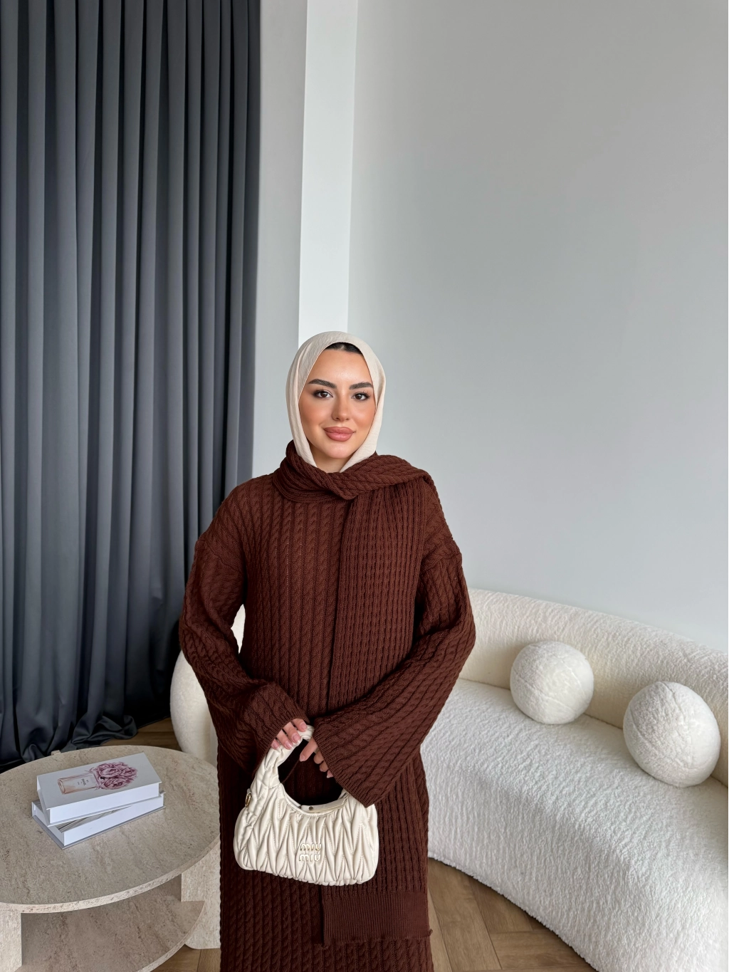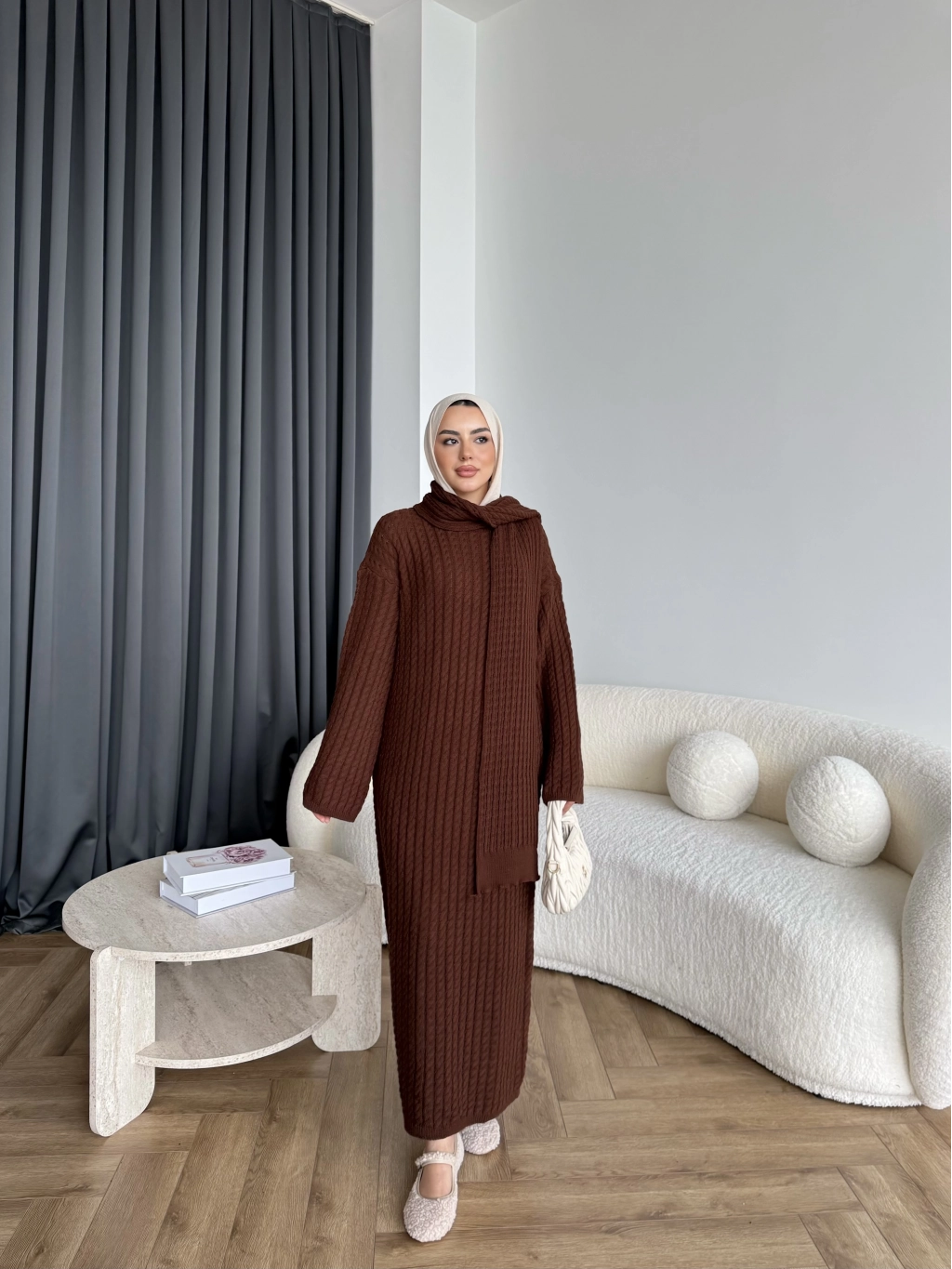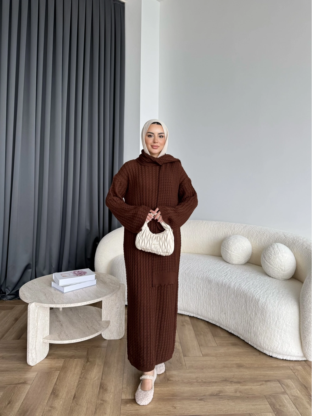 Pln-Atkı Örgü Triko Elbise - Acı Kahve
