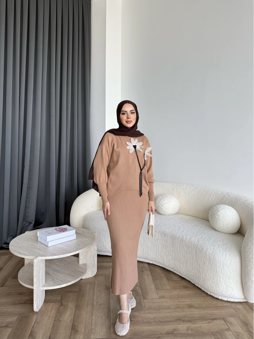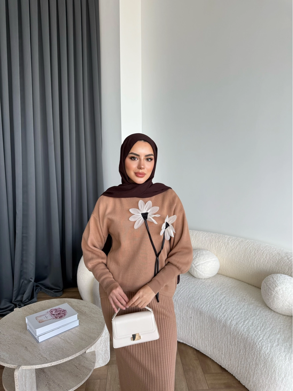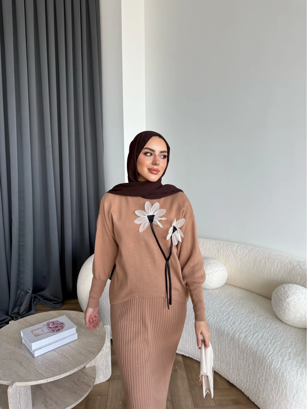 Pls-Çiçek Detay Jile Elbise - Camel